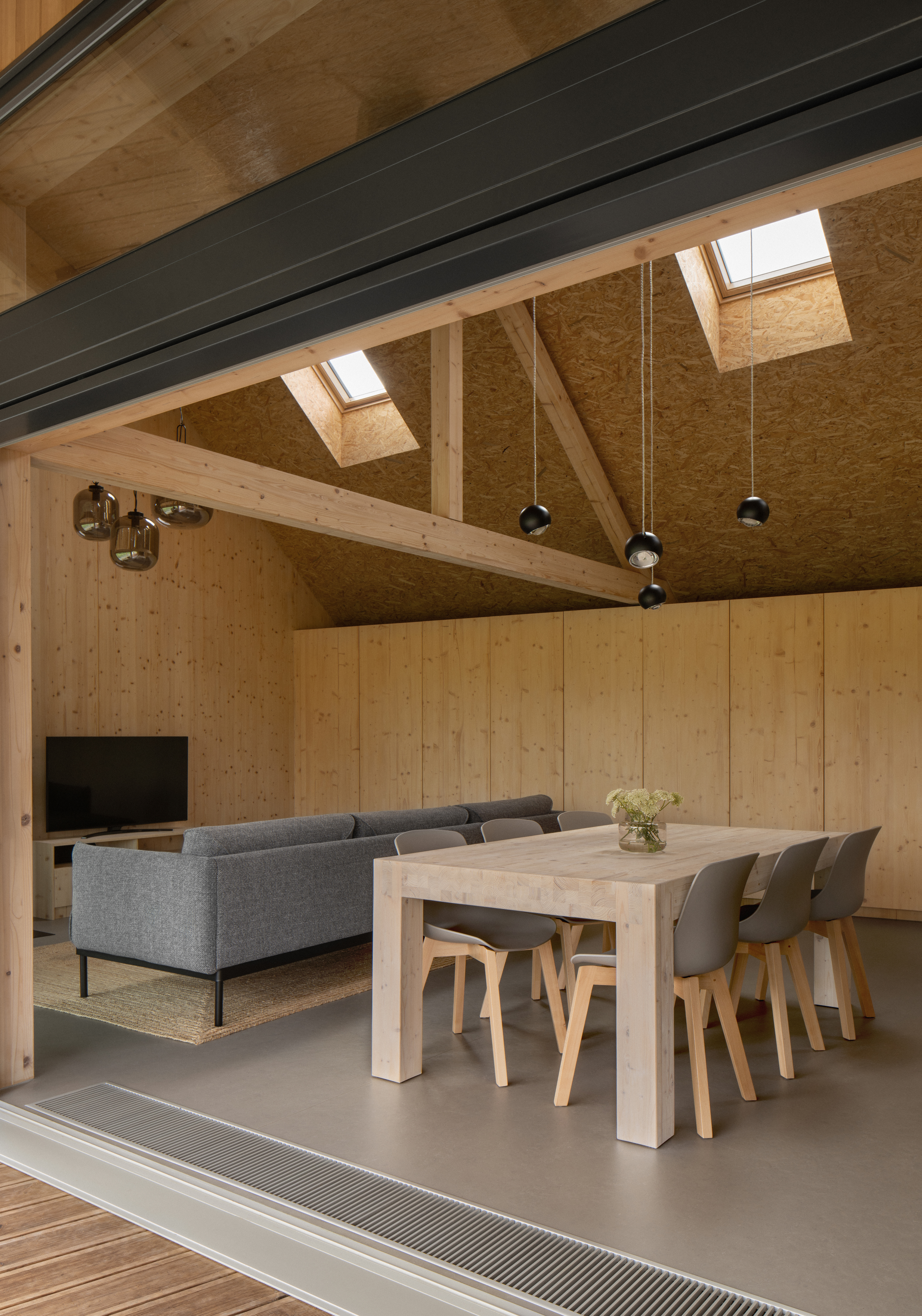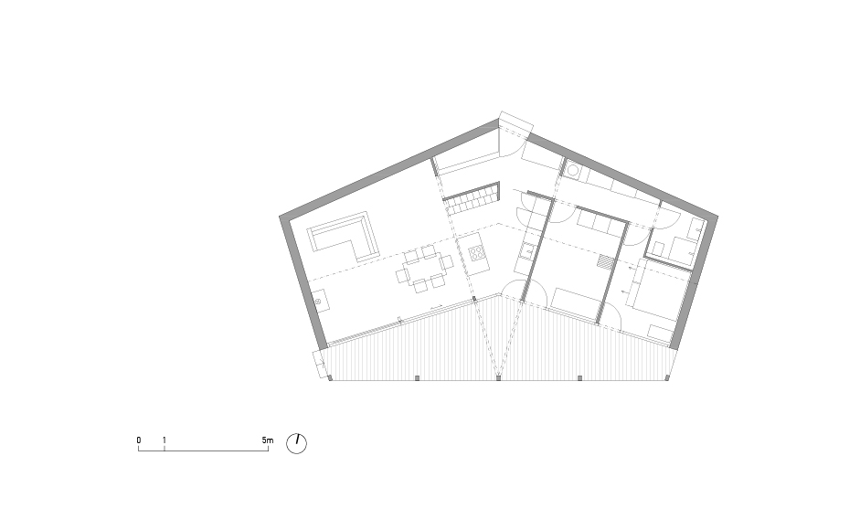 건축가는 지역 전통의 주택에서 영감을 받아 주말주택을 대지의 자연 속에 자연스럽게 녹아들 수 있도록 설계했다. 주택의 평면은 보헤미안 파라다이스 풍경을 최대한 담을 수 있도록 ‘V’형태가 되었다.