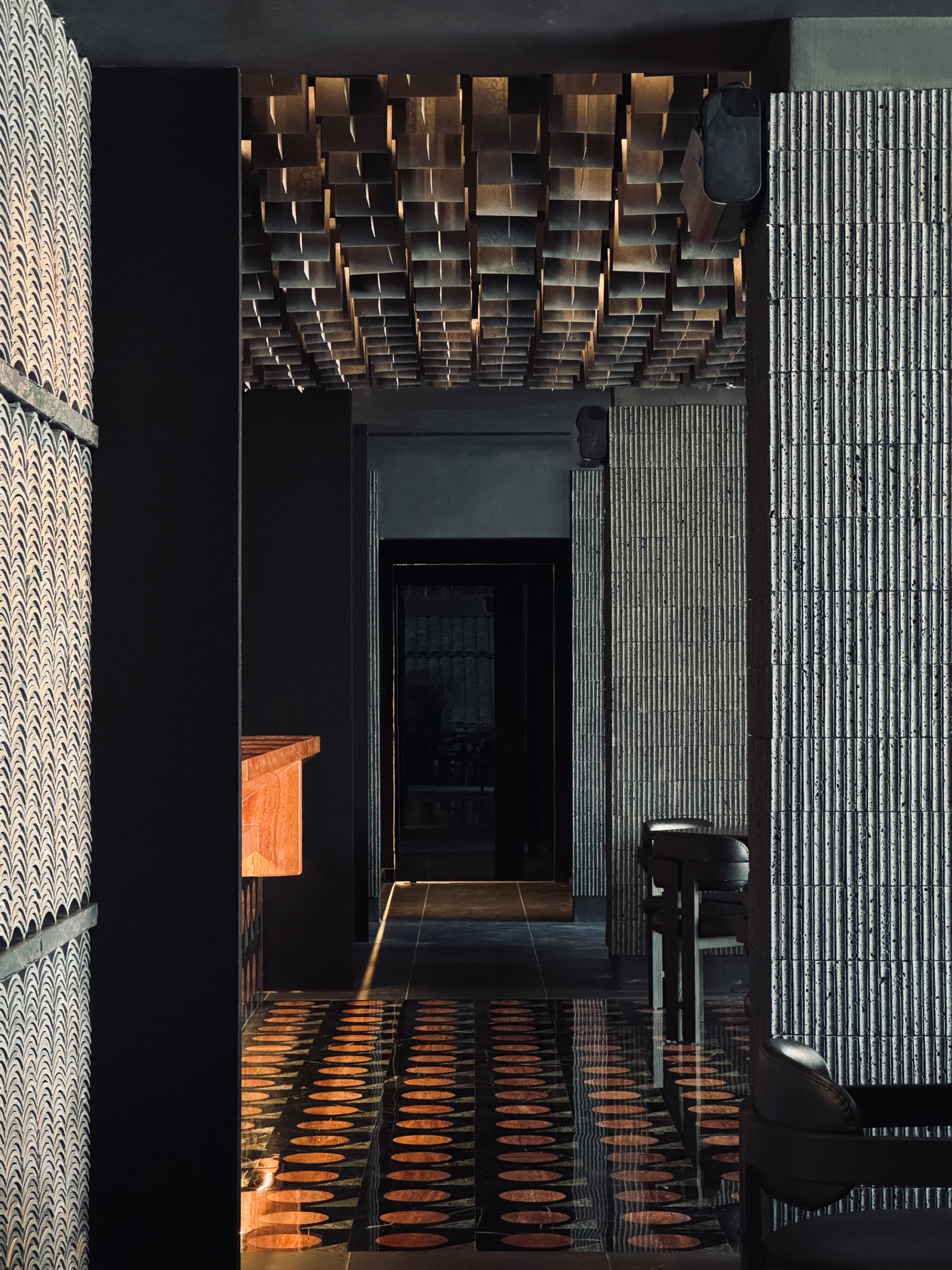 다이닝룸의 메인 디자인 요소는 천장 입니다. 다크룸에서 사진을 말리는 모습을 떠올릴 수 있도록 금속 장식들이 메달려 있는것이 특징입니다. 중앙 천장은 금속 물결 판넬로 마감했는데, 이 디자인 요소는 바(Bar)로 시선을 끌어들이는 중심적 역할을 합니다. 또한 해당 브랜드가 지향하는 '아시아 요리' 를 강조하기 위해 벽면을 재활용된 중국 전통 지붕 타일로 마감하고, 브랜드가 추구하는 색상(검정, 흰색, 빨강)을 사용했습니다. 천연 석재, 세라믹, 강철 등의 재료를 사용해 따뜻함, 차가움 그리고 중립의 이미지를 독특하게 조합하여 키묘나만의 공간적 매력을 더했습니다.