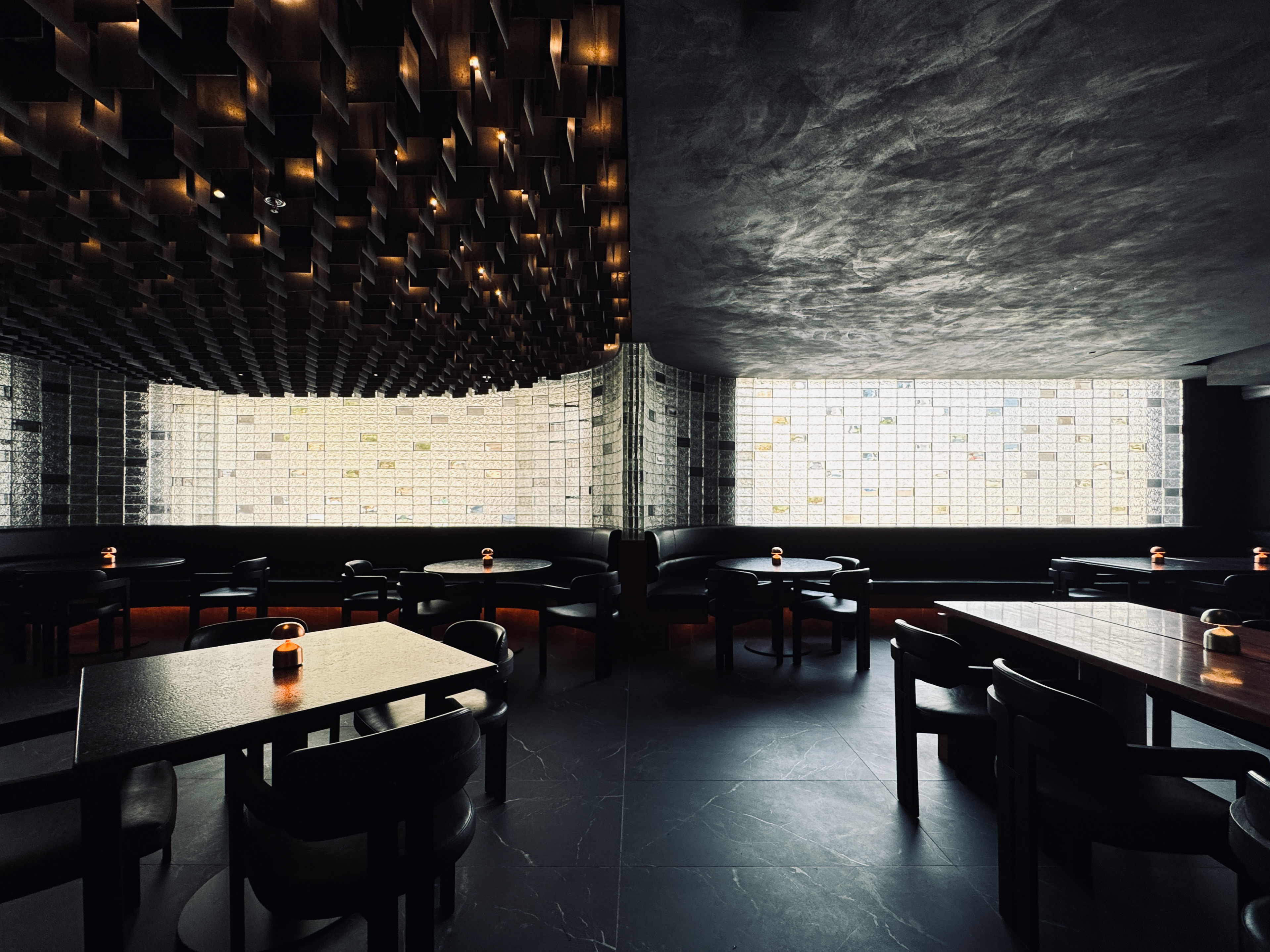 갤러리의 한 작품 뒤에는 비밀 통로가 있는데, 이 통로는 극적으로 메인 다이닝 홀의 이미지를 바꿉니다. 다이닝룸은 사진작가의 암실(darkroom)을 연상시키며 어두운 내부 인테리어와 은은한 조명이 특징입니다. 유리 블록으로 둘러싸인 이 공간은 외부로부터의 방해를 거의 받지 않고 내부 경험에 집중할 수 있도록 설계되었습니다. 거리에서 유리 블록을 통해 레스토랑의 내부 움직임을 관찰할 수 있습니다. 유리블록은 흐릿하게 빛과 그림자의 움직임을 보여주며 장소의 신비감을 더해줍니다.