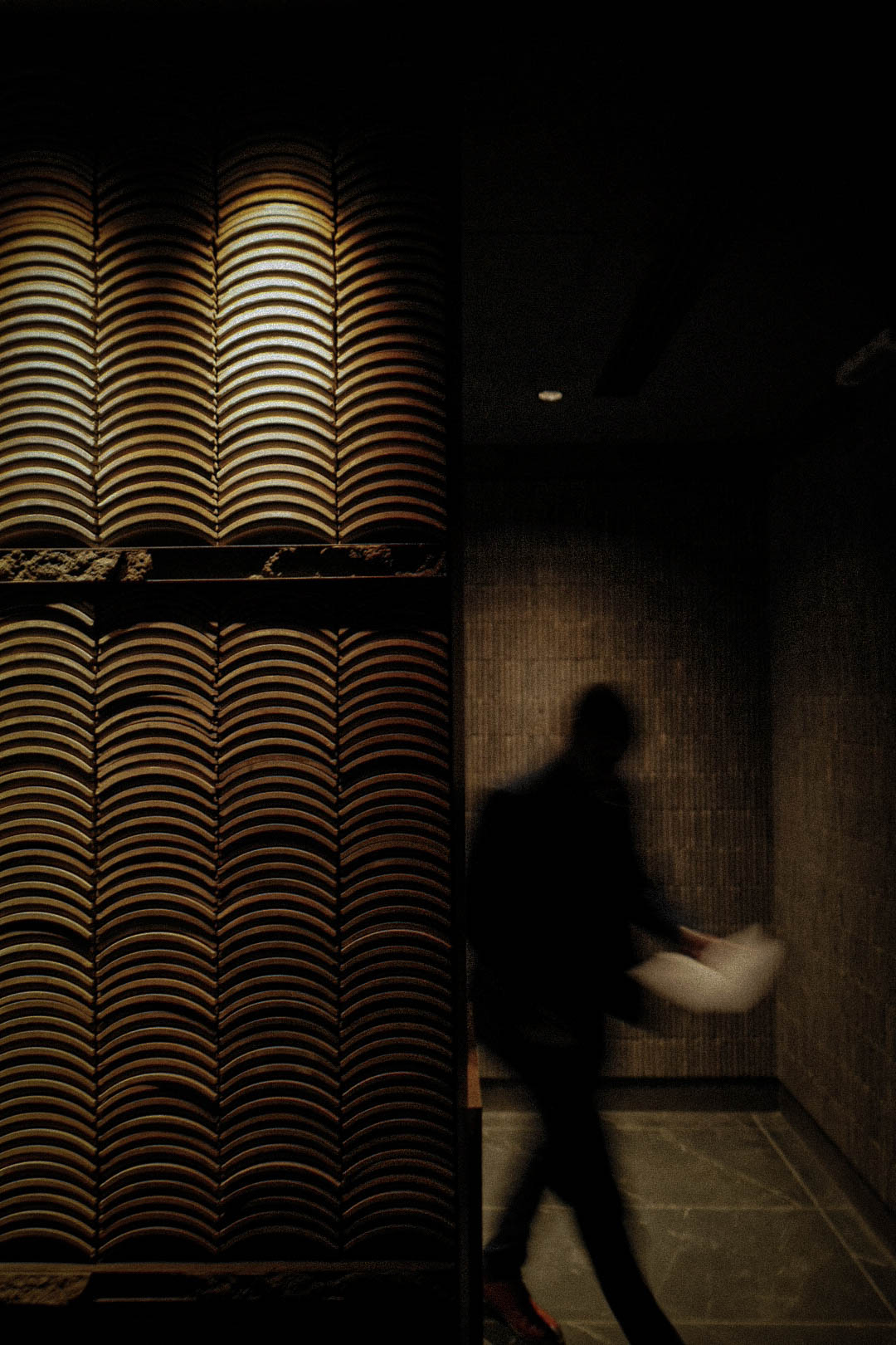 갤러리의 한 작품 뒤에는 비밀 통로가 있는데, 이 통로는 극적으로 메인 다이닝 홀의 이미지를 바꿉니다. 다이닝룸은 사진작가의 암실(darkroom)을 연상시키며 어두운 내부 인테리어와 은은한 조명이 특징입니다. 유리 블록으로 둘러싸인 이 공간은 외부로부터의 방해를 거의 받지 않고 내부 경험에 집중할 수 있도록 설계되었습니다. 거리에서 유리 블록을 통해 레스토랑의 내부 움직임을 관찰할 수 있습니다. 유리블록은 흐릿하게 빛과 그림자의 움직임을 보여주며 장소의 신비감을 더해줍니다.