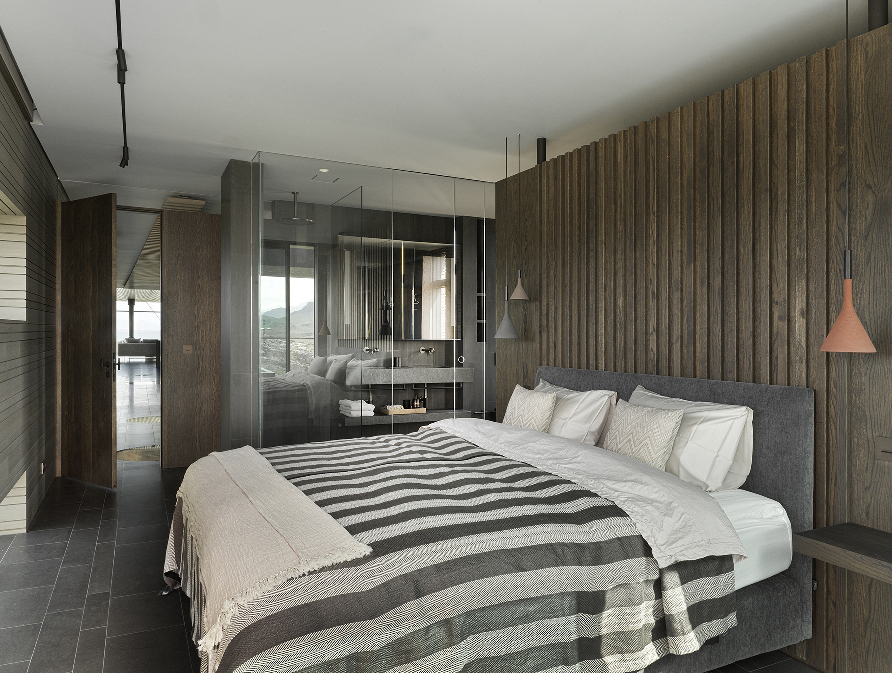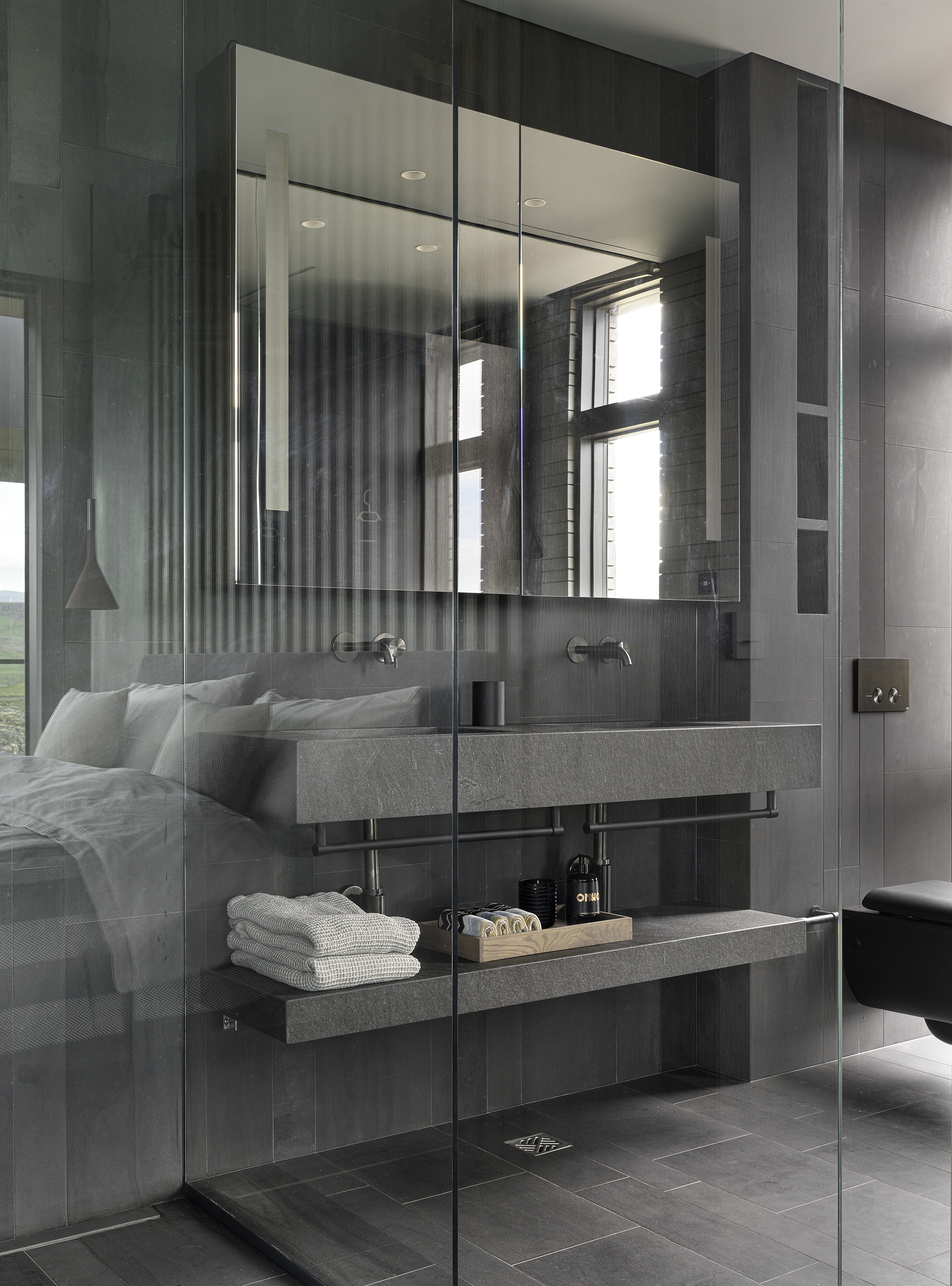 바닥과 욕실 벽은 아이슬란드의 블루스톤으로 마감했습니다. 내부에서는 Kebony Clear 목재 사이딩이 몇 년 후 회색빛으로 변하는것을 고려해 사전 처리된 베니어 코팅 소나무를 마감재로 사용했습니다.