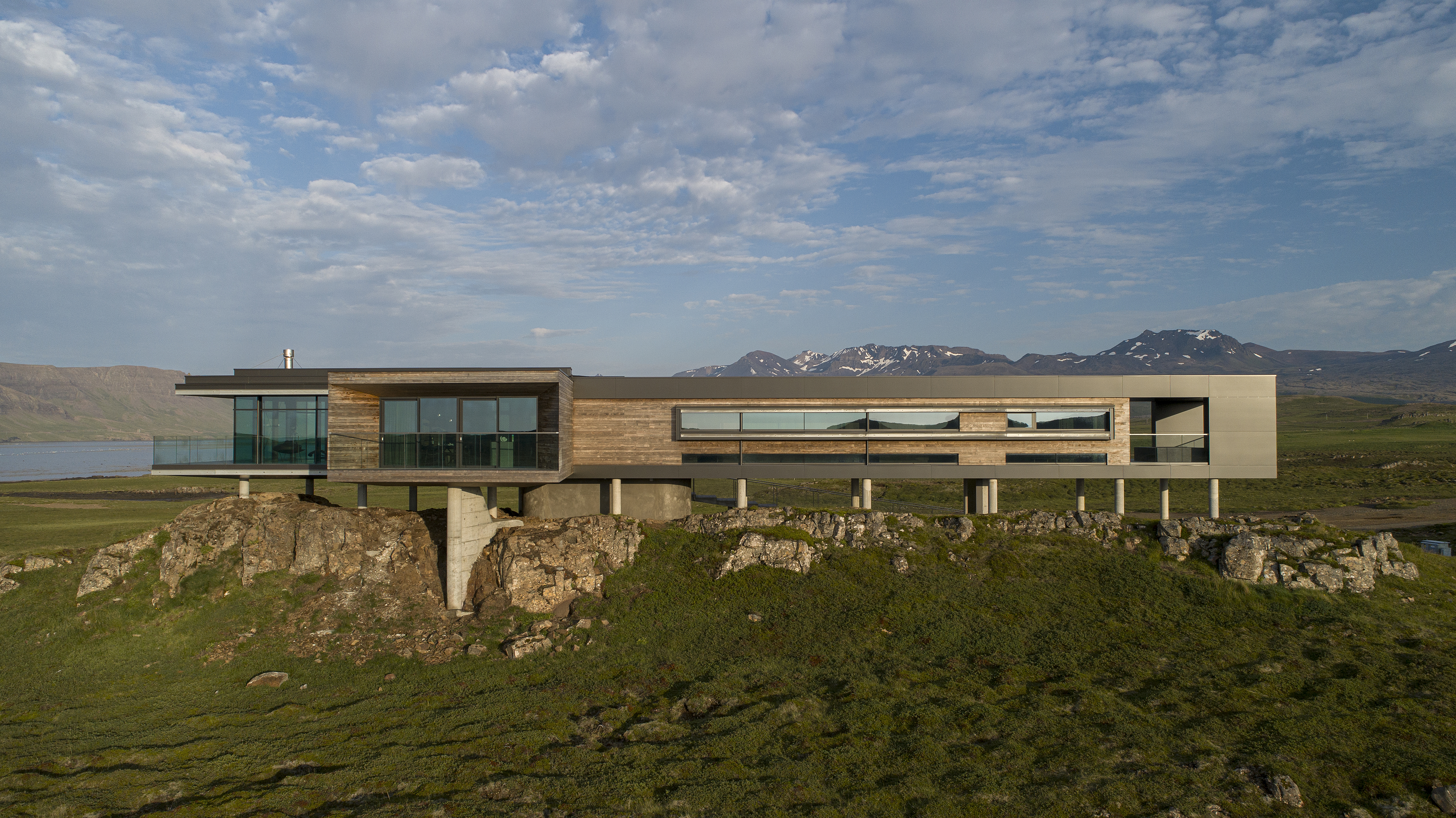 아이슬란드 서부 Stykkishólmur에서 남쪽으로 10분 거리에 있는 이 주택은 주변 산맥의 독특한 형태와 자연 경관에서 영감을 받아 디자인되었습니다. 모든 방향으로 펼쳐지는 자연경관은 전망에 따라 다른 풍경을 보여주었습니다. 장소를 방문했을 때 독수리 깃털을 발견하며 집의 개념에 대한 영감을 얻게 되었습니다.