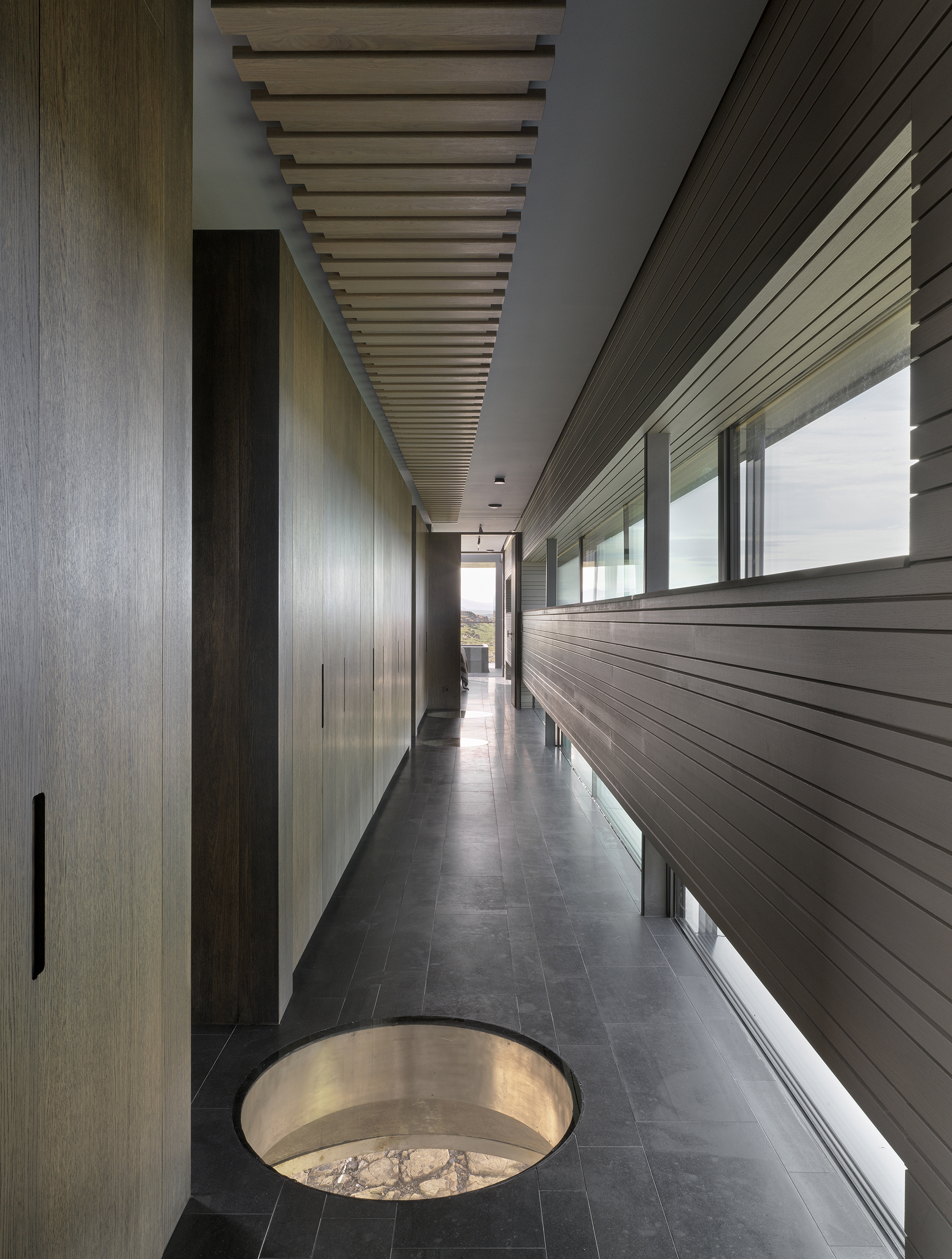 침실로 이어지는 복도에는 둥근 바닥 창 4개가 있어 지나갈 때 지면과 시각적으로 연결되는 것을 느낄 수 있고, 긴 베이 창은 북쪽의 작은 숲과의 연결을 강조하는 역할을 하고 있습니다.