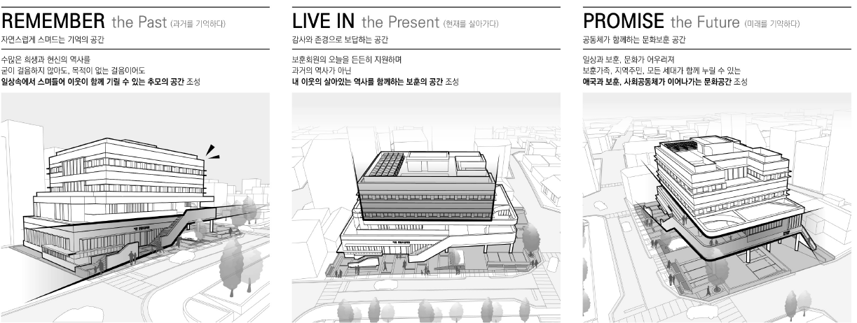 통합보훈회관의 아이덴티티를 위하여 과거, 현재, 미래가 쌓인 시간의 층위를 기본 컨셉으로 담아내고자 하였다. 각 시설의 이용군을 파악하여 명확한 층별 조닝을 하고 주민 공동영역을 버퍼존으로 하여 각각의 주 영역이 분리되어 보일 수 있게 하였다. 기억/ 세월/ 희생정신이 세대를 거듭할수록 쌓이고 쌓여감을 수평적 요소를 통해 표현되어지도록 하였고, 재료 질감을 통해 수평/ 수직성을 반복적으로 적층함으로써 다양한 세월의 흔적이 쌓여감을 표현하고자 하였다. 진입마당에서 2층으로 연결된 외부 수직동선은 세월의 흔적을 관통하여 자연스럽게 흘러 들어감을 표현하고자 하였다. 대지 진입 마당에 시설이용객/ 지역주민들의 추모와 치유를 위한 공간을 계획하고 주민개방영역 내에 추모관을 배치하여 기억의 벽-기억의 마당-자유의 계단-추모기념관으로 이어지는 문화와 교류가 함께하는 보훈공간을 계획하였다. 또한 다목적강당, 회의실의 가변적 공간계획 및 내외부 확장공간을 통하여 다양한 상황에 따라 시민들과 이용자들의 다목적 활용이 가능하도록 유연한 공간계획을 하고자 하였다.