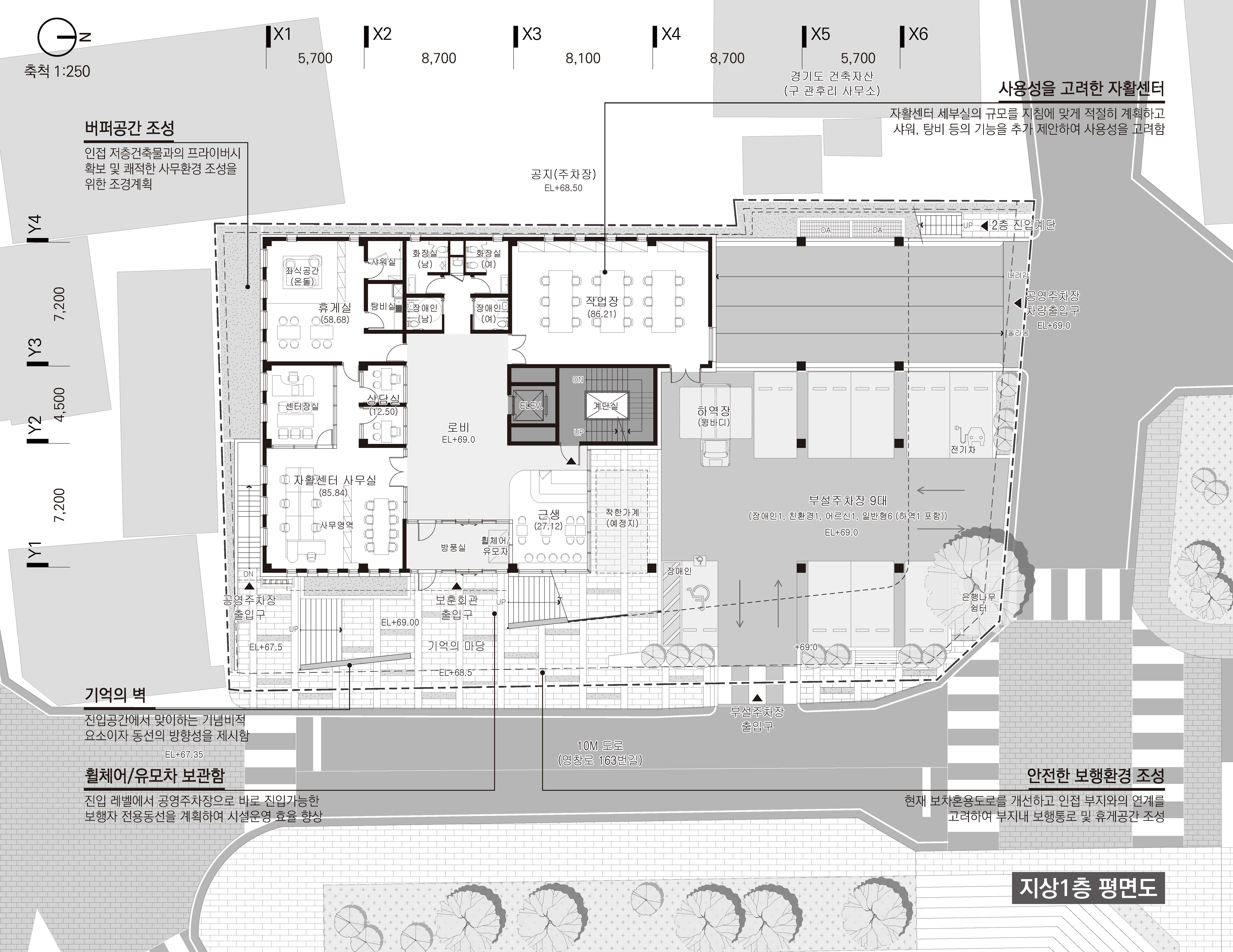 대지는 이천의 구 도심지에 위치하며 창전동 행정복지센터 예정지와 10M 도로를 마주하고 있으며, 대상지에 담아 내어야 할 프로그램은 보훈센터(노유지시설, 자활센터)와 공영주차장으로 이용자와 차량(부설주차장 및 공영주차장)의 안전한 보차분리를 우선으로 했다. 동측 10M 도로와 면하여 진입광장을 형성, 남측에서의 대중교통을 이용한 보행자와 횡단보도에서의 보행흐름을 유입하도록 하였으며 대지 내 북측에 부설주차장과 공영주차장의 진입동선을 계획하여 안전한 보차환경을 조성하고자 하였다.