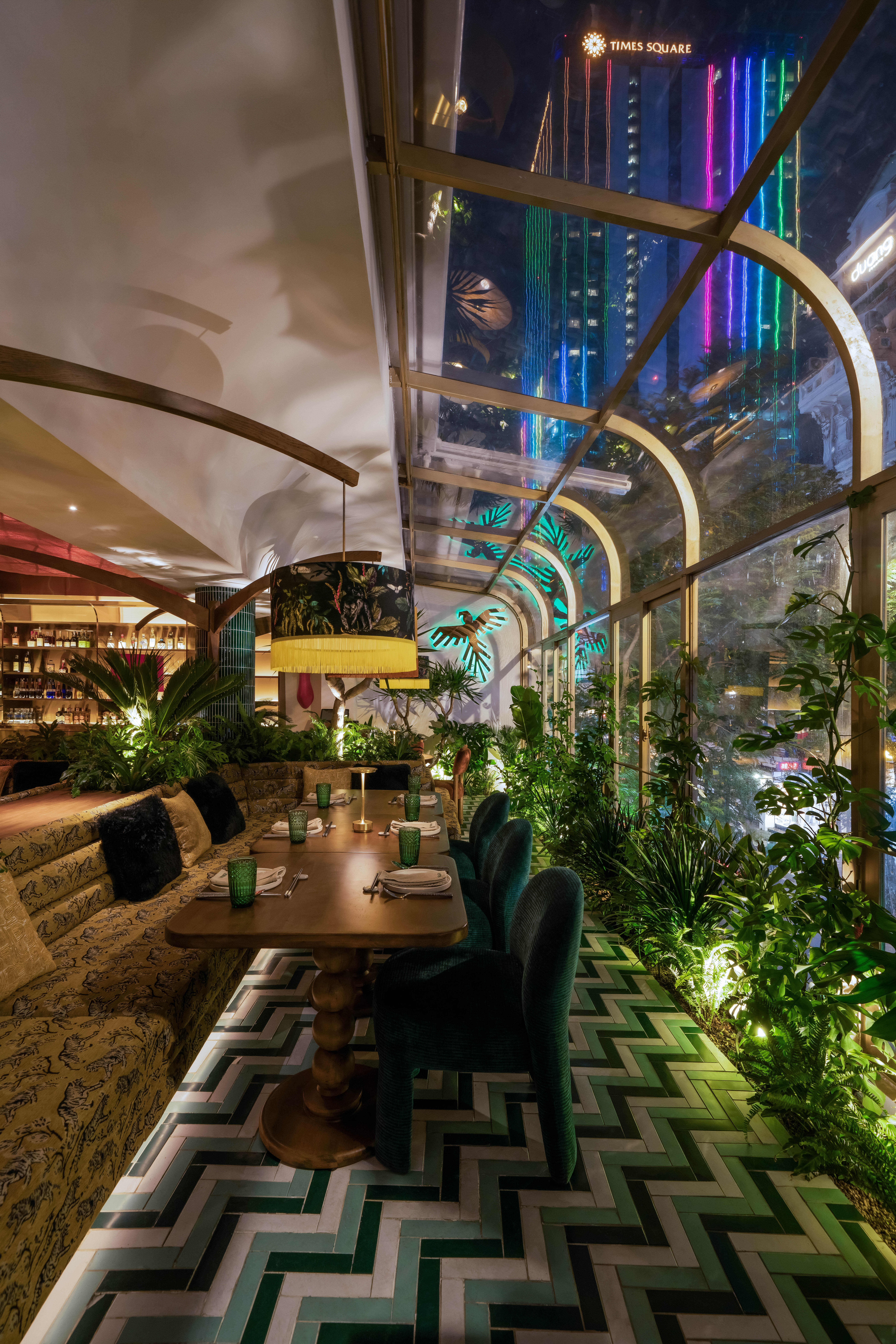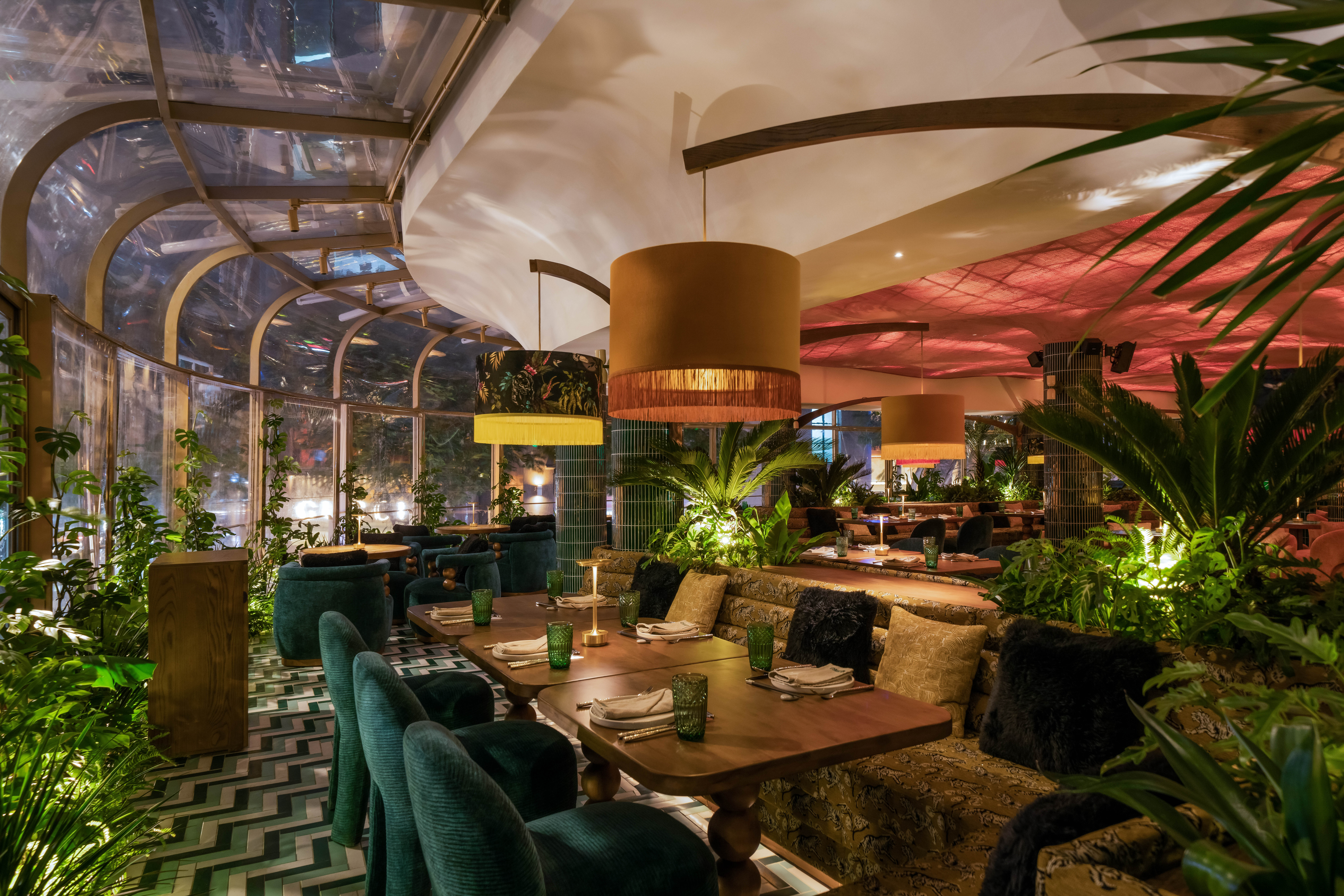 공간 전반에 식물이 배치되어 있는데, 이 식물들은 대담한 디자인 요소들과 상반되어 고요한 휴식 공간을 만들어줍니다. 결론적으로, 이 레스토랑-클럽은 생동감 넘치는 타일, 예술적인 천장, 풍부한 패브릭, 자연 요소를 조화롭게 결합한 디자인의 축제와도 같습니다. 이는 니키 요리의 본질을 반영하는 독특하고 몰입감 있는 다이닝 환경을 제공하며 손님들이 시각적으로 즐거우면서 편안한 공간을 누릴 수 있도록 합니다.