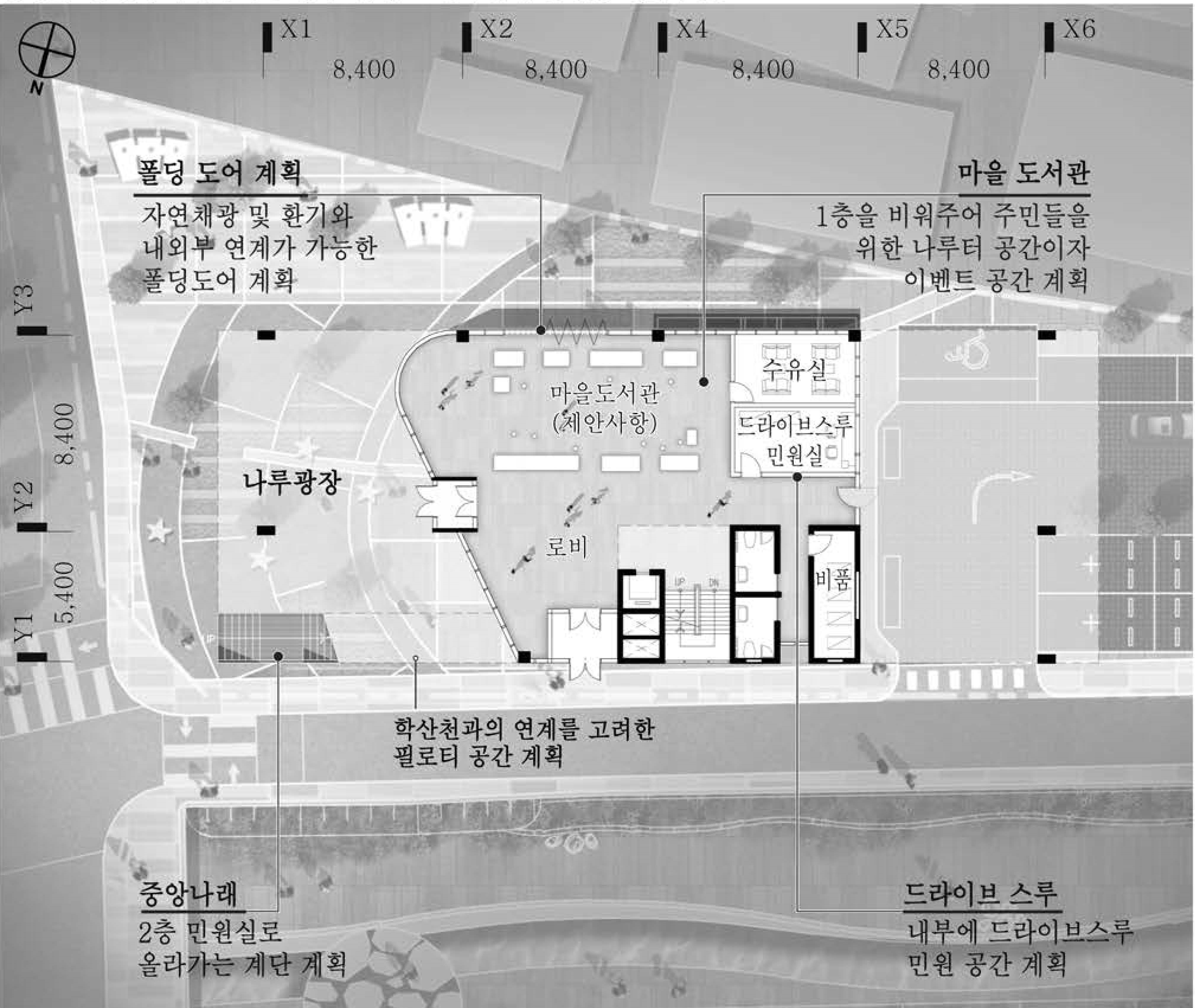 [중앙나래]는 다양한 주민을 수용하는 공간입니다. 1층 필로티 하부에 진입광장을 조성하여 동선을 유입하고 마을 주민들에게 열린 휴식공간을 내어주며, 광장과 연계하여 다목적공간으로 활용되는 마을 도서관을 계획했습니다. 2층에 민원실을 배치하고 입체적인 진출입로이자 이벤트광장인 ‘중앙나래’ 계단을 제안하여 내외부 프로그램이 유기적으로 연결되는 공공공간을 구현했습니다.