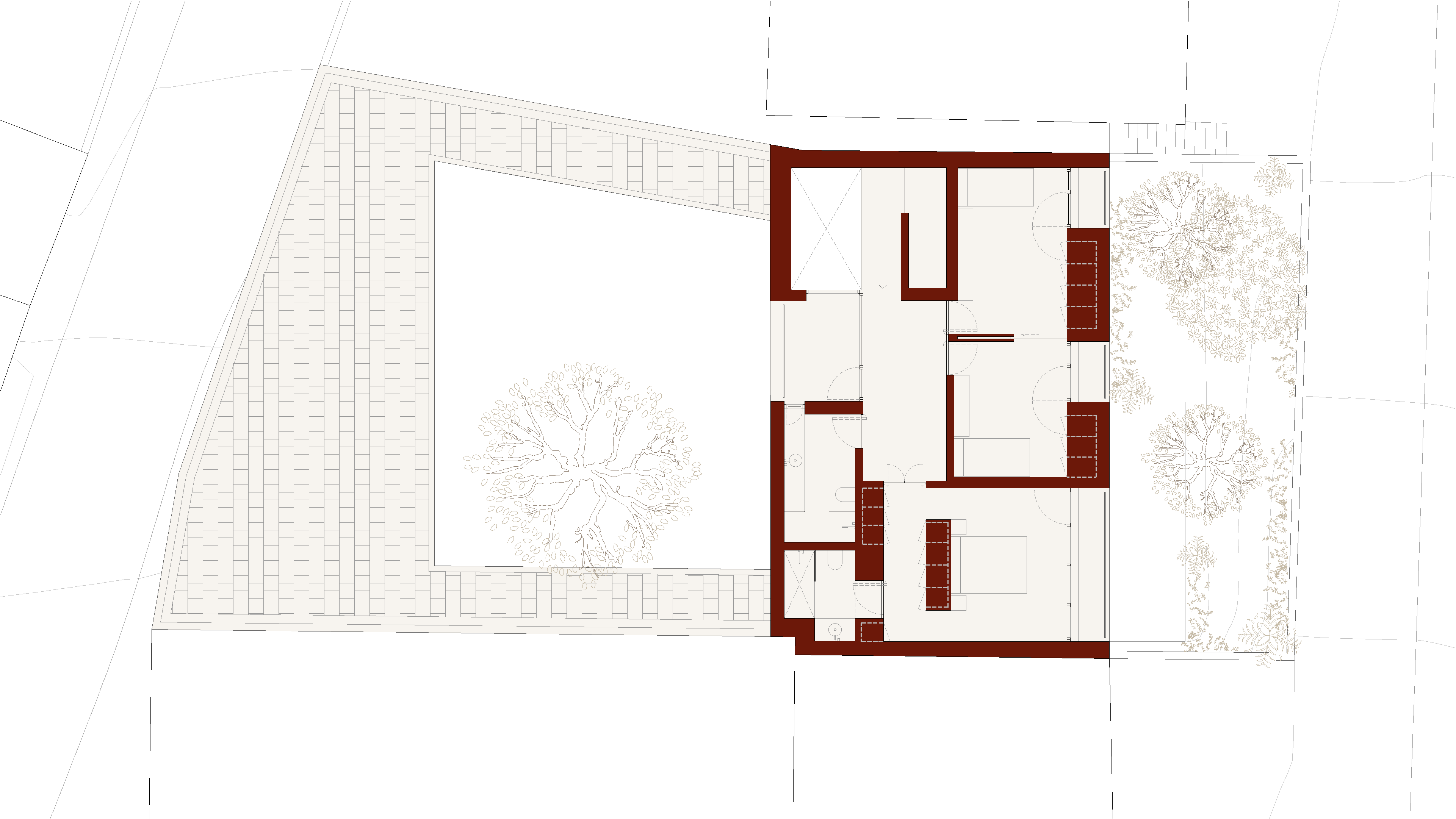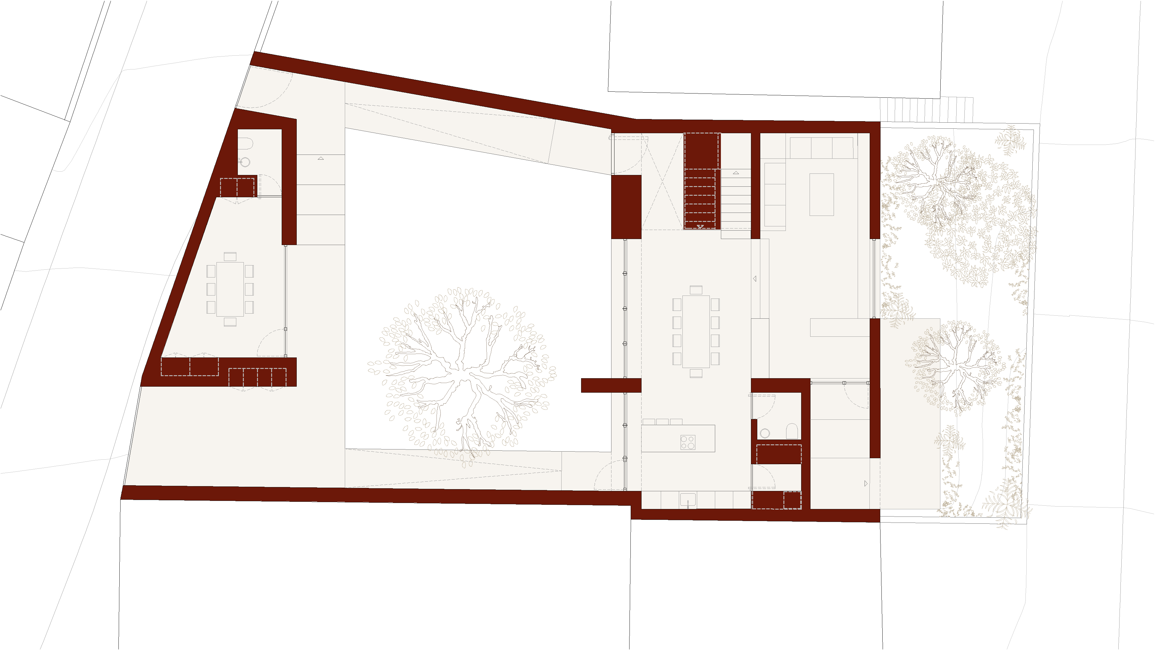 아트리움을 중심으로 하나의 길 처럼 표현된 통행로는 프로젝트의 다양한 층과 연결되며, 집 내부로 이어져 내부와 외부 간의 물리적·시각적 연속성을 제공합니다. 이 길의 재료는 전통적인 산화철 색소 기법을 사용하여 따뜻한 분위기를 만들며, 안뜰과 지붕의 자연의 색과 조화를 이루는 색조를 띱니다.