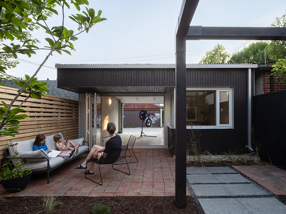 자전거 애호가인 부부는 자전거 수리 작업 공간을 원했고, 아이들의 스쿠터와 가정용품을 보관할 공간, 생일 파티와 바비큐를 할 수 있는 장소, 더 나은 뒷마당과 야외에 앉을 수 있는 공간도 필요했습니다.