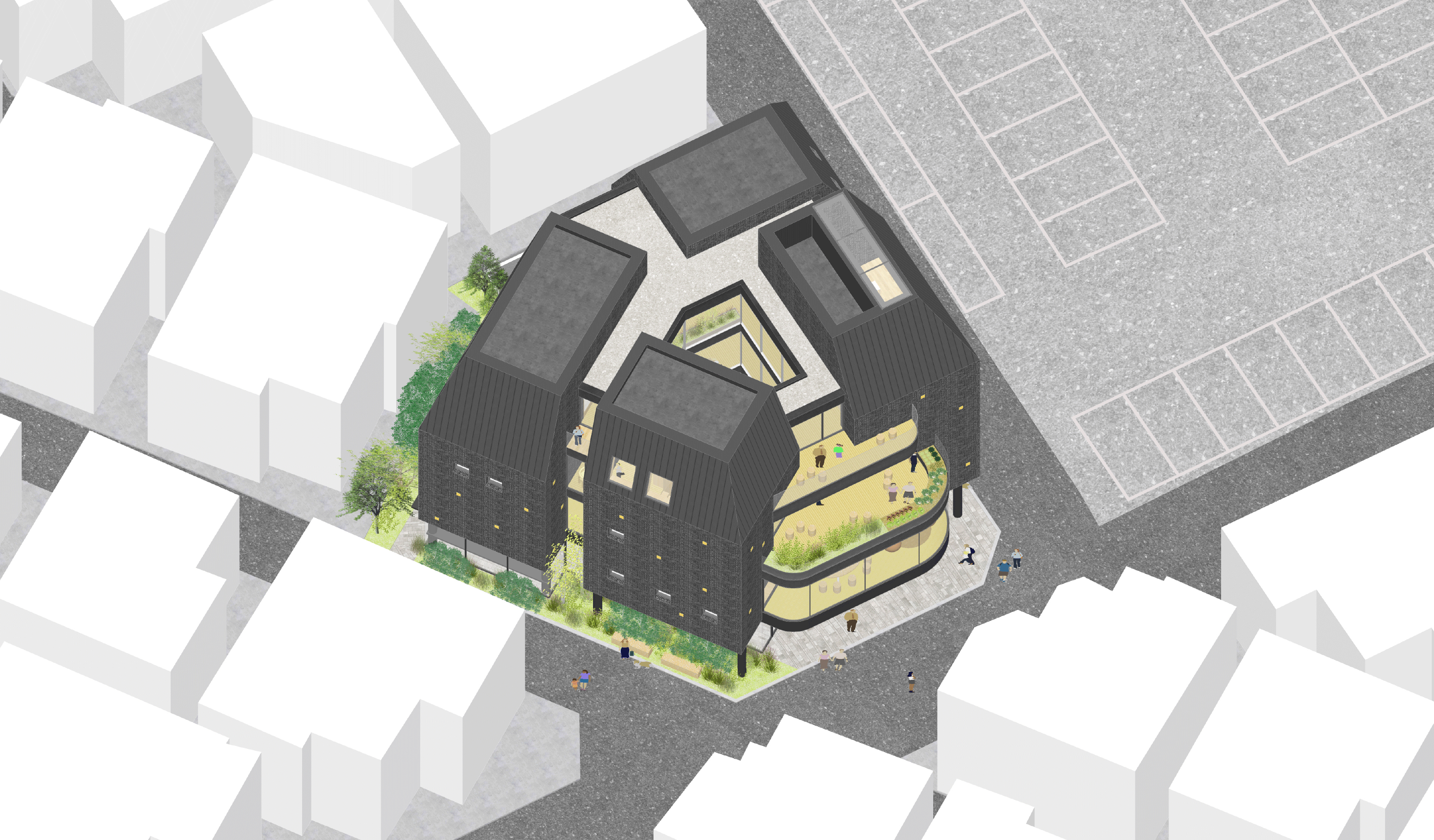 어울림복합플랫폼은 아무것도 하지 않을 자유, 무엇이든 시도하는 용기, 혼자 시간을 보낼 권리, 언제든지 함께 할 수 있는 기회가 공존하는 공간이다. 청소년이 주체적으로 공간을 만들어 나갈 수 있는 배경으로서 건축은 역할을 할 것이다. 중정을 중심으로 각각 개성을 담은 네 개의 집과 사이길, 그리고 길에서 확장되는 여러 성격의 공용 공간을 조성하여 청소년들이 스스로 다양한 공간적 경험을 선택할 수 있게 한다.