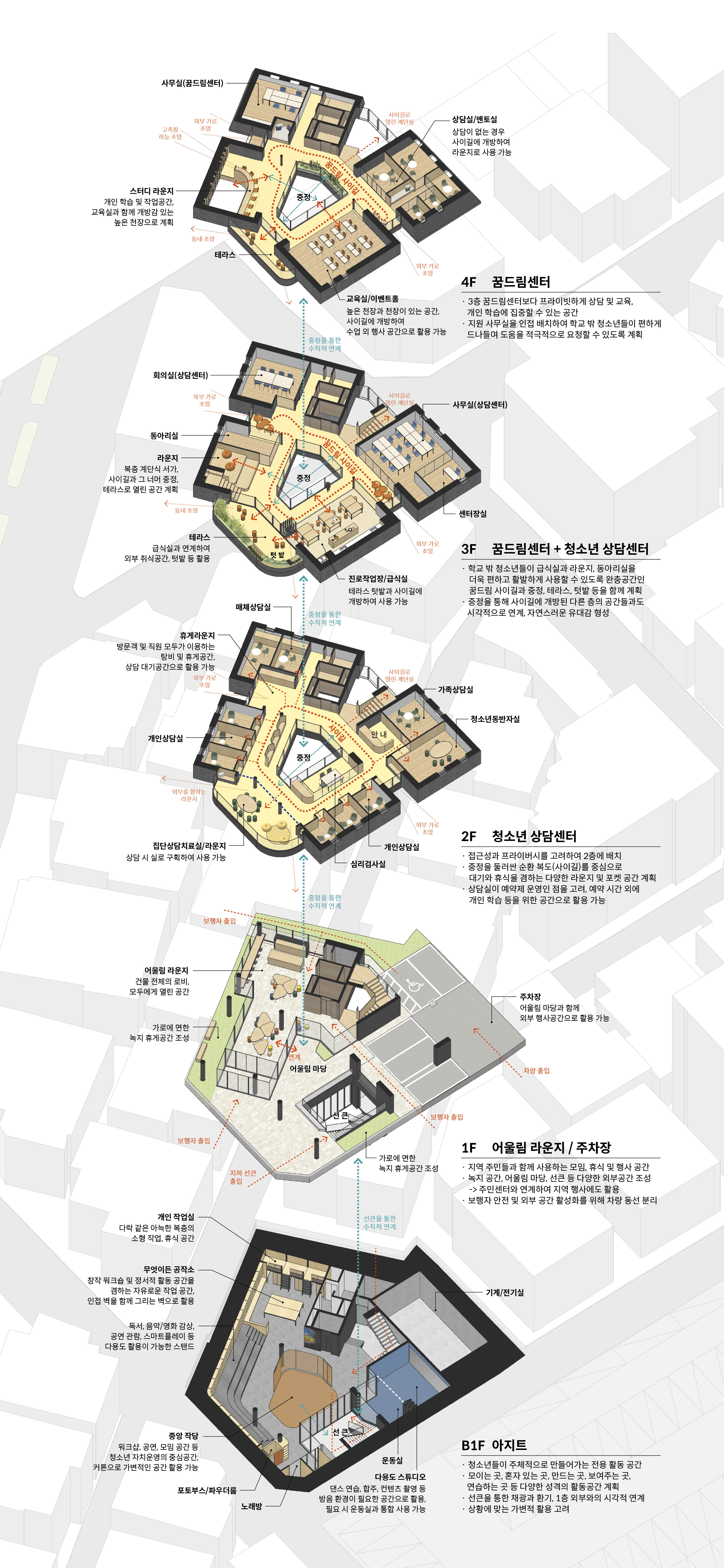 어울림복합플랫폼은 아무것도 하지 않을 자유, 무엇이든 시도하는 용기, 혼자 시간을 보낼 권리, 언제든지 함께 할 수 있는 기회가 공존하는 공간이다. 청소년이 주체적으로 공간을 만들어 나갈 수 있는 배경으로서 건축은 역할을 할 것이다. 중정을 중심으로 각각 개성을 담은 네 개의 집과 사이길, 그리고 길에서 확장되는 여러 성격의 공용 공간을 조성하여 청소년들이 스스로 다양한 공간적 경험을 선택할 수 있게 한다.