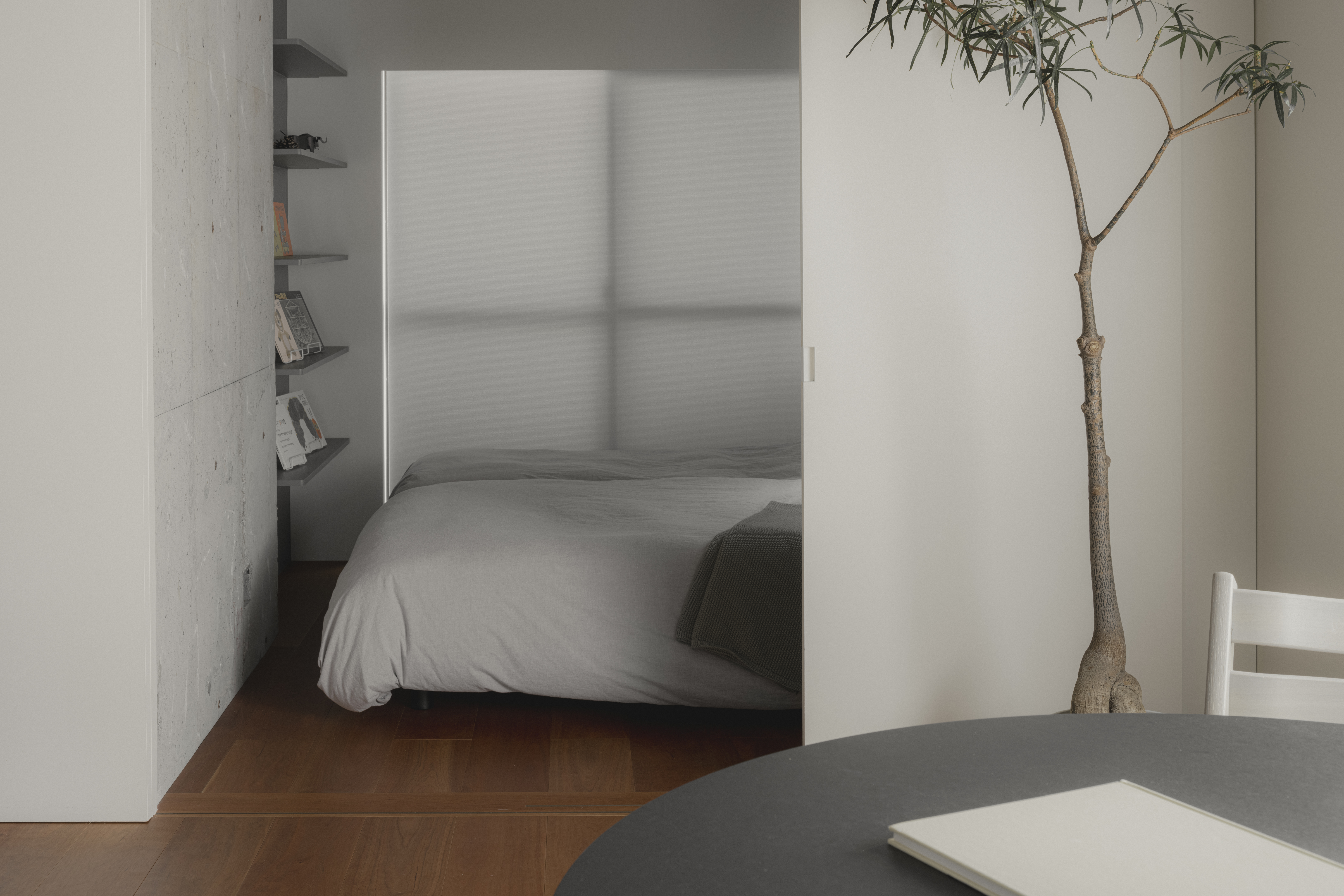 이 주택은 가구와 미닫이문으로 공간을 구획하여 불필요한 벽을 만들지 않았습니다. 작은 공간에 가벼움과 넓이감을 부여하는 동시에 건축 과정을 합리화하고 단순화 했습니다.