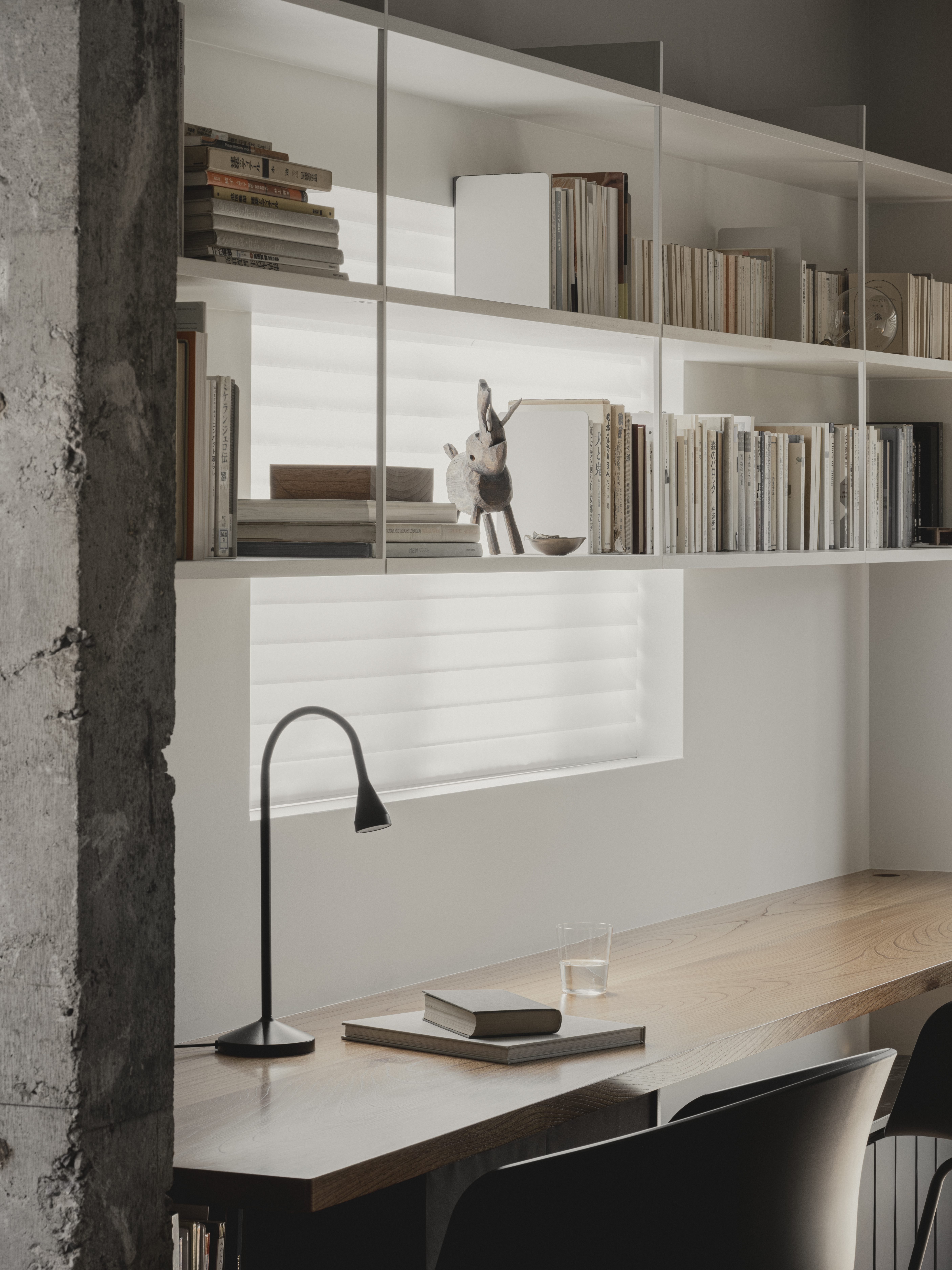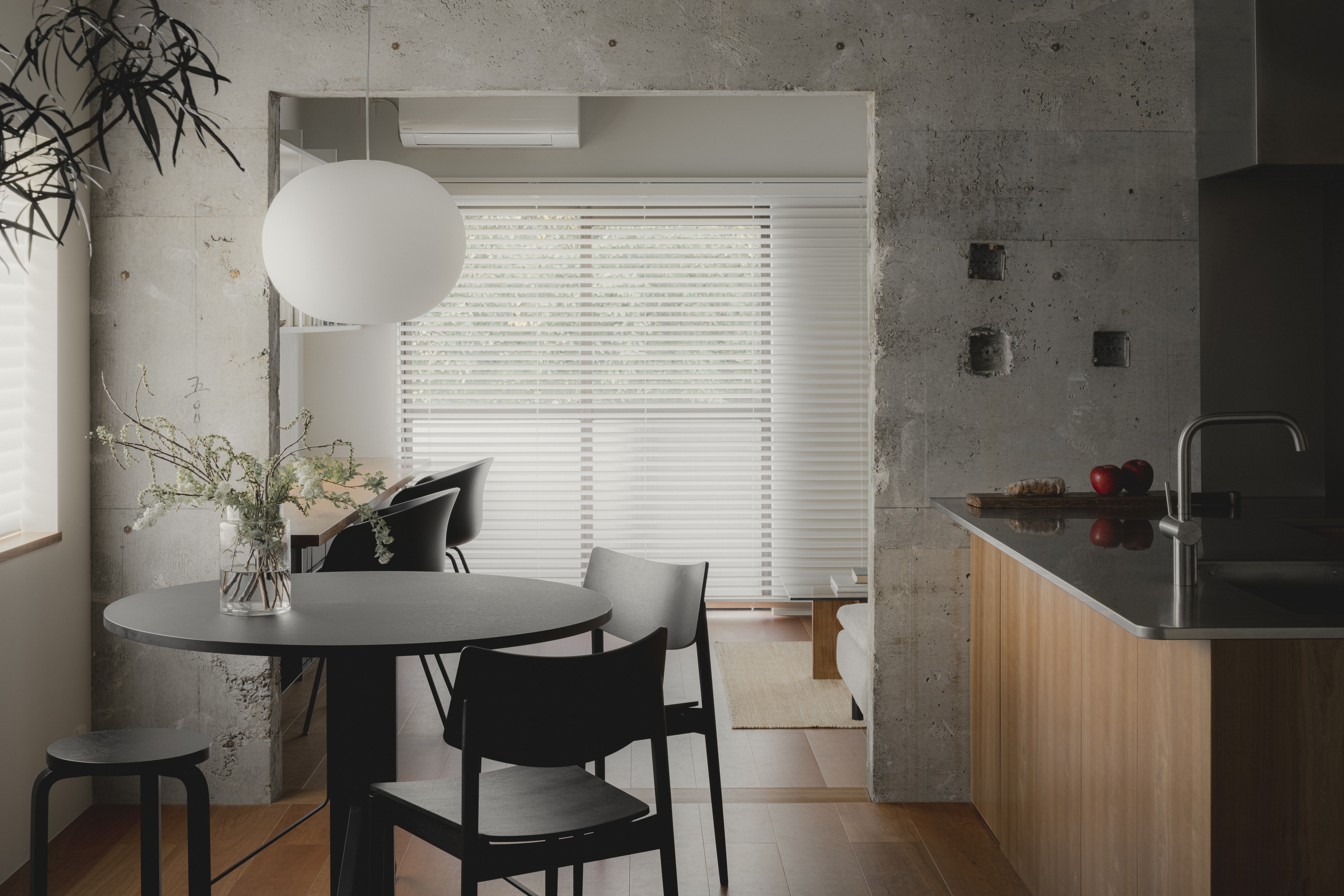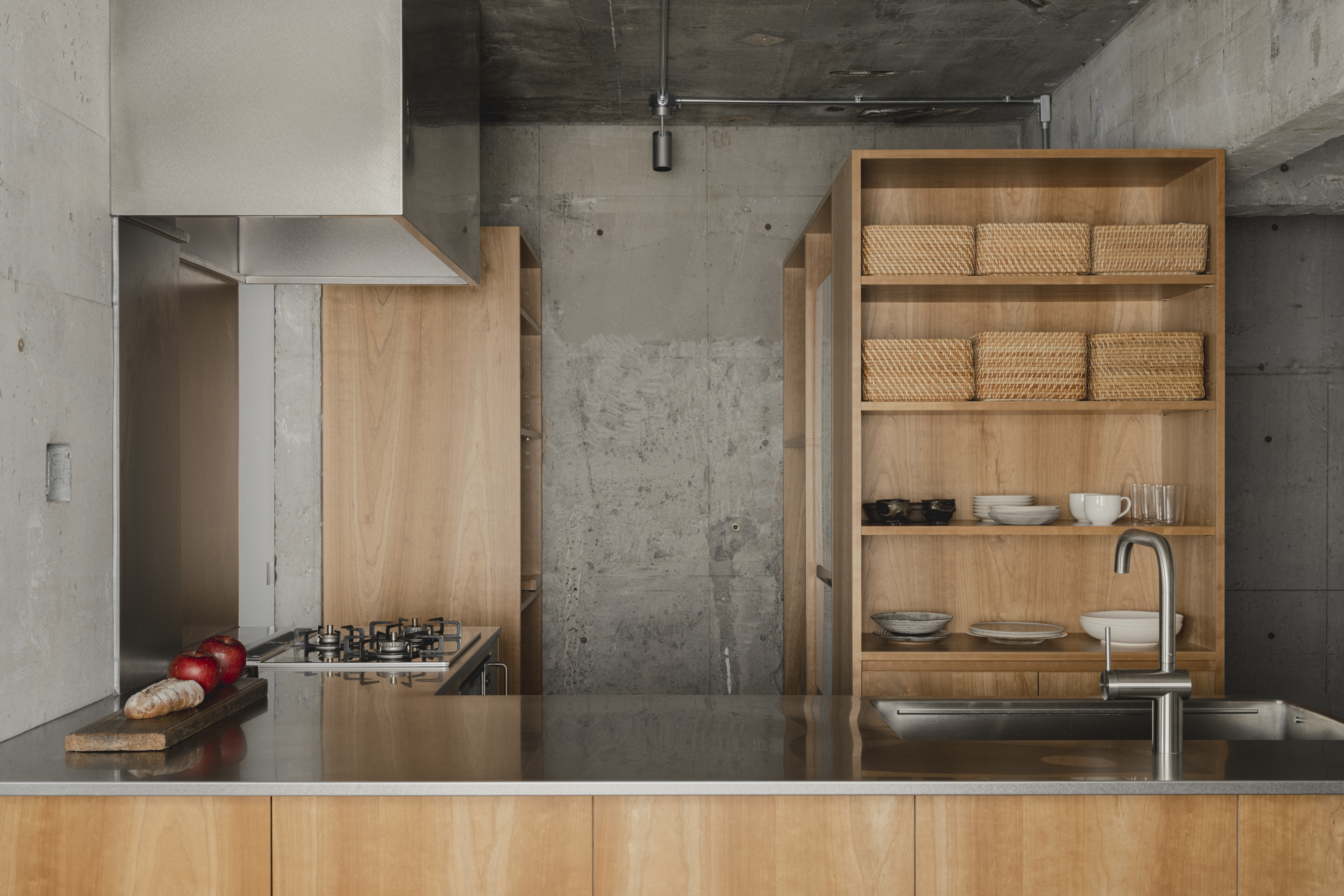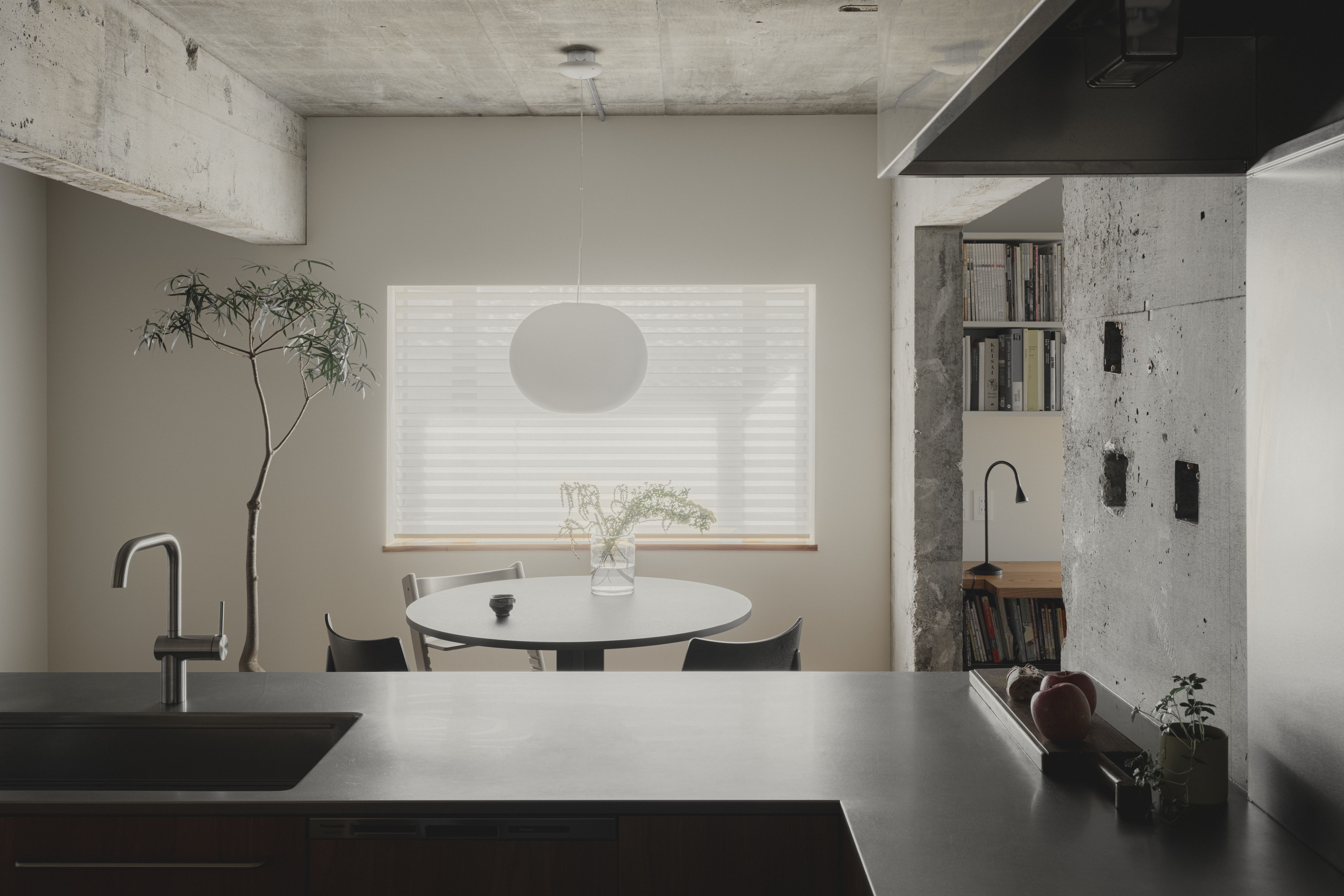 질감을 가진 체리 나무를 주요 자재로 사용하여 50년 된 거친 콘크리트 프레임과 대비를 이루도록 했습니다. 또한 창문을 통해 보이는 느티나무 숲과 통일감을 줄 수 있도록 긴 책상과 커피 테이블에 느티나무를 사용했습니다. 주방 뒤벽에는 큰 거울을 배치해 그 존재감을 최소화하고, 공간의 깊이를 시각적으로 증대시킴과 동시에 외부의 녹지를 실내로 끌어들일 수 있는 장치로 활용되었습니다.