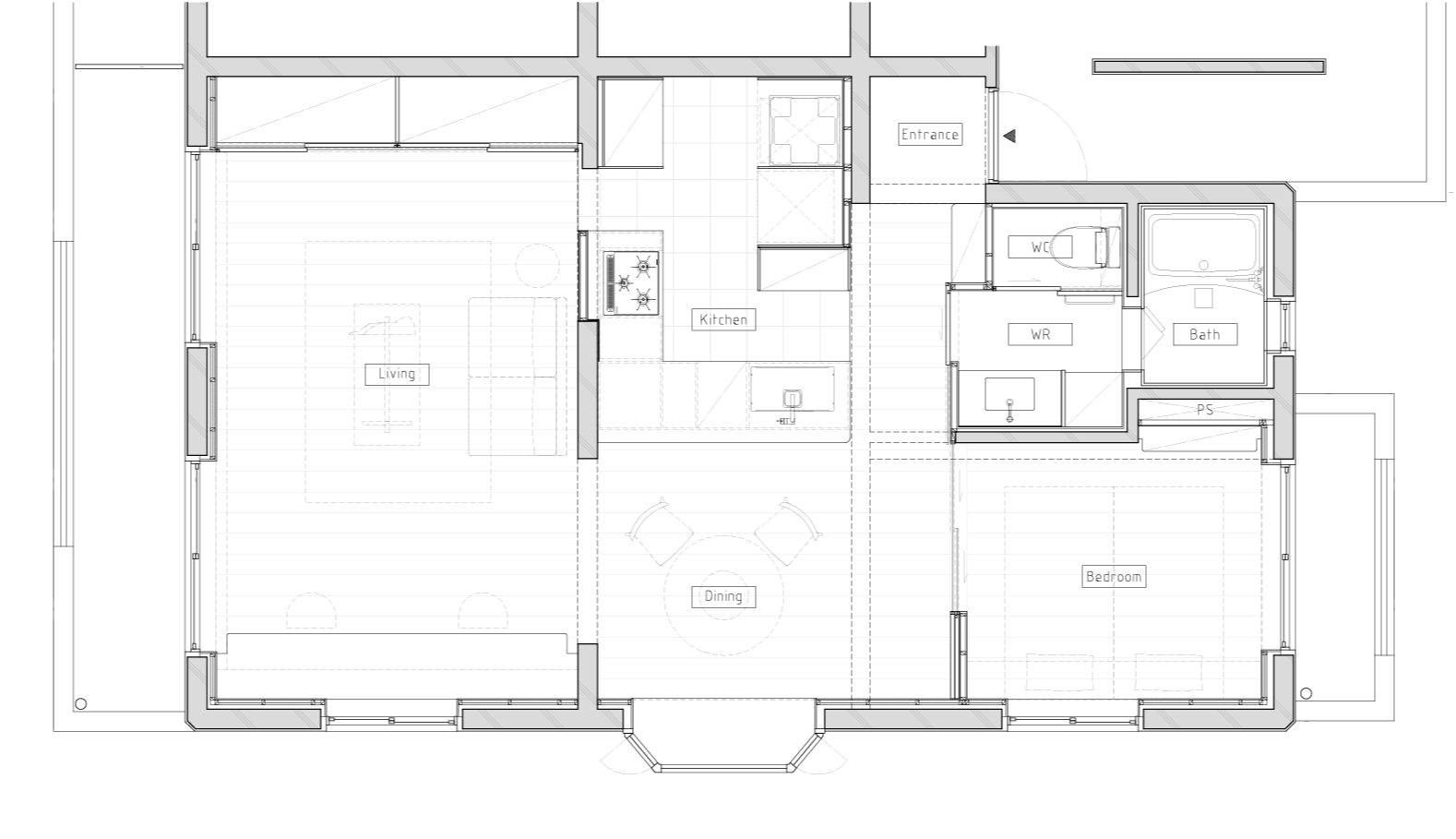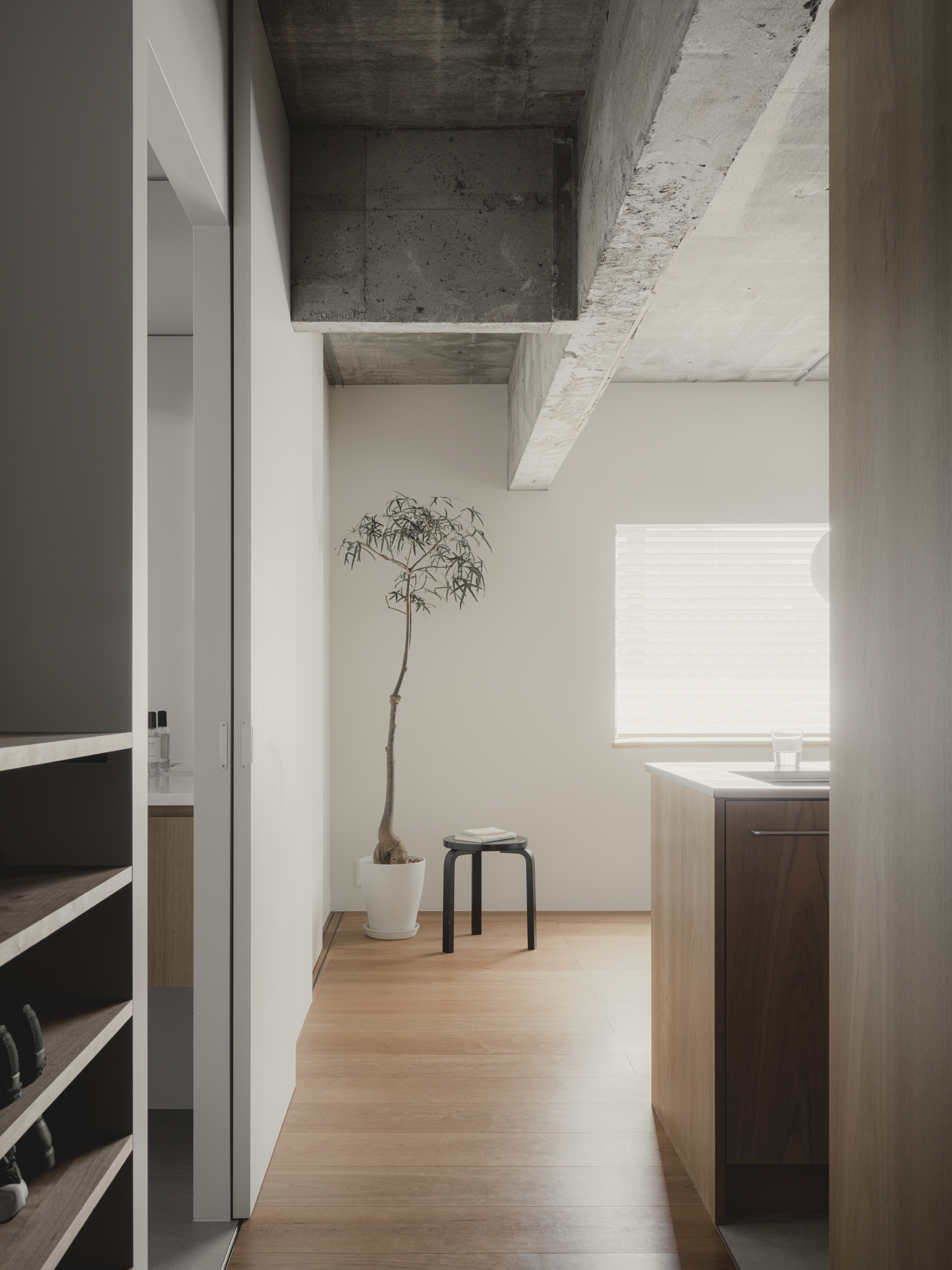 이 주택은 가구와 미닫이문으로 공간을 구획하여 불필요한 벽을 만들지 않았습니다. 작은 공간에 가벼움과 넓이감을 부여하는 동시에 건축 과정을 합리화하고 단순화 했습니다.