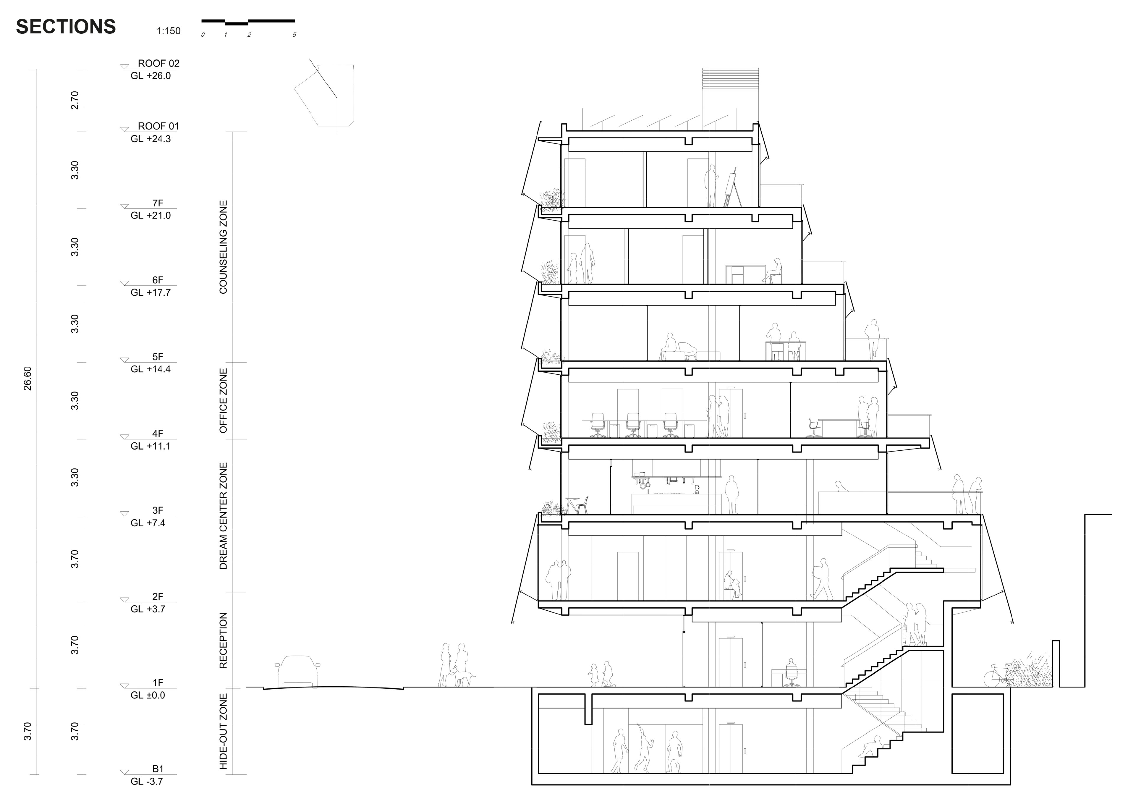 아지트 존, 청소년 상담 복지 센터 존, 꿈드림센터 존을 층별로 분리하되 각각의 ZONE 사이에는 연계 및 완충 역할을 하는 프로그램을 배치했다.