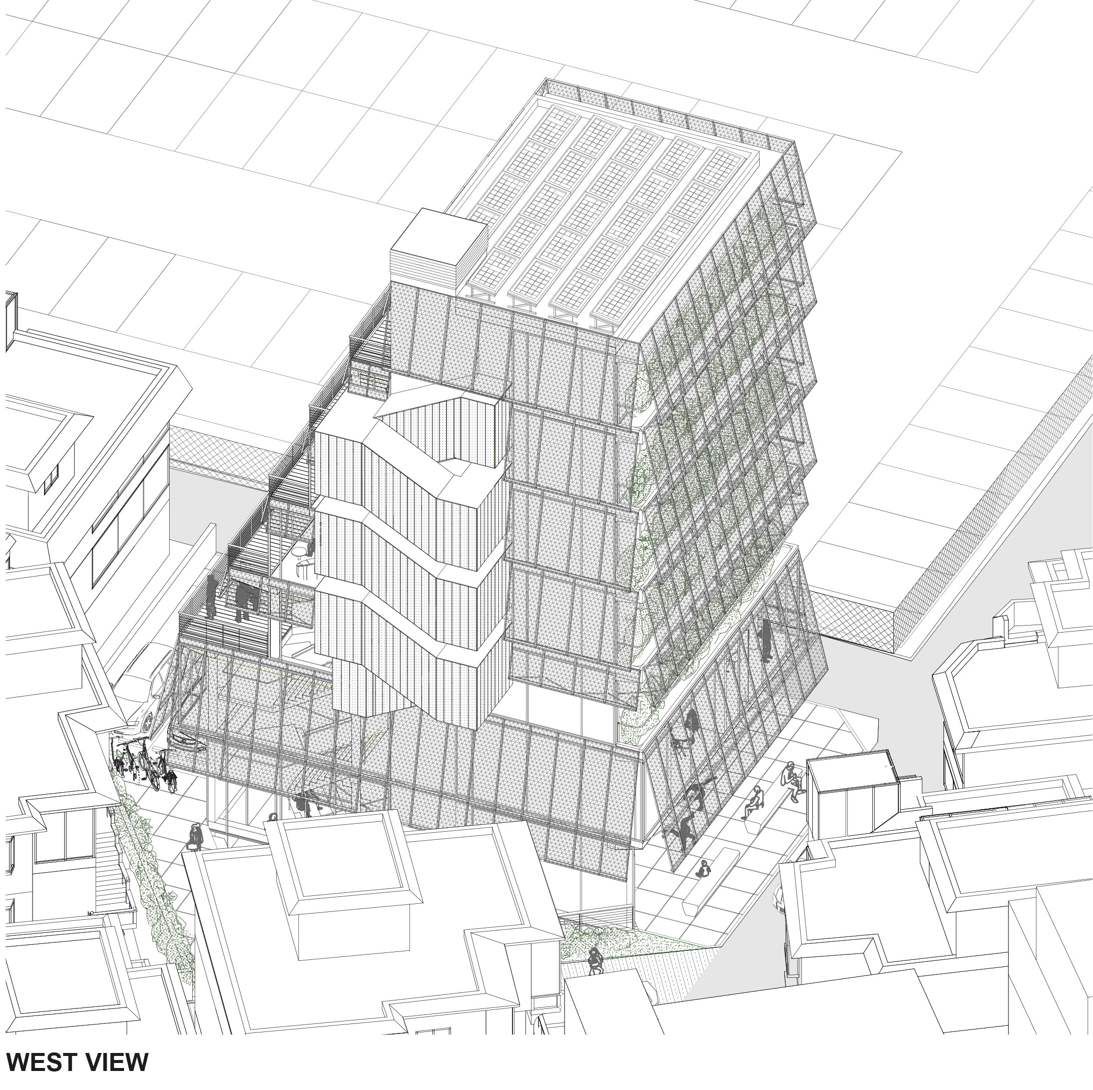 일조권 사선 제한으로 자연스럽게 북측에 테라스가 난 계단식 형태의 매스가 계획되었다. 지상층은 공공 공간으로 열어주고, 평균 약 7.5미터가량 되는 주변 건물의 높이를 고려해 3층에도 넓은 야외 테라스를 두어 탁 트인 조망을 즐길 수 있도록 했다. 매스는 단순하지만 그린 발코니, 외부 계단, 메탈 메쉬 판넬 을 더해지며 생긴 다채로운 공간과 입면이 프로젝트만의 정체성이 된다