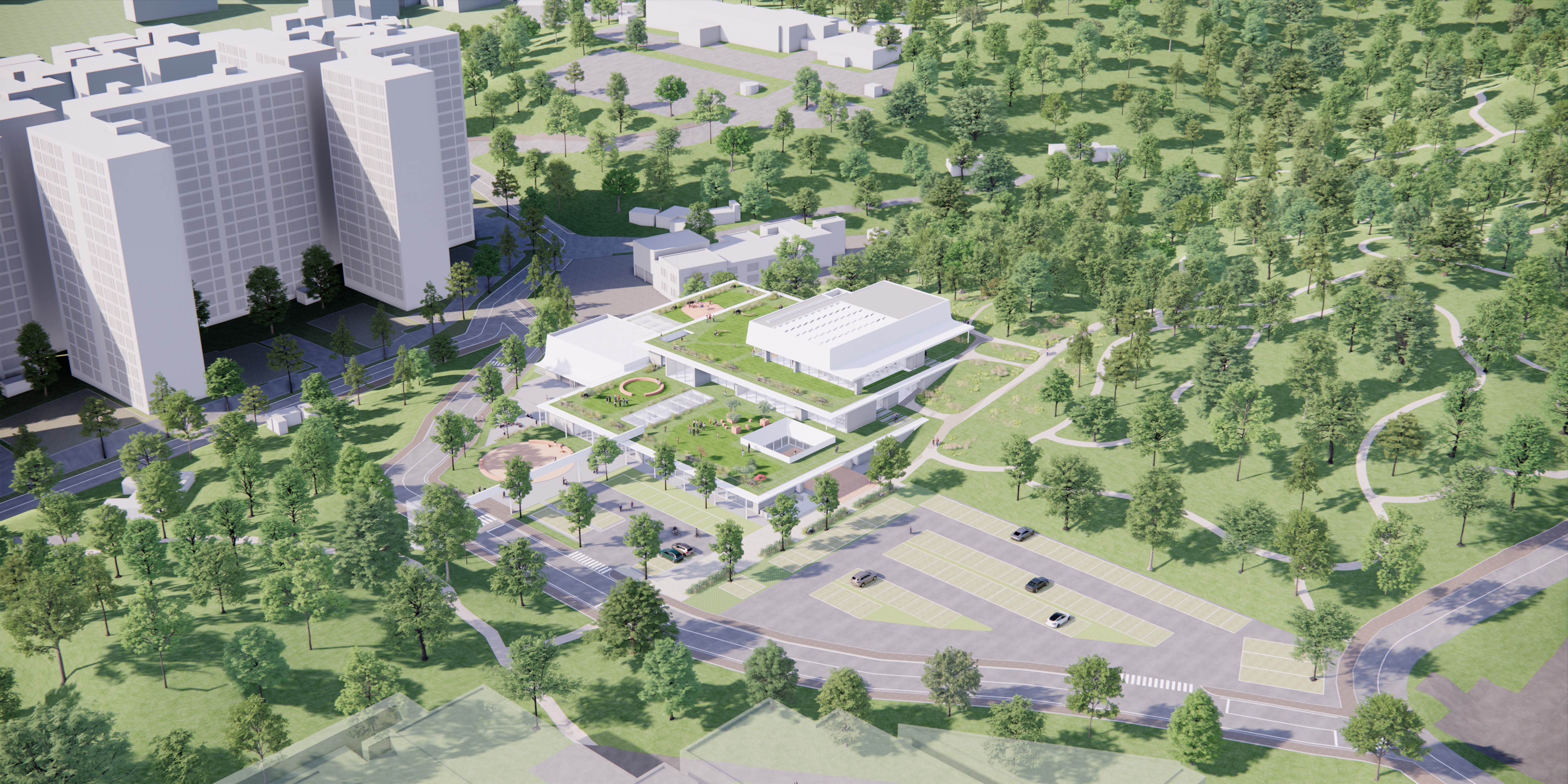 계림공원은 도시의 발전 속에서도 본래의 자연지형을 그대로 간직하고 있다. 당진 시내 주요도로인 시청1로를 사이에 두고 녹지 축이 이어진다. 이러한 풍경을 존중해 청소년수련관은 지형과 동화되어 대지 너머 공원 조망을 지키면서 공원의 풍광을 확장한다. 지형을 따라 점진적으로 비껴앉아 연속되는 단들은 공원과 문화 프로그램을 유기적이고 입체적으로 연계하고, 주변 시설들과 자연스럽게 이어지며 통합된 문화의 풍경을 형성한다.
