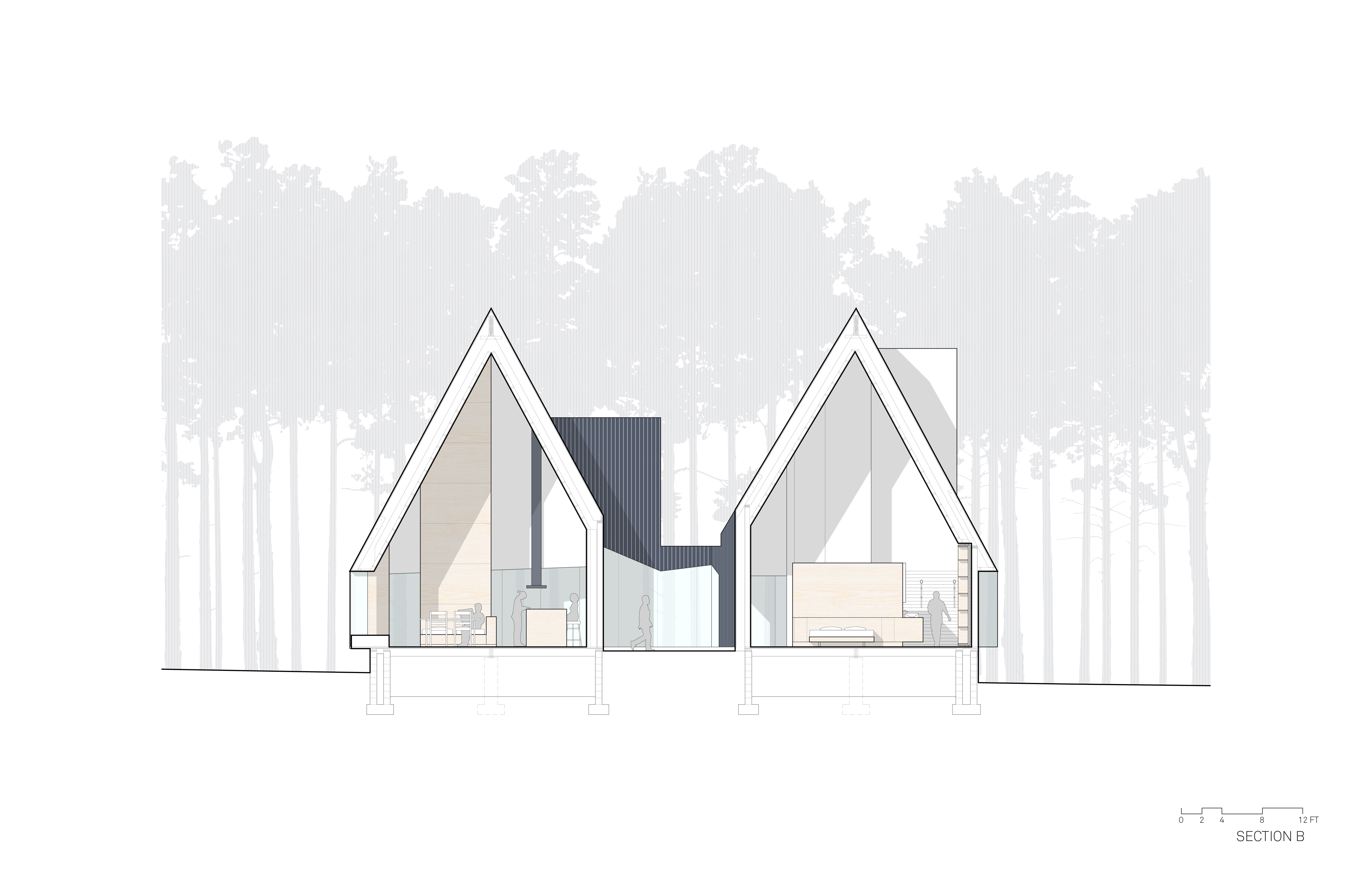 평면은 공용 공간과 사적 공간을 나누는 두 개의 박공형 볼륨으로 구성되어 있습니다. 주방과 식당은 두개의 볼륨을 연결하며, 유리로 이루어진 낮은 스케일의 갤러리 같은 로지아(loggia)는 숲속을 거니는 듯한 느낌을 줍니다. 이 전이 공간은 집의 독립된 영역을 나누고 연결하면서도 개방감을 줍니다.