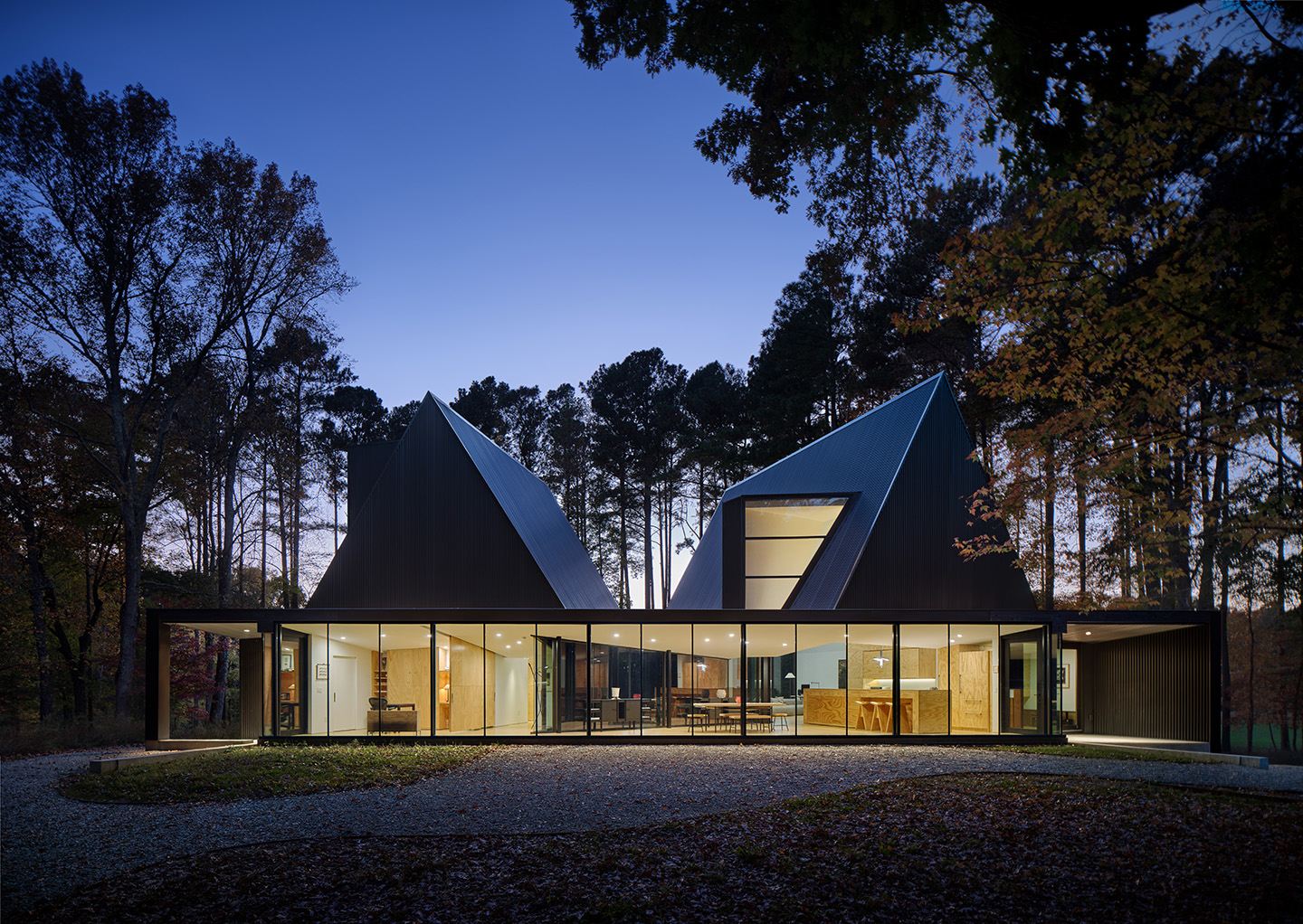 간결한 박공 지붕은 약 9.4미터 높이이며, 넓은 유리가 자연과 실내 공간을 시각적으로 연결합니다. 반사 유리와 검은 금속 외관으로 구성된 건축물은 계절에 따라 다른 분위기의 공간으로 변합니다. 여름에는 숲의 반짝이는 빛 속으로 사라지듯 숨어들고, 겨울에는 나뭇가지 사이에서 은은한 존재감을 드러냅니다. 자연 합판으로 마감된 내부는 따뜻하고 안락한 모임 공간으로 사용할 수 있습니다.