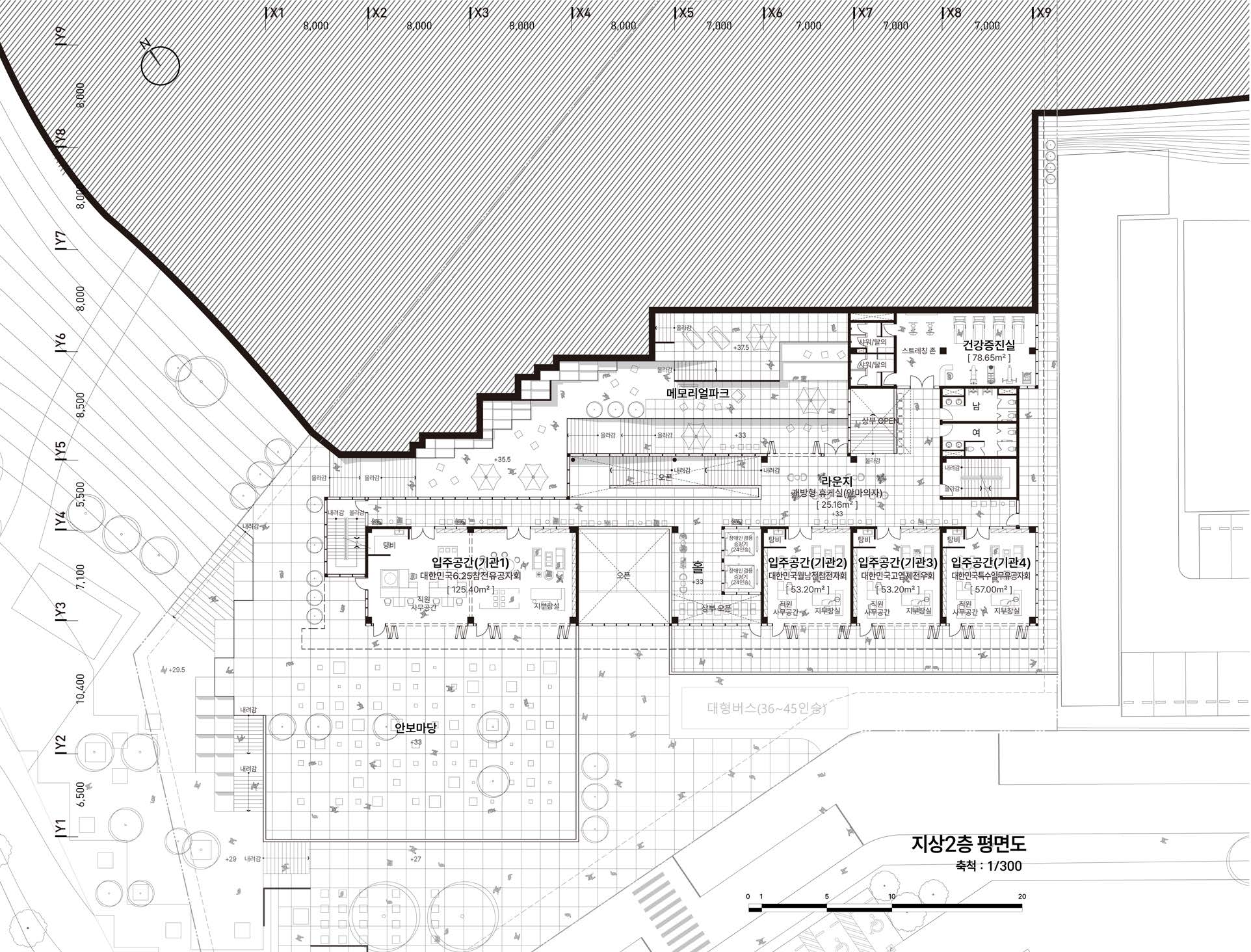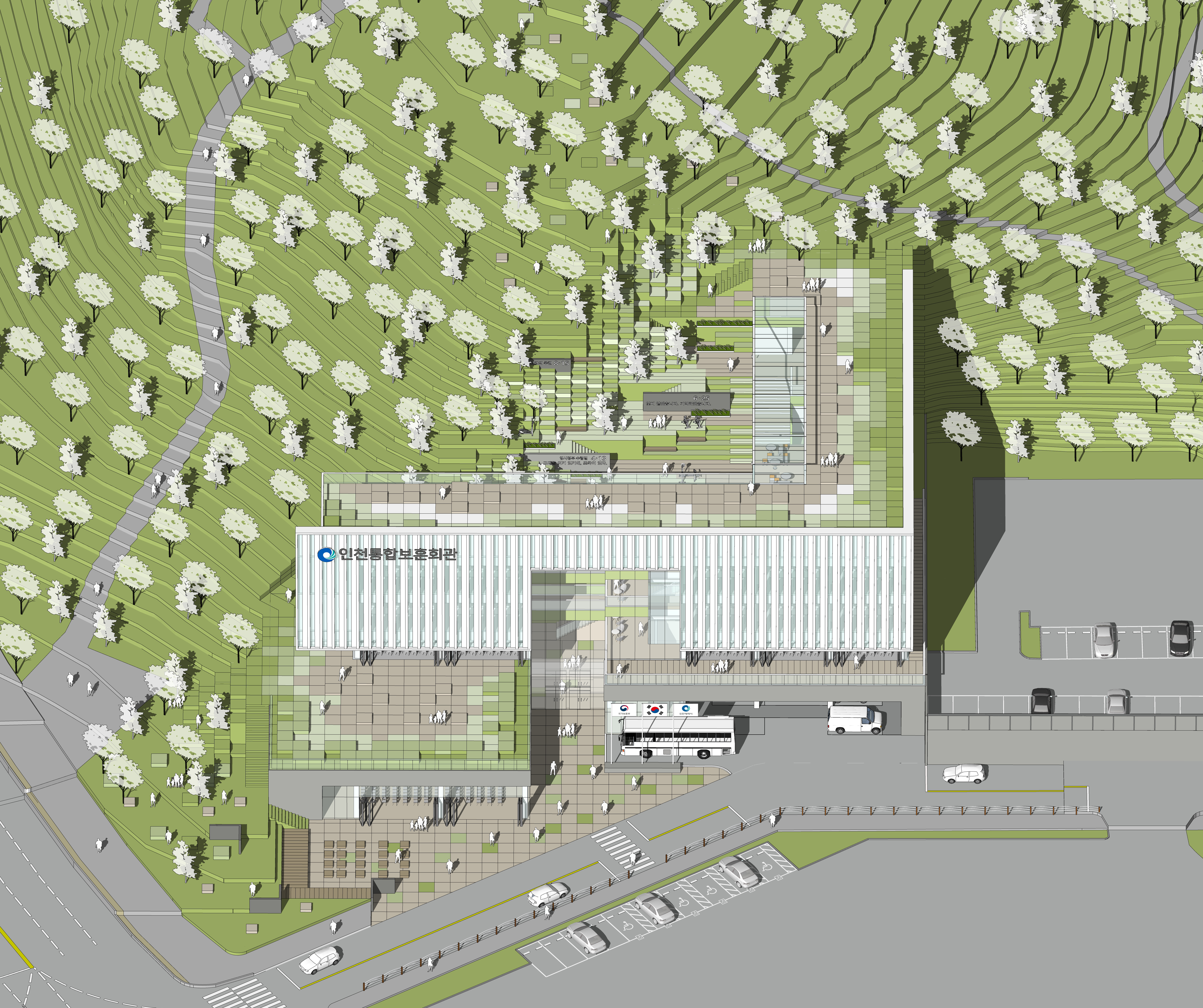 지형에 순응하며 조성된 다양한 레벨의 외부공간들은 다양한 방식으로 자연과 교감되며, 메모리얼 파크 주변인 석촌근린공원의 산책로들과 연계되어 자유롭게 드나들고 머물 수 있는 하나의 숲을 형성한다. 이어지는 각기 다른 레벨의 외부공간을 바라보는 이용자들과 방문객은 과거의 아픔을 기억하고 애도하며 기린다. 도시축을 기준으로 전면으로 다양한 마당을 두어 비교적 좁은 도로와 막힌 매스들 사이에서 이용자들에게 도시적 쉼터 역할을 한다. 대상지 북쪽으로 형성되어 있는 석촌근린공원의 일부를 상징성있는 휴게공간으로 계획함으로 건물과의 연속적인 관계를 이루었고, 보훈회관으로의 상징을 강화했으며 이에 더하여 자연의 나무를 연상시키는 수직 루버의 이용으로 차양과 주변과의 조화를 만들어낸다. 미래세대와 보훈세대가 함께하는 인천시 통합 보훈회관. 우리는 이용자들에게 자연의 복지를 주는 이 통합보훈회관으로 인해 다양한 세대가가 살아가는 공간으로 형성되길 기대한다.
