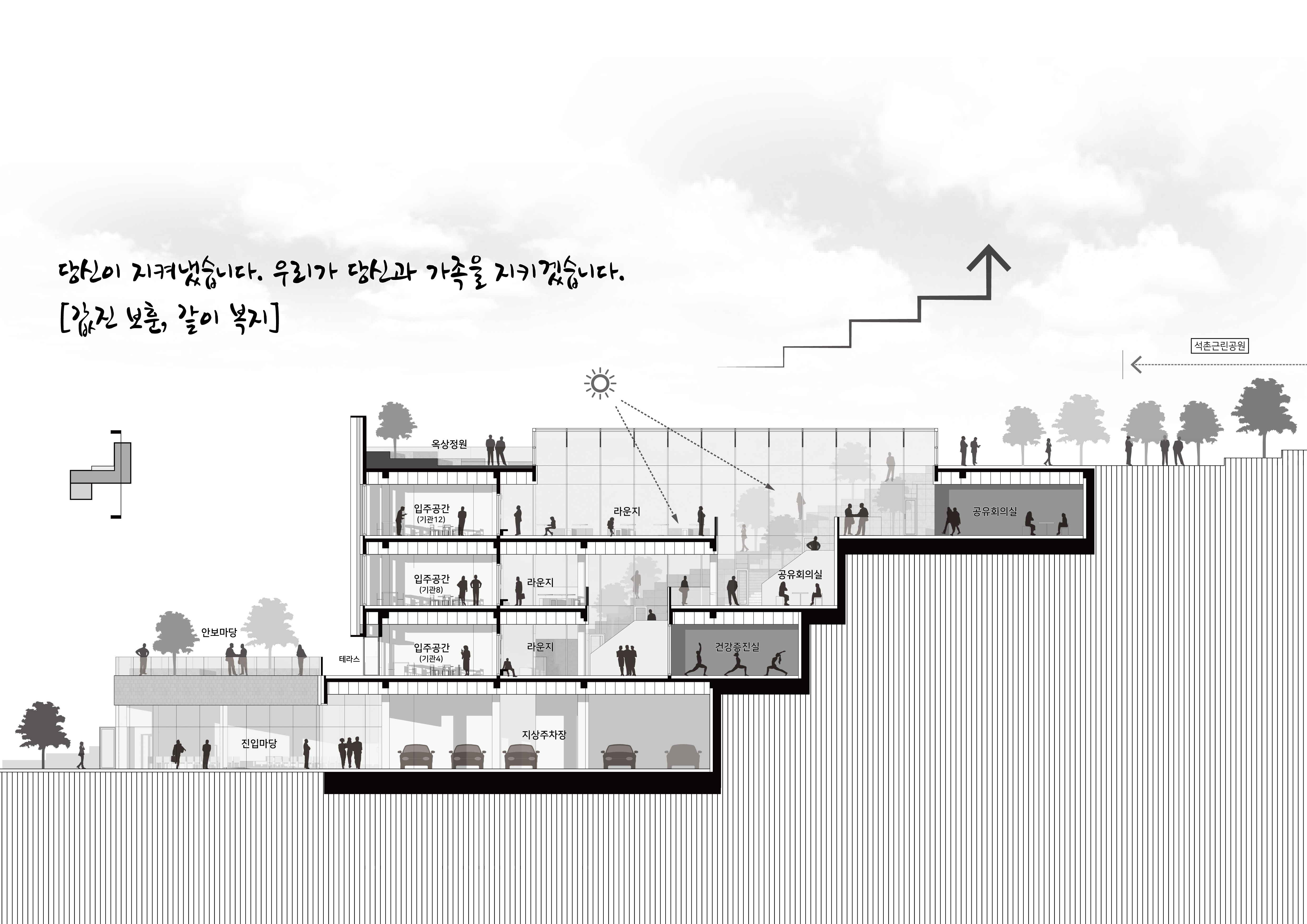 계획을 처음 마주하였을때 경사도가 높고 석촌근린공원이라는 외부공간을 어떻게 활용할 것인가가 가장 큰 주안이었다. 우선 도시의 축을 고려하여 방향을 설정하였고 전면에 큰 외부공간을 두어 기존 공지와의 연계성을 강화하였다. 후면으로는 근린공원의 경사를 최대한 활용하여 계단식 외부공간을 계획하였다. 건물은 대지에 관통되어 들어가는 듯한 단순 명료한 'ㄴ'의 형태를 띈다. 다음으로, 역사적 사건을 기억하고 기리는 공간으로 설정한 계단형 외부공간인 메모리얼 파크를 각 층의 슬라브와 연결시킨다. 외부공간과 내부공간을 잇는 매개체형식의 직통계단을 두어 안과 밖의 유기적인 연결을 이끌어 내고, 공용공간에서 연속적인 연결을 유도하여 공간을 더욱 풍성하고 쾌적하게 만든다. 매스와 외부공간의 관계성을 확립하고, 내부공간들의 관계를 설정하는 것이 다음 주안점이 되었다. 가장 중요한 실인 입주공간들을 우선 남향배치하고 동일한 입주환경을 만들어 주었다. 그리고 공유공간들을 입주공간과 입체적으로 연계해주었으며, 각 층으로 분산 배치하여 모두가 공평하게 누릴 수 있는 복지환경을 제공하였다. 이 공간들은 외부공간과도 유기적으로 연계되어 건물의 내·외부가 기능적이고 입체적으로 작용할 수 있도록 계획하였다.
