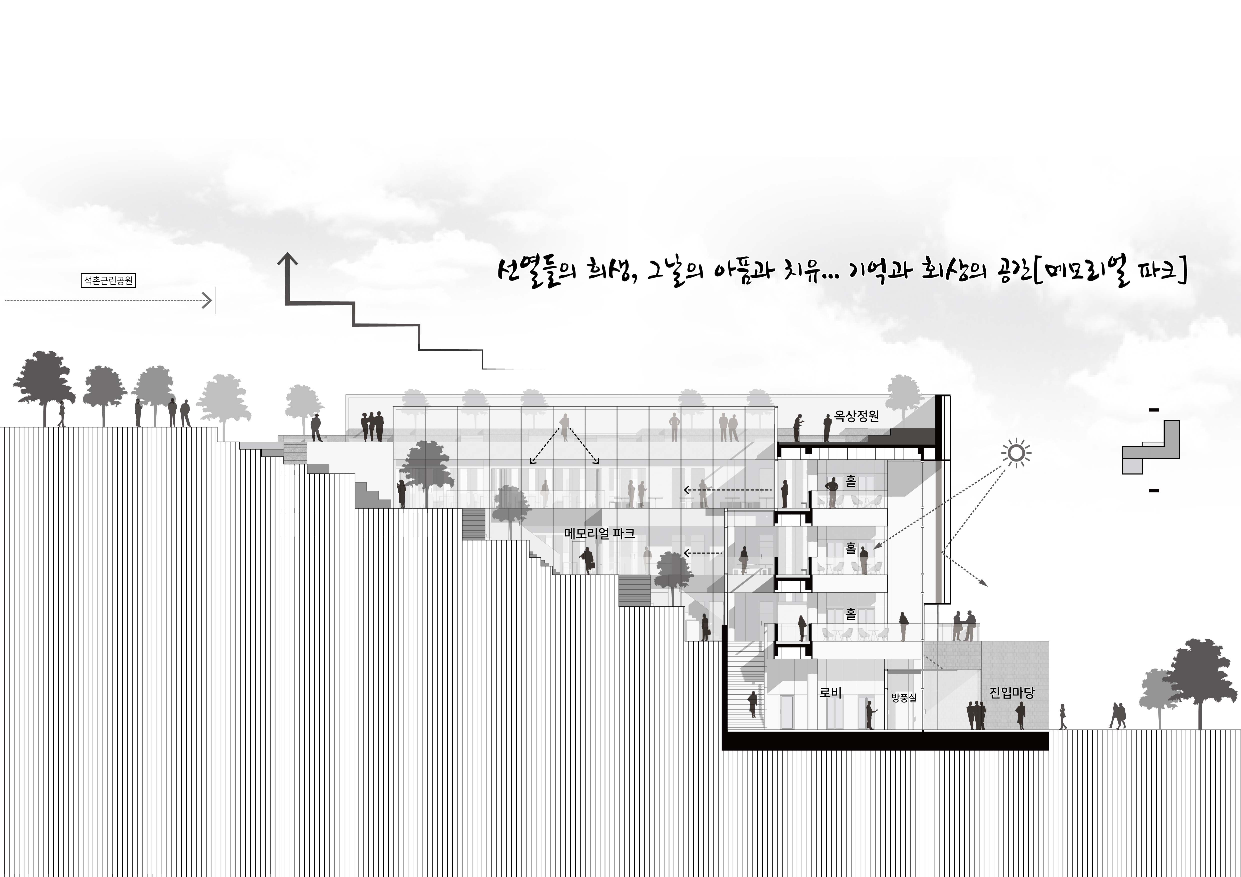 지형에 순응하며 조성된 다양한 레벨의 외부공간들은 다양한 방식으로 자연과 교감되며, 메모리얼 파크 주변인 석촌근린공원의 산책로들과 연계되어 자유롭게 드나들고 머물 수 있는 하나의 숲을 형성한다. 이어지는 각기 다른 레벨의 외부공간을 바라보는 이용자들과 방문객은 과거의 아픔을 기억하고 애도하며 기린다. 도시축을 기준으로 전면으로 다양한 마당을 두어 비교적 좁은 도로와 막힌 매스들 사이에서 이용자들에게 도시적 쉼터 역할을 한다. 대상지 북쪽으로 형성되어 있는 석촌근린공원의 일부를 상징성있는 휴게공간으로 계획함으로 건물과의 연속적인 관계를 이루었고, 보훈회관으로의 상징을 강화했으며 이에 더하여 자연의 나무를 연상시키는 수직 루버의 이용으로 차양과 주변과의 조화를 만들어낸다. 미래세대와 보훈세대가 함께하는 인천시 통합 보훈회관. 우리는 이용자들에게 자연의 복지를 주는 이 통합보훈회관으로 인해 다양한 세대가가 살아가는 공간으로 형성되길 기대한다.