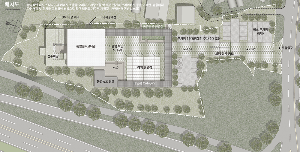 먼저, 이 곳은 전통문화와 무형문화재의 가치를 전승보존하고 발전시킬 뿐만 아니라 동시에 일반 방문객이나 지역주민들에게 우리의 무형문화유산에 대한 이해와 소중함을 전달하고 널리 알릴 수 있는 곳으로서 누구나 쉽고 편리하게 다가와서 새로운 경험할 수 있는 열려있는 장소가 되어야 한다. 이러한 두가지 방향을 모두 만족시키기 위해서는 무형문화재 전수교육을 위한 Private 영역과 일반 이용자 및 지역주민에게 개방될 Public 영역이 현재 부지의 특성과 주변환경에 조화롭게 배치될 수 있도록 합리적이고 융통성 있는 계획이 필요하다. 여기에 우리는 무형의 전통과 사람이 자연속에서 하나로 어우려져 미래의 문화가치를 만들어 가는 지속가능한 장소로서의 통합전수교육관을 제안한다.