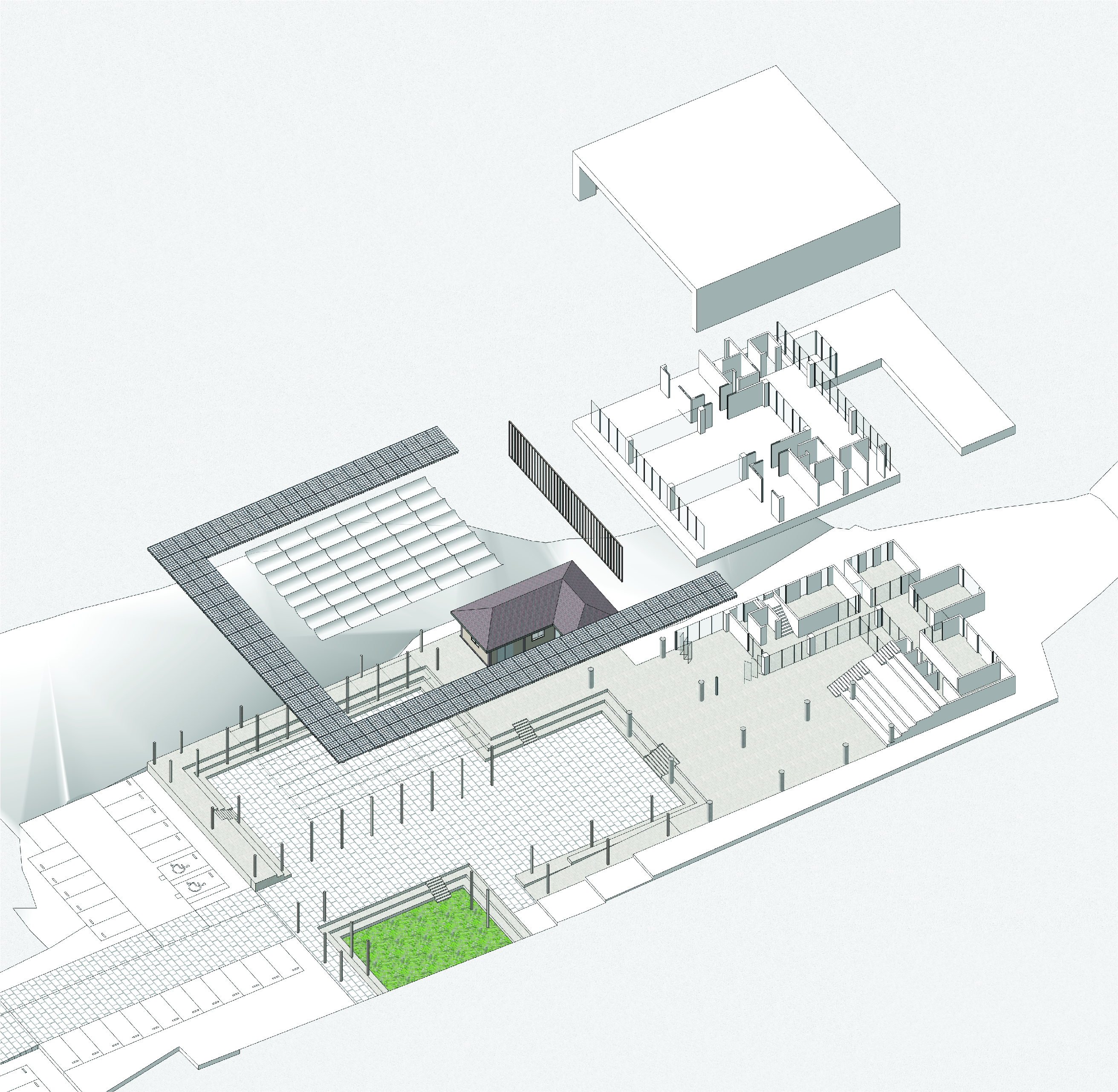 주차장에서 보행자 전용통로를 이용하여 안전하게 들어선 열린 외부공간은 기존 전수관과 마당이 있던 레벨에 조성이 되며 야외공연장의 지붕은 고정된 구조물이 아닌 가변적인 Movable shade를 적용하여 다양한 종류의 공연을 가능하게 하고 통명농요 공연을 위한 논 등이 있는 넓은 마당영역으로 주변과의 경계를 허물어 자연과 함께 소통하고 누구나 쉽고 편리하게 접근이 가능하다. 또한 기존 통명농요 창고와 같은 레벨에 자리한 1층은 일반인에게 개방되는 전시, 공방, 체험, 등의 Public 프로그램으로 구성되어 있으며, 필로티 하부의 열린 마당과 2층으로 연결되는 커뮤니티 스탠드는 이용객에게 내.외부 공간의 확장성과 다양한 이벤트를 가능하게 한다. 2층은 평상 시에는 전수교육울 위한 Private영역으로서 일반 이용자와의 동선이 혼재되지 않고 대연습실, 소연습실, 소품보관실, 탈의, 샤워실 등의 시설간의 독립적인 이용과 다양한 용도로의 활용을 위한 가변성 및 확장성을 고려한 평면으로 구성되어 있으며, 우천 시에는 실내공연장으로서 기능도 담당할 수 있는 가장 합리적이고 융통성 있는 공간을 제공한다. 이러한 통합전수교육관은 어떤 특별한 형태를 나타내기보다 단순하지만 그 안에 전통문화의 가치를 담아내고 사람과 사람을 연결하며 자연과 함께 어우러질 수 있는 단아하고 절제된 모습으로 놓여진다.