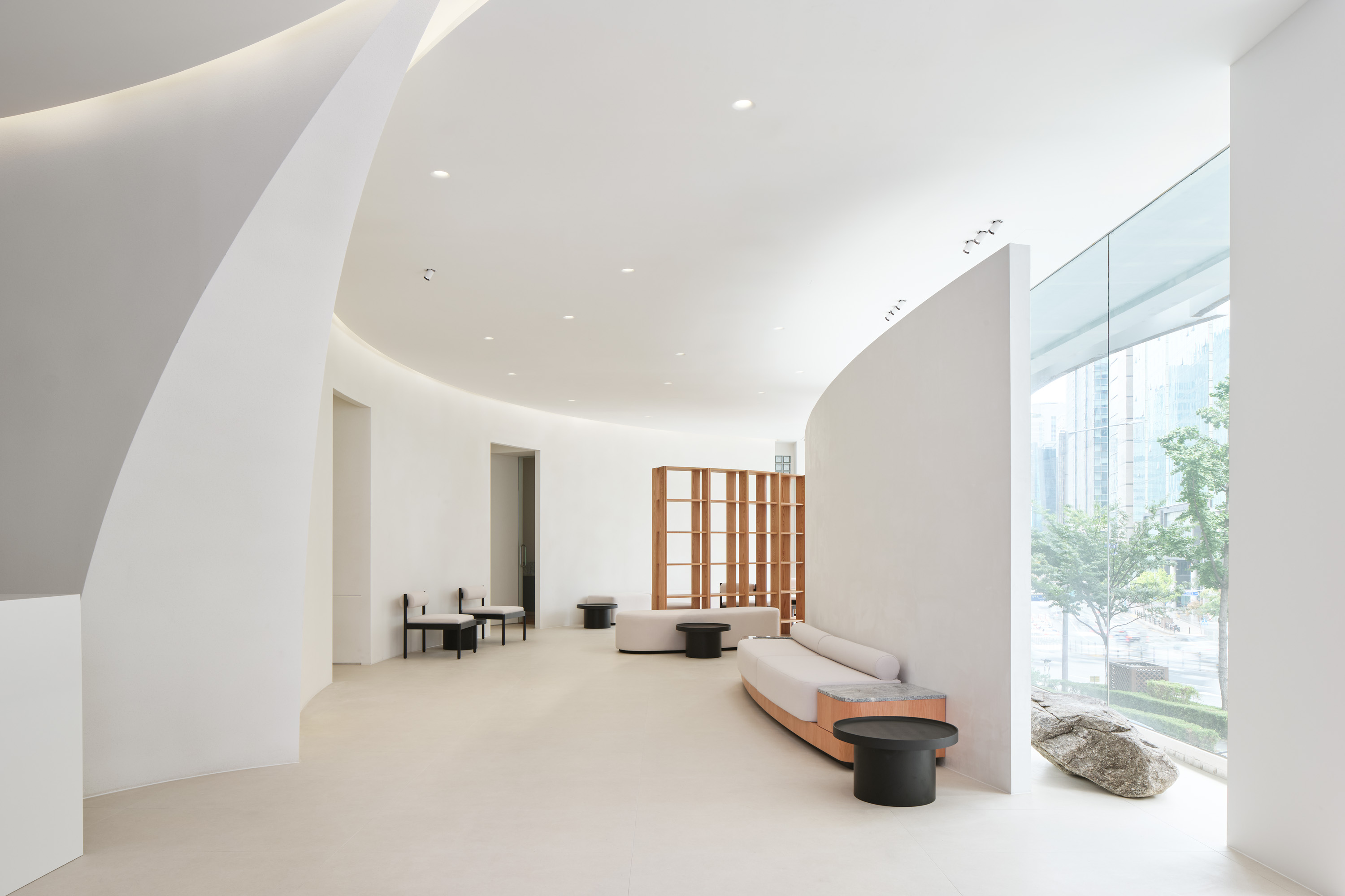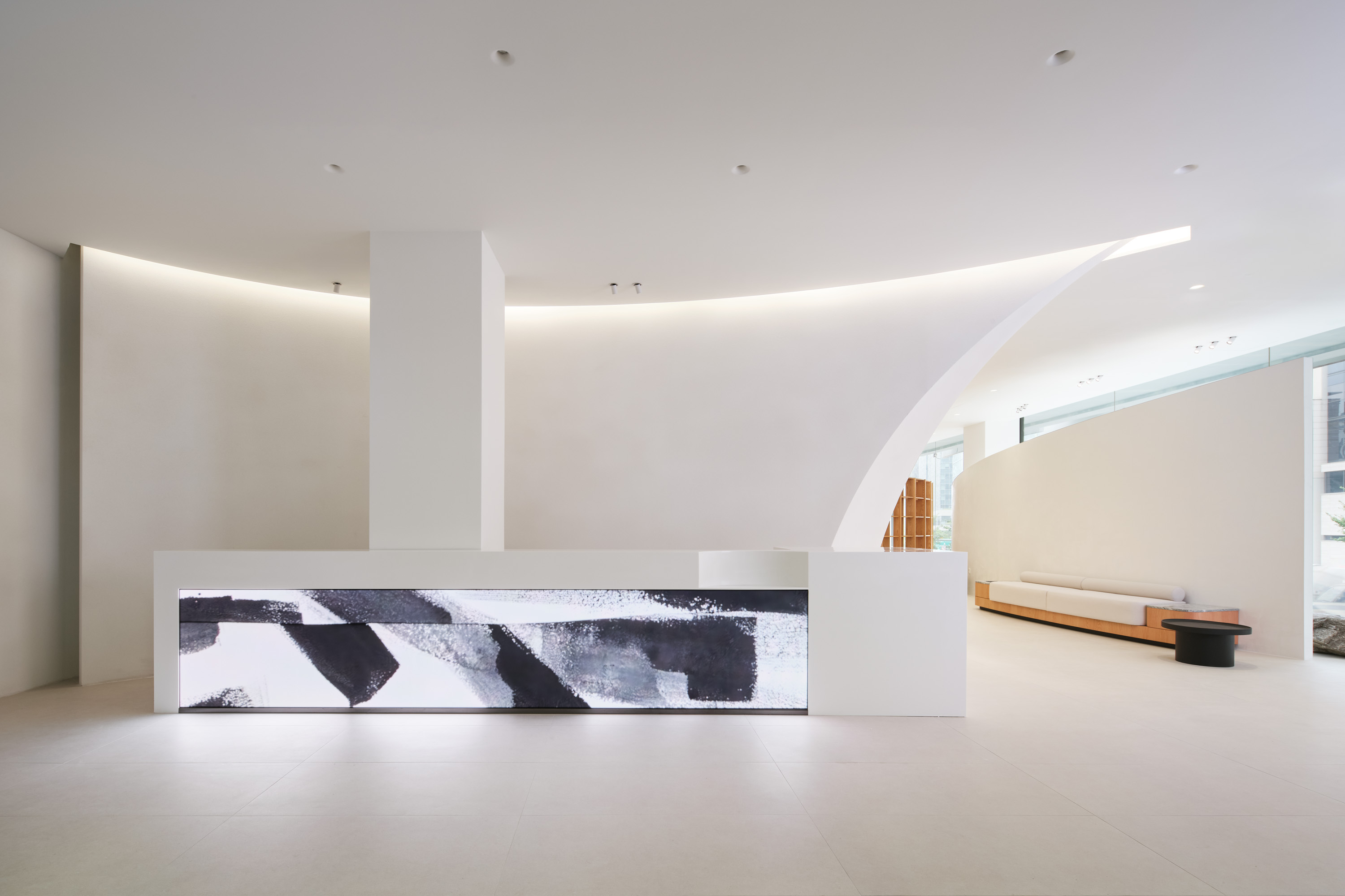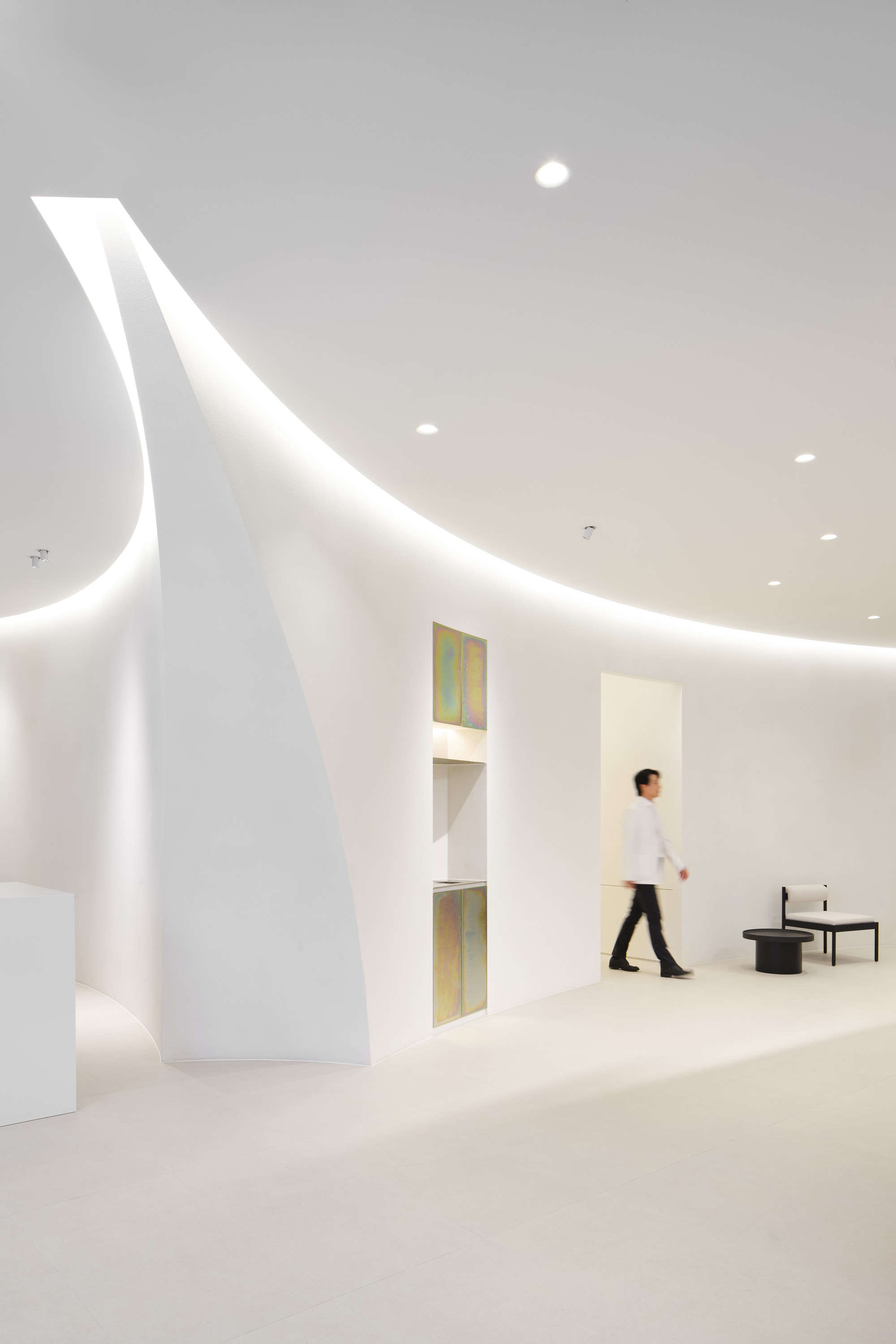 1층의 본사는 디자인 언어에 맞춰 병원의 효율성을 극대화 하는 것에 초점을 두었다. 병원 공간에 필요한 각 실들을 나열 후 시뮬레이션을 통해 효율적 동선을 고려하며, 움직임과 멈춤의 공간을 적절히 배치하고자 했다. 또한 미용과 치료의 외형적 범주를 넘어 빛, 향기, 음악 등과 시각적, 후각적, 청각적 요소를 은유적으로 공간에 표현하며 감각적 경험이 고객의 심리적 치유로 이어질 수 있도록 제시하고자 했다.