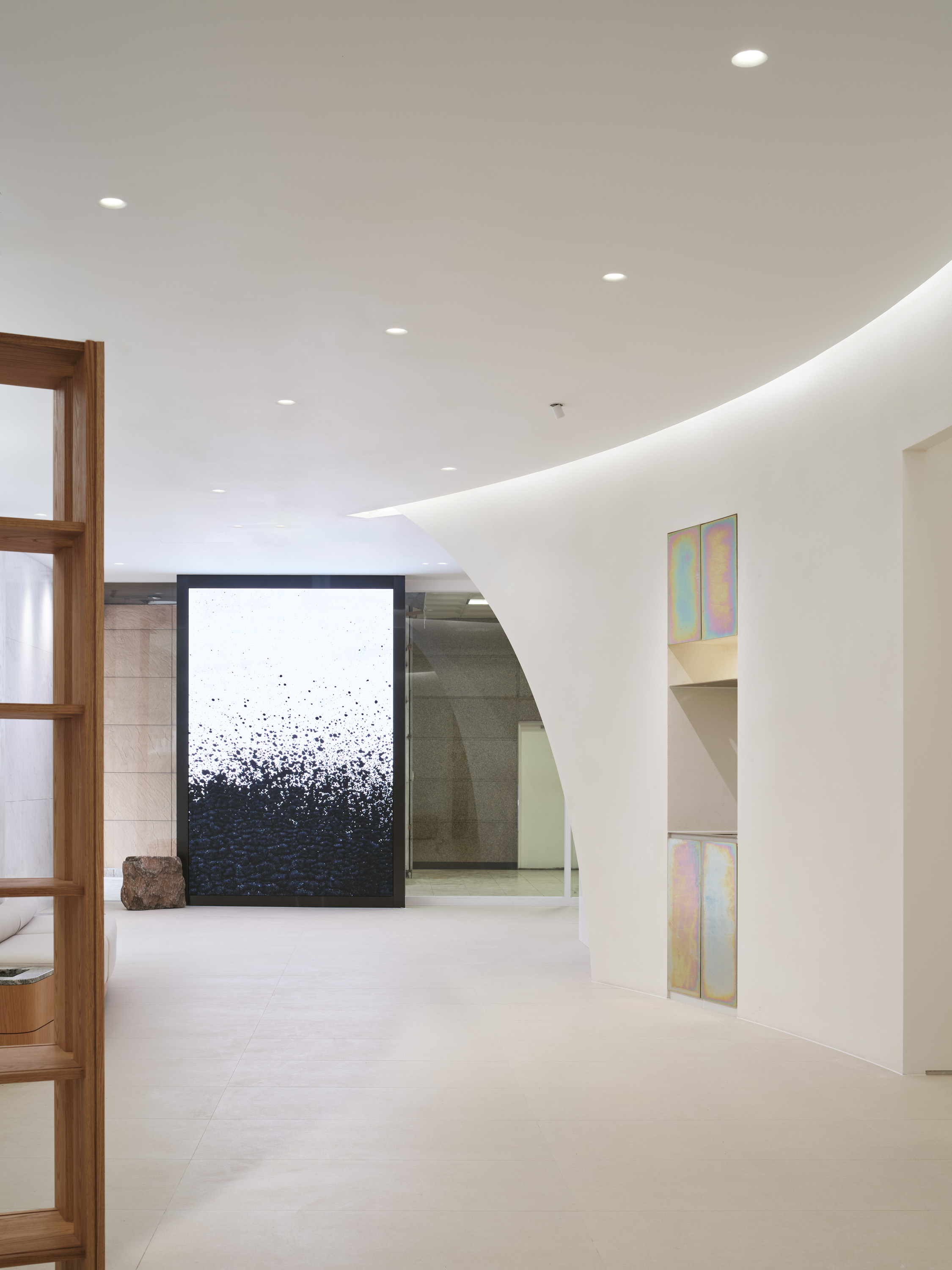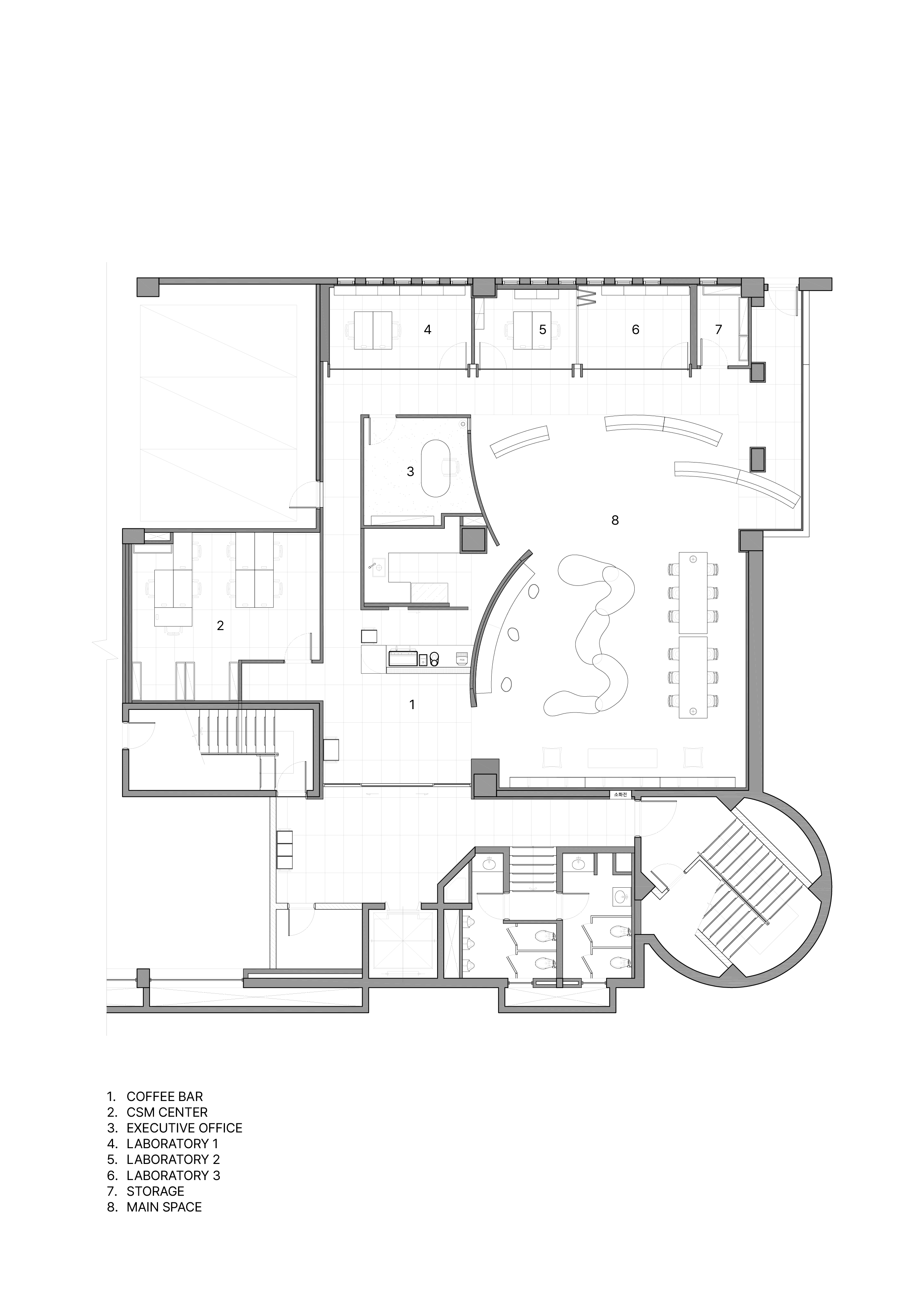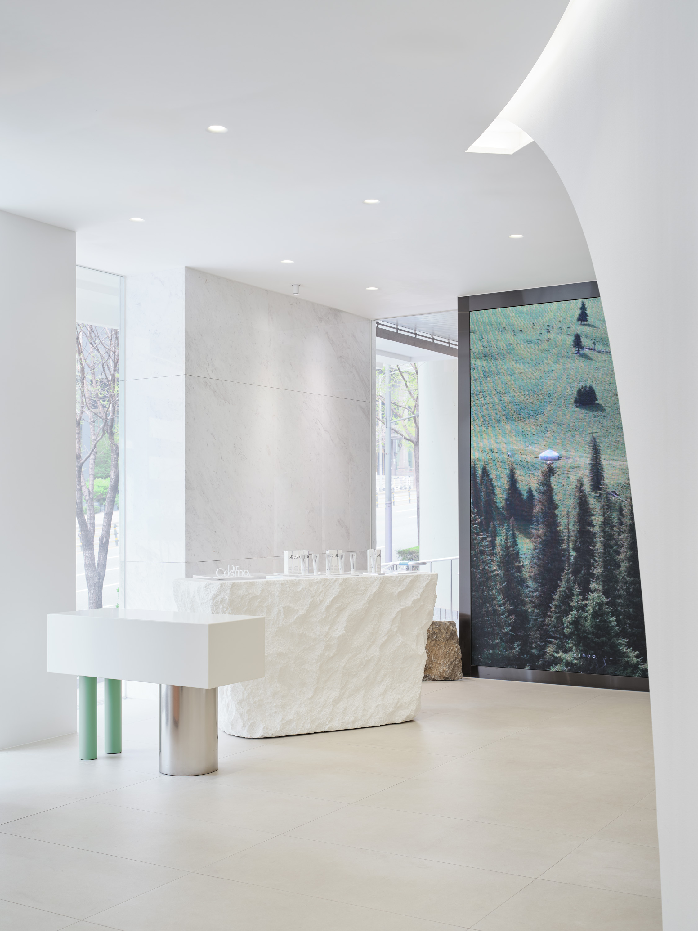 1층의 본사는 디자인 언어에 맞춰 병원의 효율성을 극대화 하는 것에 초점을 두었다. 병원 공간에 필요한 각 실들을 나열 후 시뮬레이션을 통해 효율적 동선을 고려하며, 움직임과 멈춤의 공간을 적절히 배치하고자 했다. 또한 미용과 치료의 외형적 범주를 넘어 빛, 향기, 음악 등과 시각적, 후각적, 청각적 요소를 은유적으로 공간에 표현하며 감각적 경험이 고객의 심리적 치유로 이어질 수 있도록 제시하고자 했다.