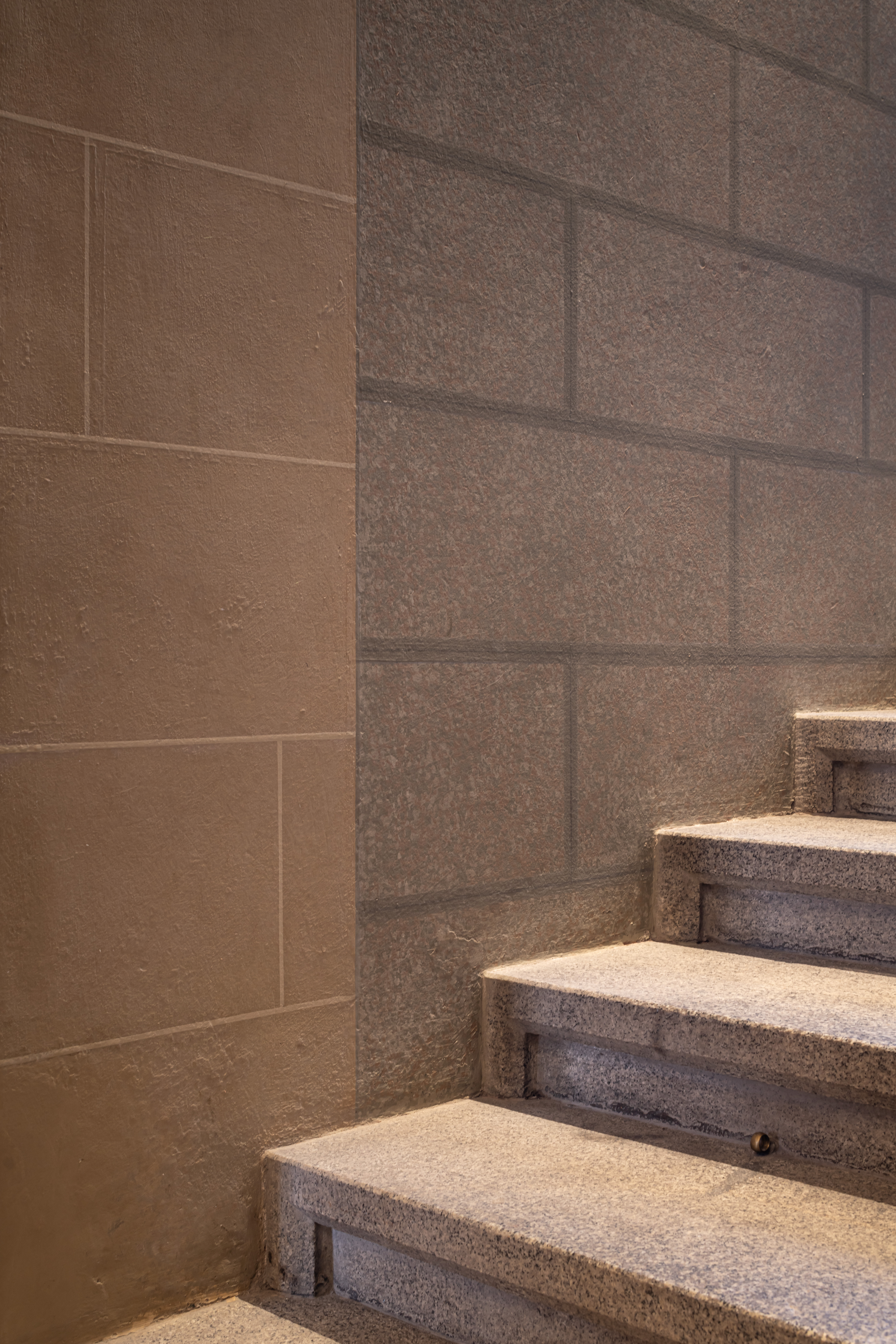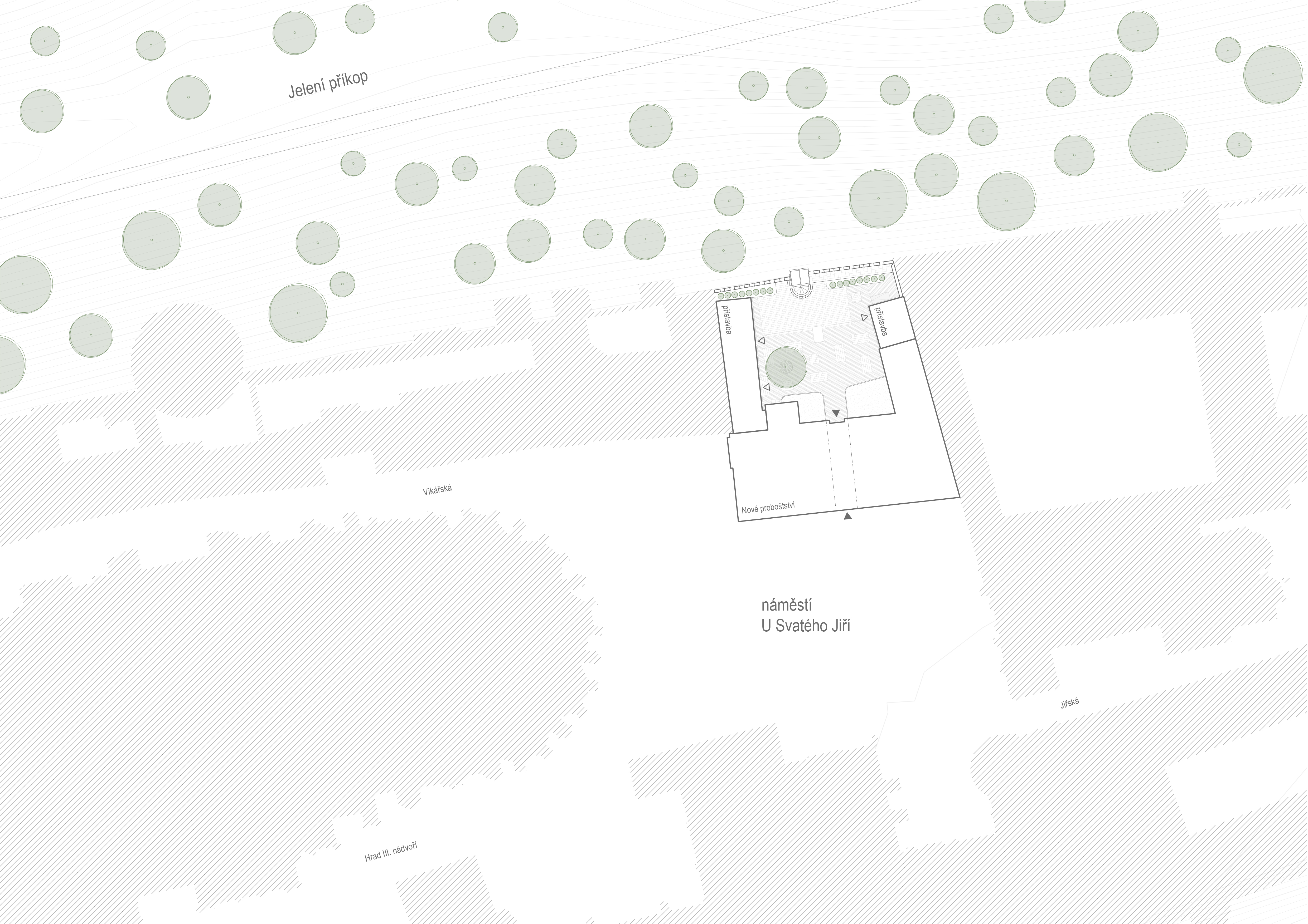 새로 증축하는 건물은 예전의 부속 건물이 있던 자리에 두 개 새로 지어졌습니다. 하나는 카페로, 다른 하나는 다목적 상업 공간으로 사용됩니다. 이 확장 건물들은 유리 입면재료를 사용해 채광이 잘 되게 했습니다. 서쪽 확장은 보다 개방적이고 수직적인 형태로, 식음료 서비스용으로 설계되었습니다. 동쪽 확장은 보다 컴팩트하고 폐쇄적인 형태로 다양한 용도로 사용될 수 있도록 디자인되었습니다. 새 건물에서 사용된 주요 재료는 Vyhnánov 채석장에서 가져온 사암 외장재, 파티네된 구리로 만든 세부 요소들, 섬세하게 조화를 이루는 타일과 나무 바닥, 그리고 미세한 강철 프레임을 가진 유리 외관이 특징입니다.