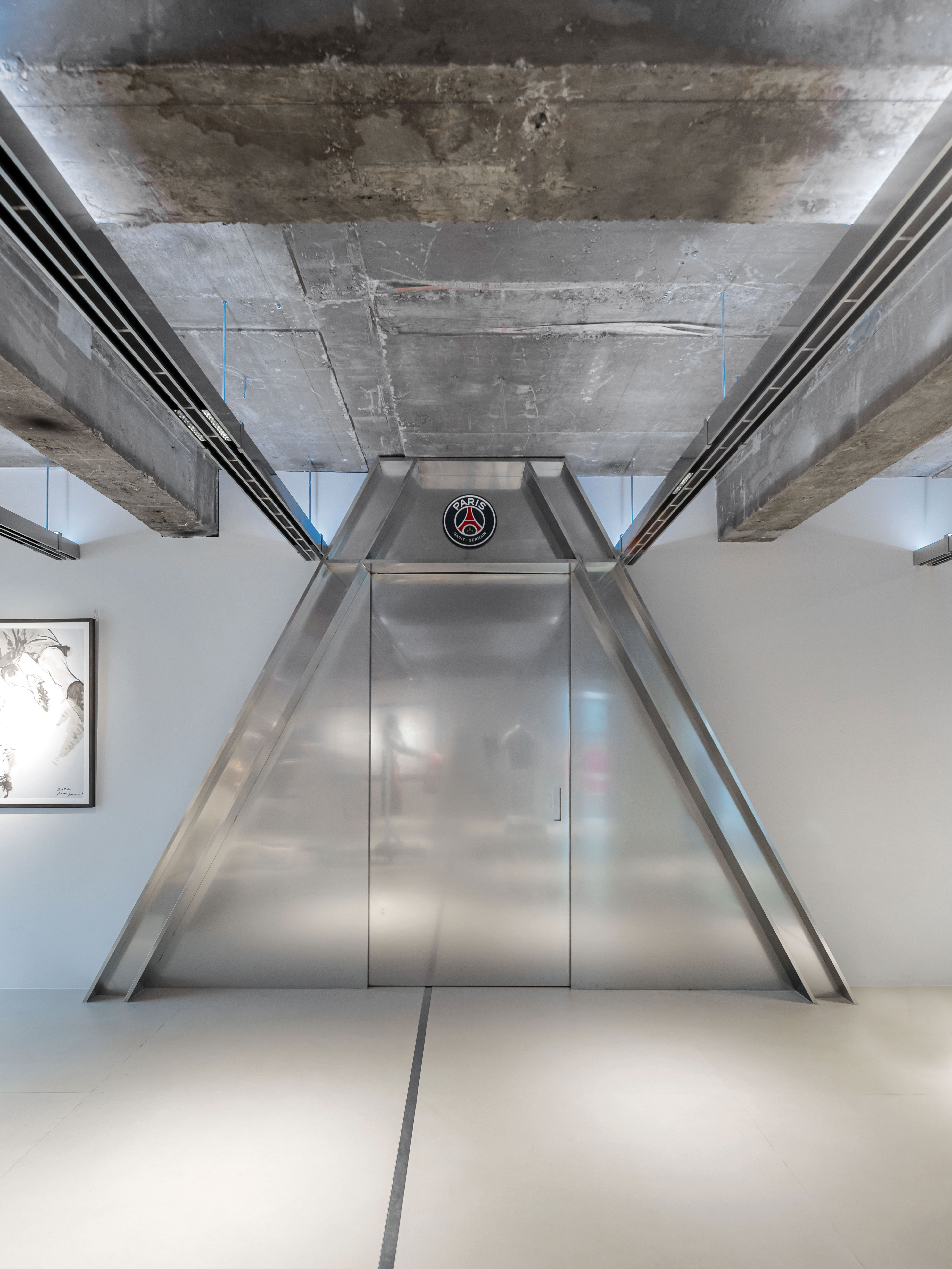 3층은 미래의 공간입니다. 유니폼 마킹, 이벤트들이 일어나는 이 공간은 노출콘크리트와 금속의 물성만 사용하여 1,2층과는 차별성을 두었고, 조명과 행거를 이동식으로 계획하여 이벤트가 일어날 때 공간을 바꿔서 사용할 수 있도록 하였습니다. 또한 이동식 행거와 디스플레이매대 또한 조립식 모듈형으로 계획하여 활용도를 늘릴 수 있도록 의도하였습니다. 지금은 키네틱 집기를 통해 움직이는 형태와 유니폼, 굿즈를 활용하여 브랜드를 더 깊게 체험할 수 있도록 계획되어 있습니다. PSG라는 브랜드를 수직적이고 다양한 컨텐츠로 기획하여 사용자들이 모든 층과 컨텐츠를 활용할 수 있는데 중점을 두었으며 다양한 디테일과 변화를 통해 오랫동안 이 공간이 사용되었으면 합니다. 또한 이 공간을 통해 PSG라는 브랜드와 팬들이 연결되고 커뮤니티가 더욱 더 활성화되기를 바라며 프로젝트를 진행하였습니다.