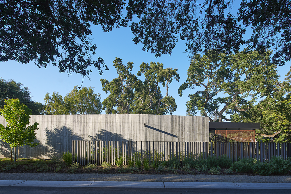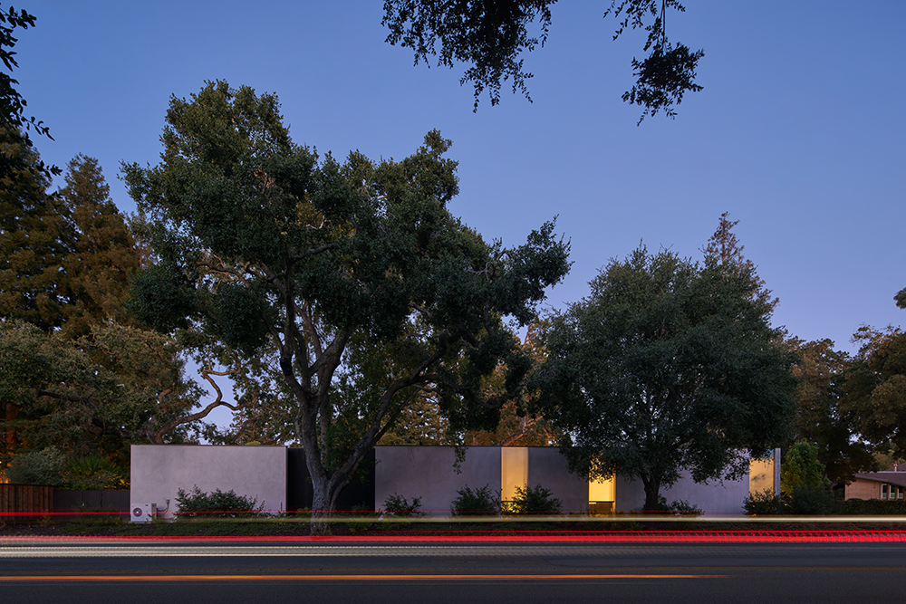 폐쇠적이어 보이지만 건축물 중앙에 마당이 있어서 건물의 내부는 여전히 개방적이고 넓은 느낌입니다. 이 집은 코너 부지의 앞쪽에 배치되었습니다. 소음을 피하기 위해 부지의 먼 곳으로 건물을 배치하는 대신 건축가는 건물을 도로와 가까이 배치하고 도로를 등지도록 설계했습니다. 그들은 부지 전체에서 소음 수준을 측정하여 4인 가족이 받아들일 수 있는 적절한 소음 수준을 파악했습니다. 그 다음 그들은 원하는 소리의 데시벨 수준을 얻기 위해 적절한 길이, 높이, 재료의 방음벽을 찾아내는 방식으로 디자인 문제를 거꾸로 해결했습니다. 그 결과 4미터 높이의 보드형 콘크리트 벽을 만들었습니다.