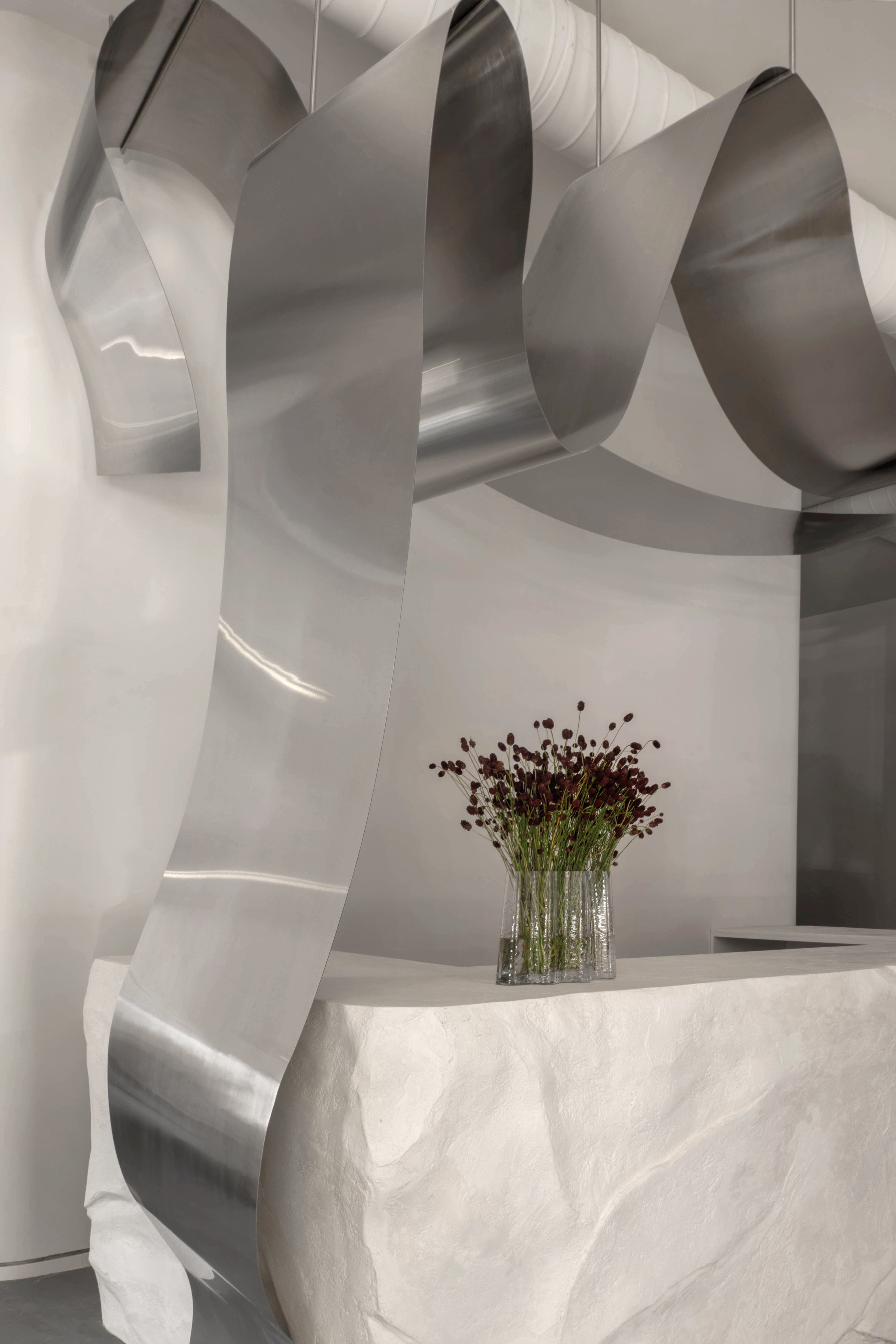 벽 마감으로는 두 가지 비슷한 색상의 석고가 사용되어 금속으로 만든 장식 선반이 돋보입니다. 바닥에는 거친 콘크리트를 그대로 두어 벽의 부드러움을 강조했습니다. 리셉션 데스크 위에는 대형 금속 스트립이 설계되어 천장에서 바닥으로 미끄러지며 회전하며 원형 벽과 선반을 지탱합니다. 매장 중앙에는 다양한 높이와 형태의 테이블이 배치되어 제품을 전시할 수 있습니다.