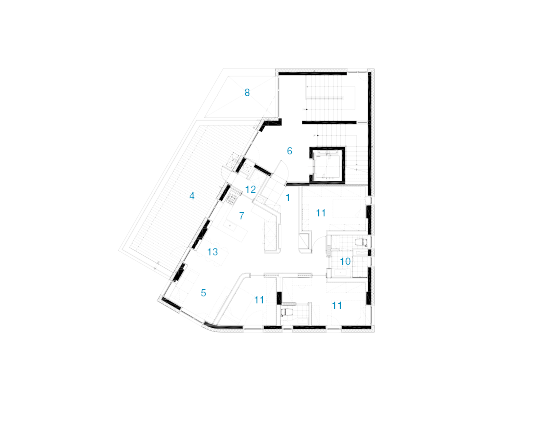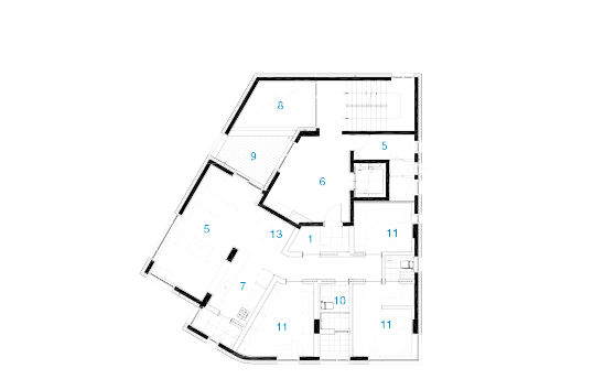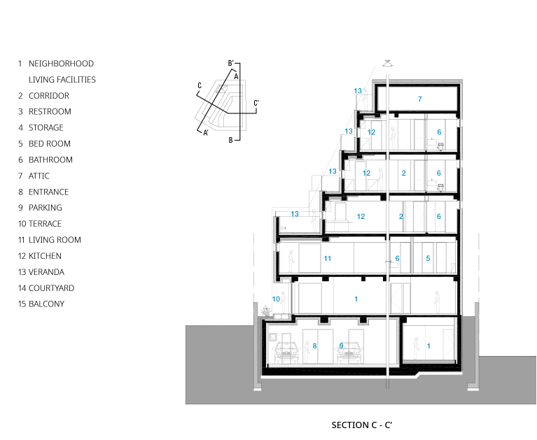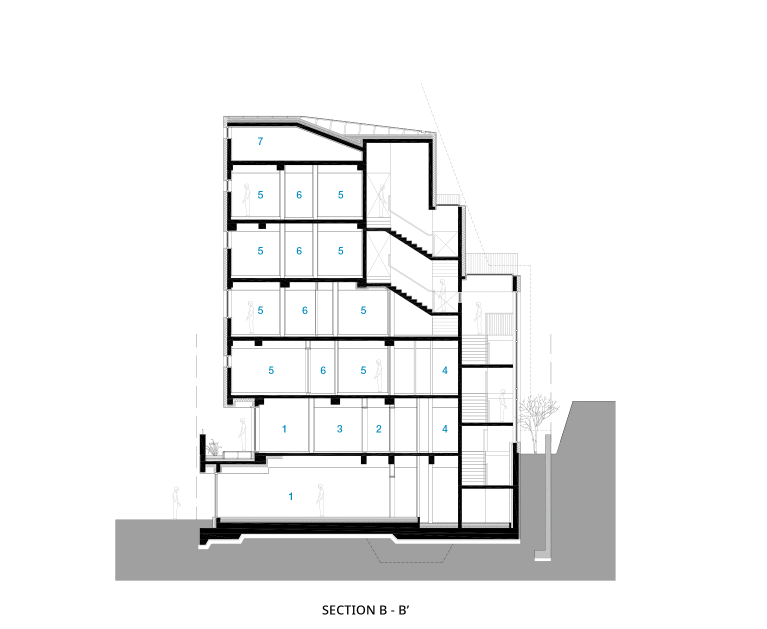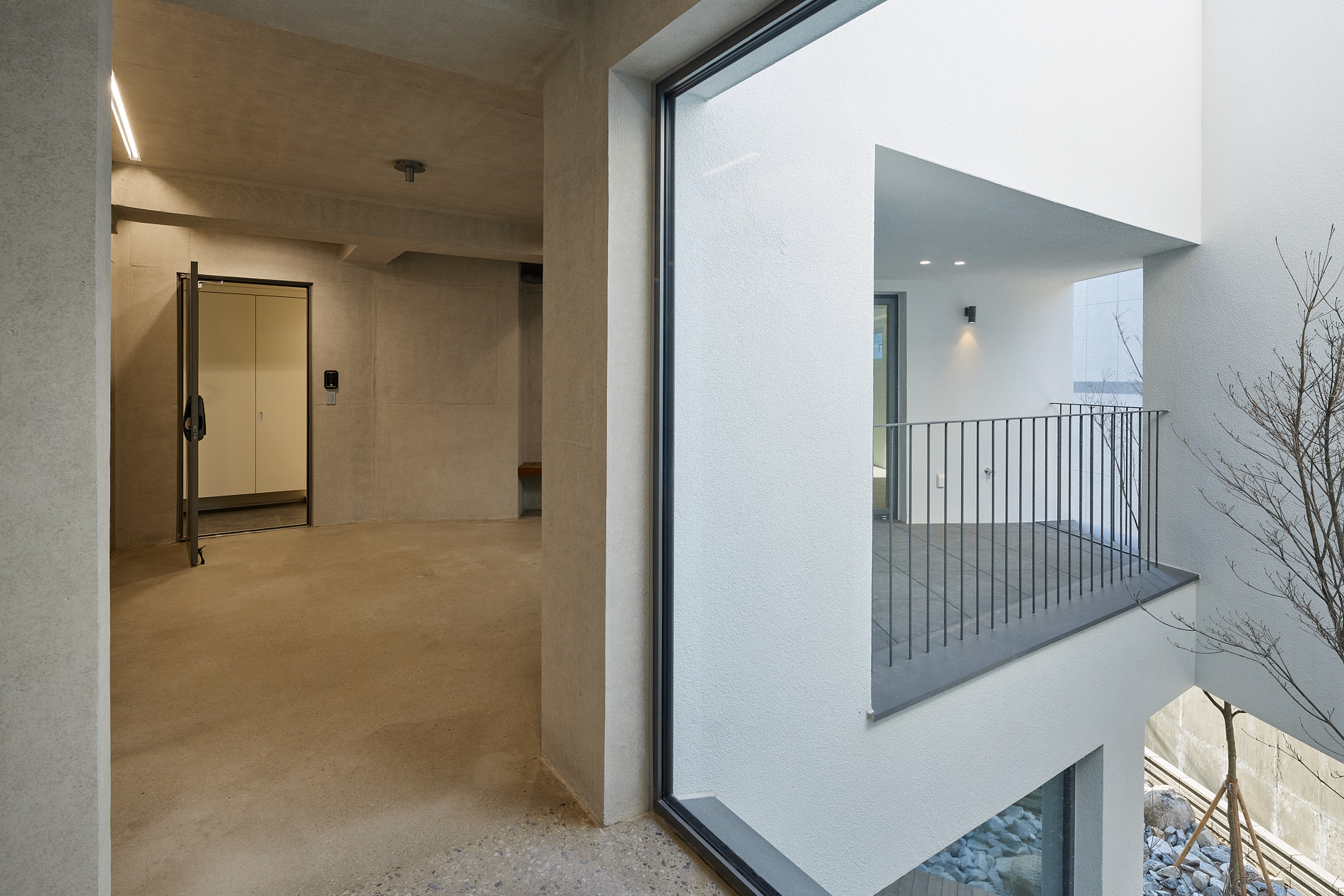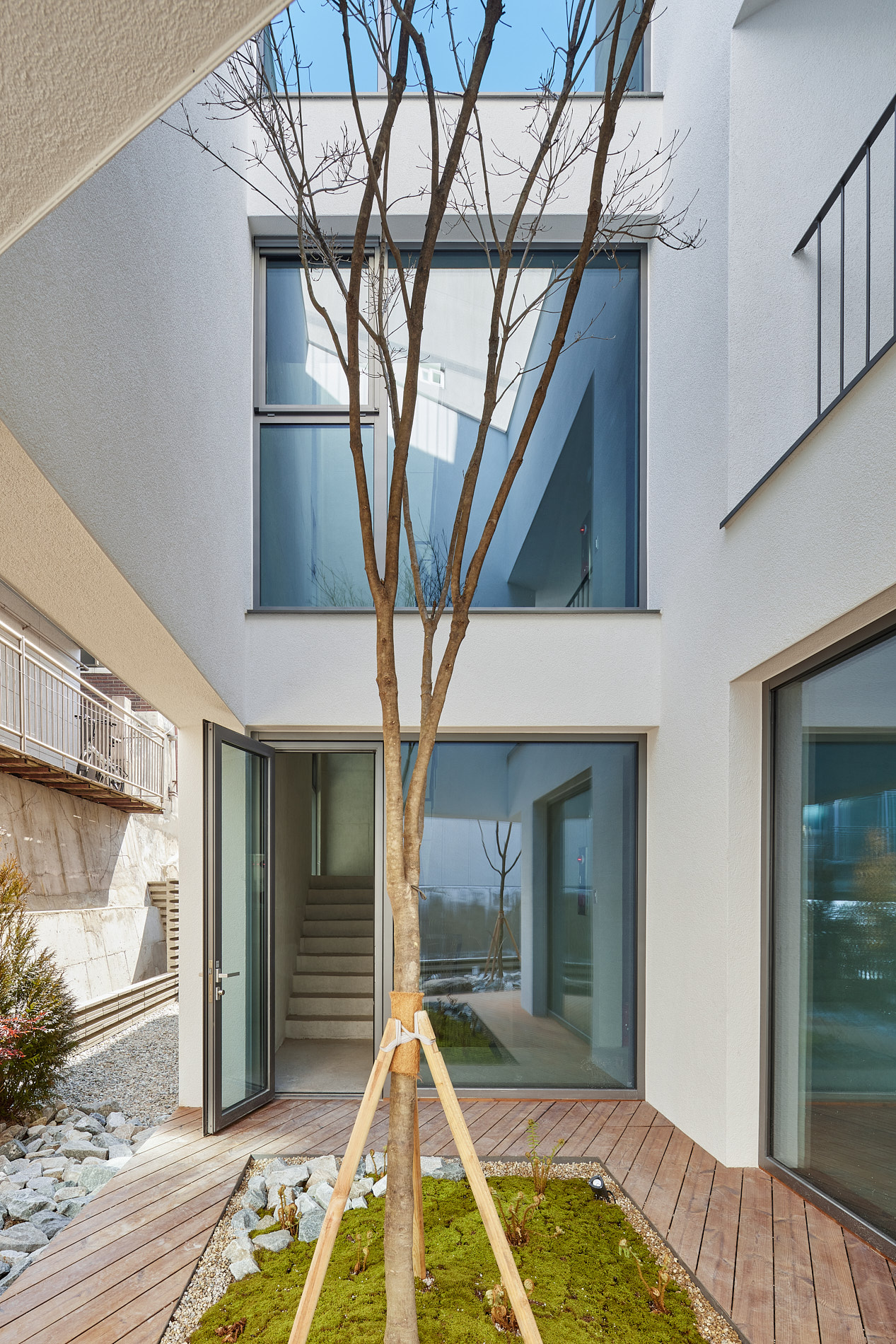 정유헌의 중정, 공용 공간, 외부 데크는 자연과 접하며 건축과 사람, 자연이 소통하는 방식을 보여주는 공간이다. 1층 중정을 통해 건물 내부까지 자연광이 들어오며, 순환되는 공기가 밝고 쾌적한 환경을 만든다. 1층부터 3층까지의 계단실은 중정과 연결된다. 3층부터 5층까지는 계단실과 홀의 천창과 창을 통해 계절의 변화를 느낄 수 있다. 특히, 각 층의 외부 데크는 작은 마당 역할을 하여 계절, 날씨의 변화에 따라 다양한 외부 활동이 가능하다.