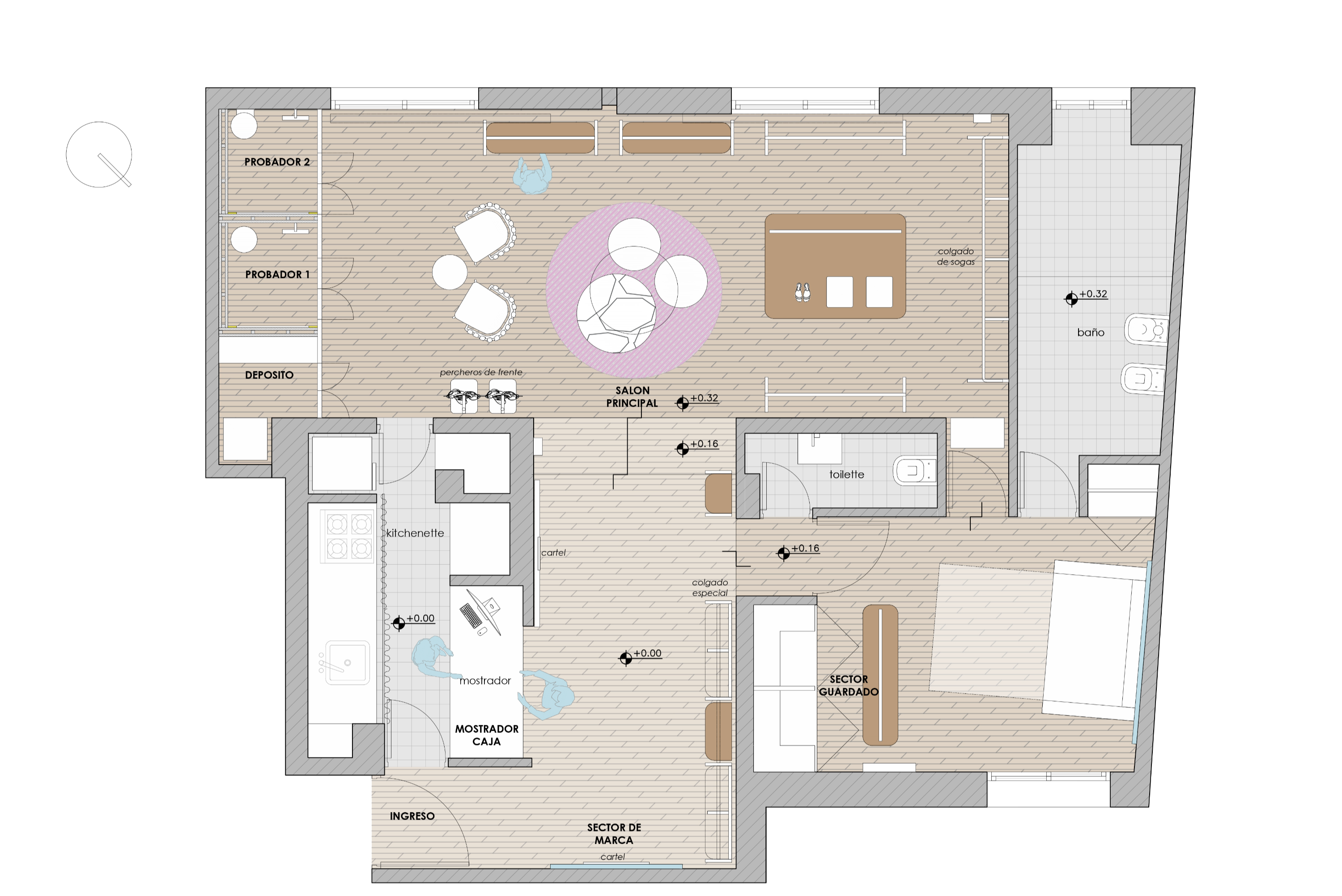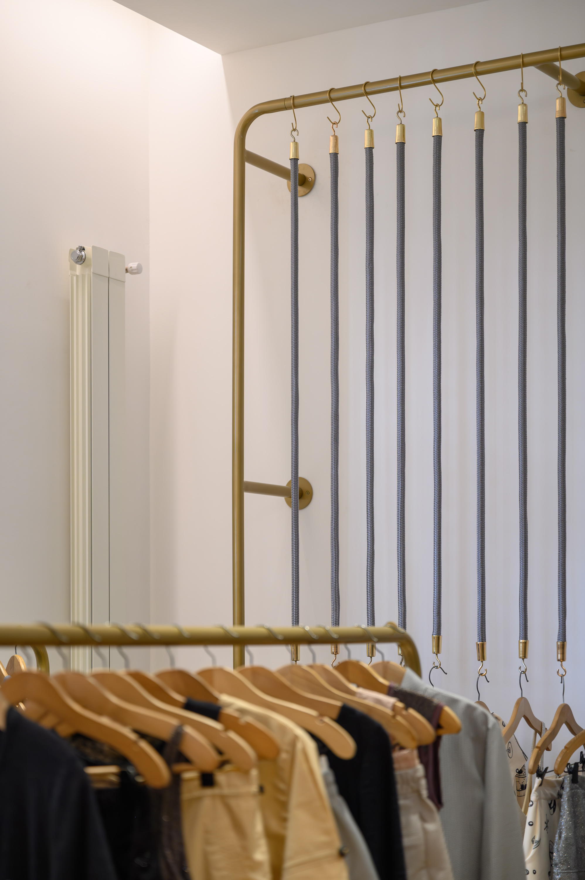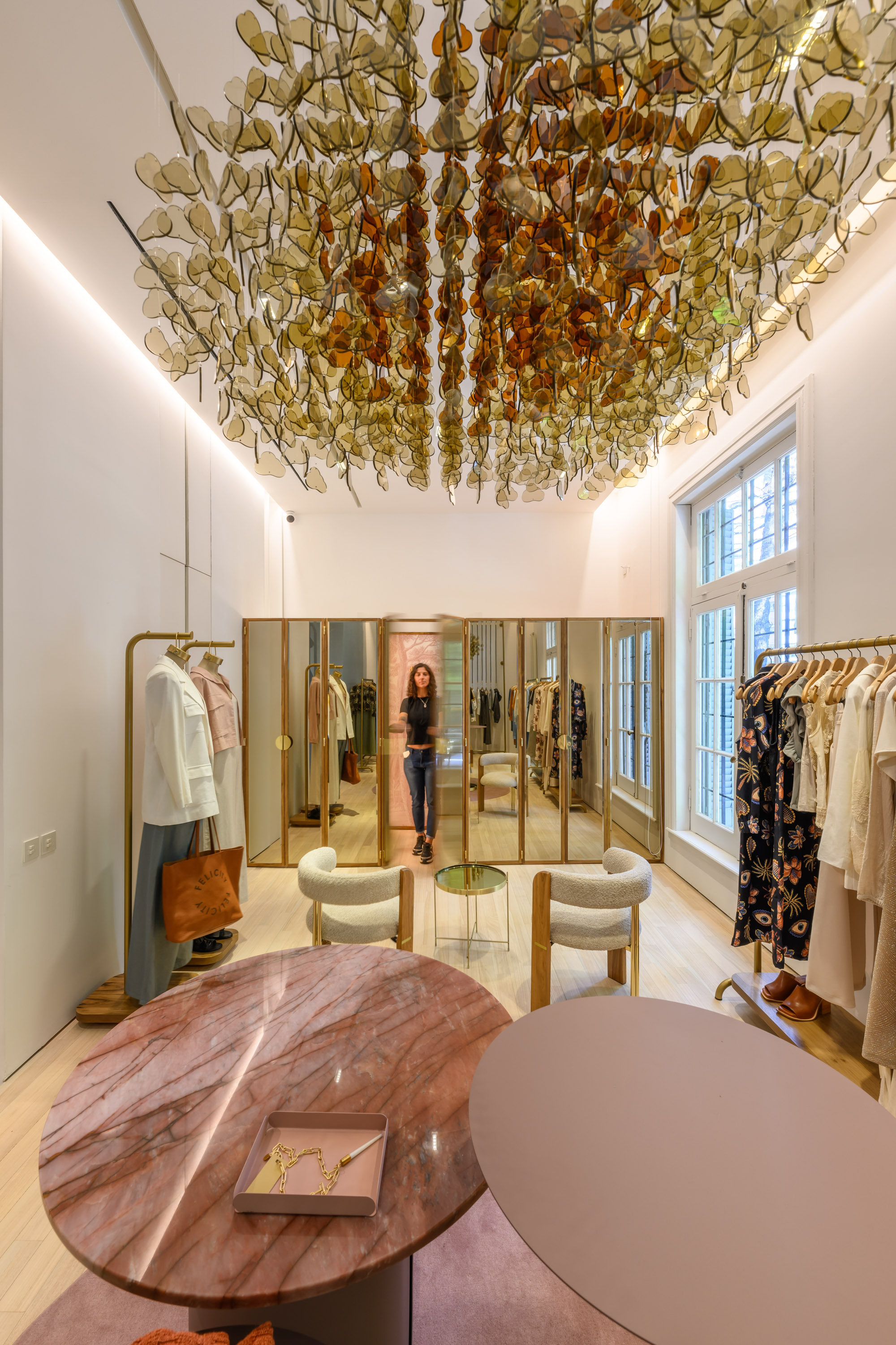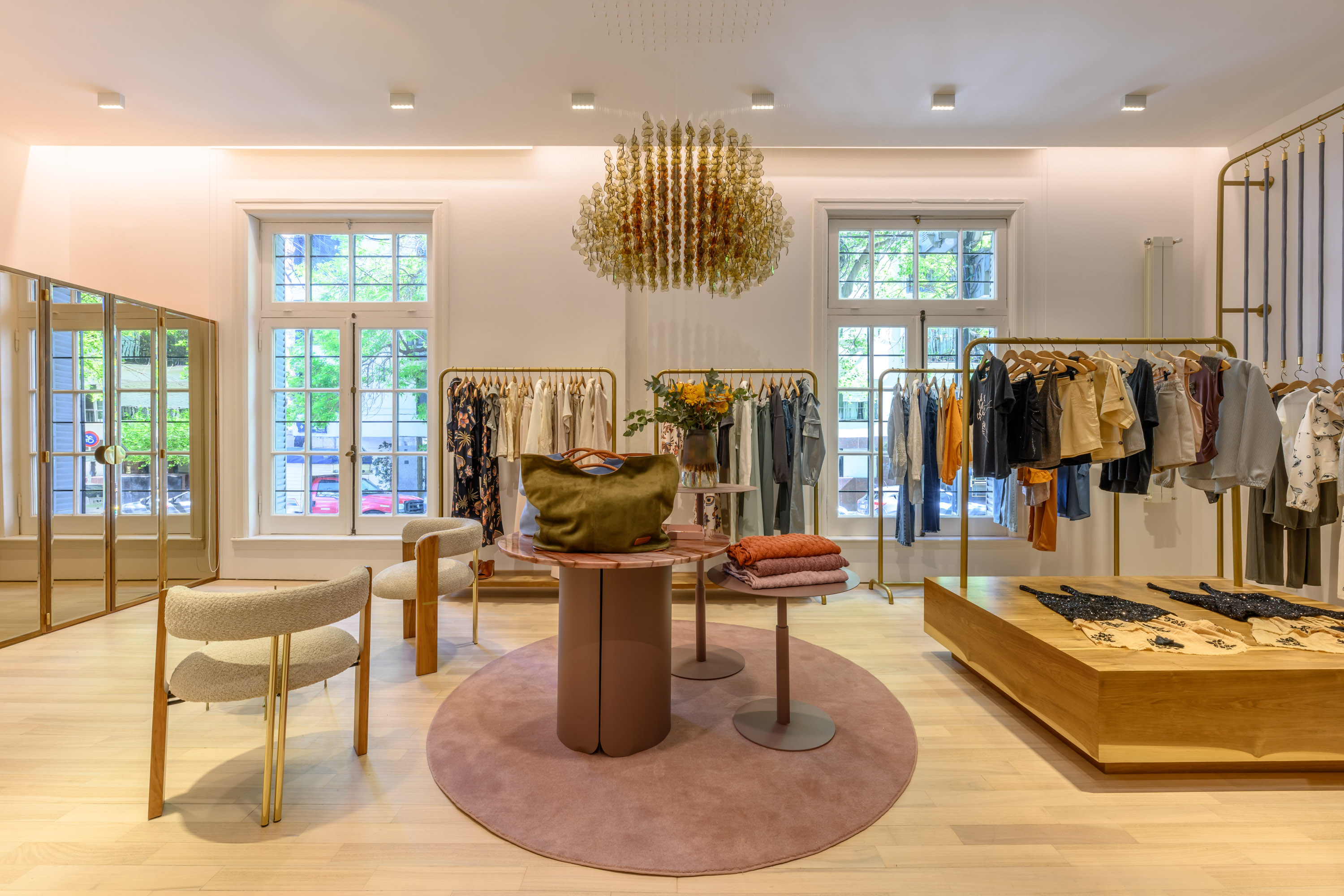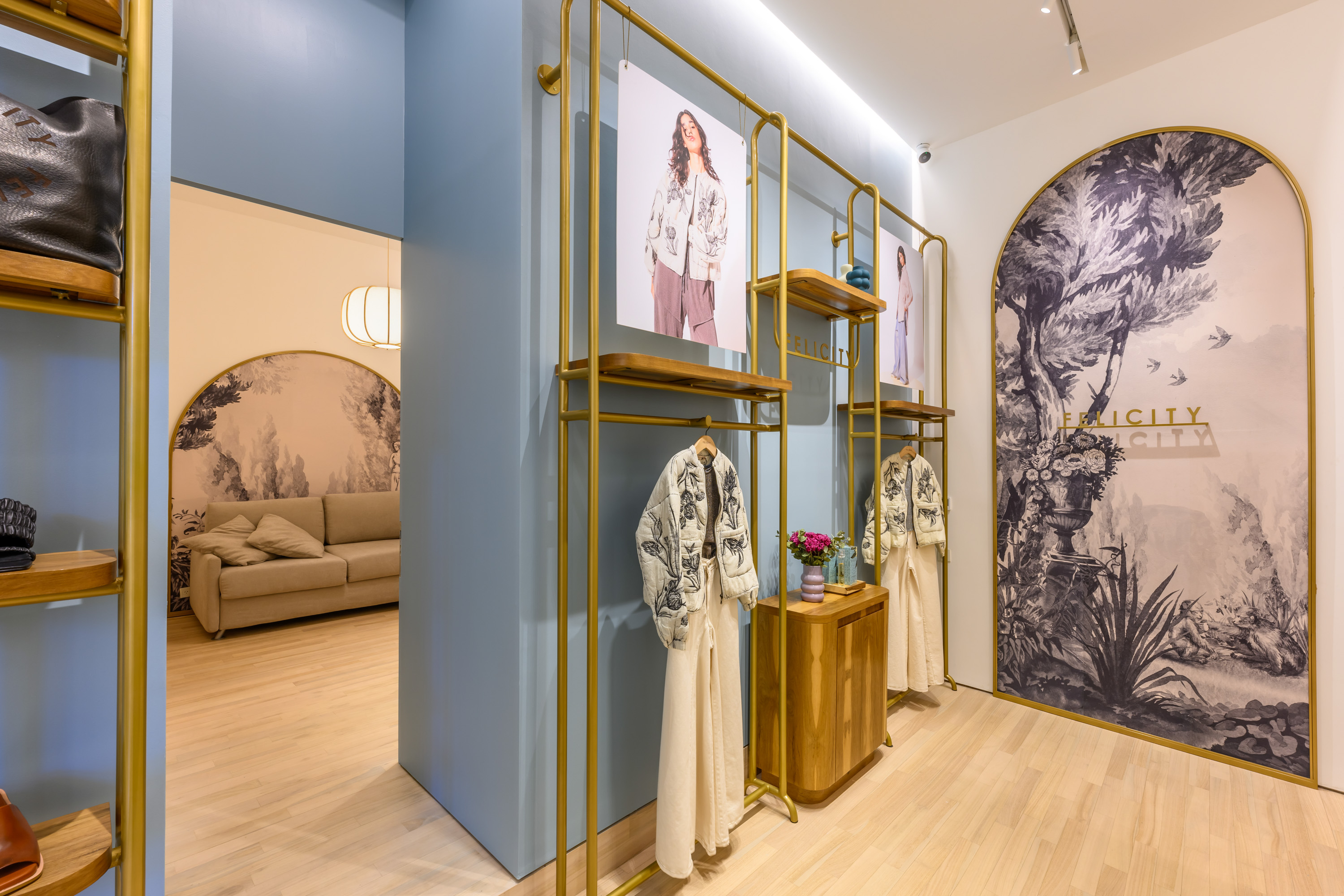 Felicity 쇼룸은 고객들에게 맞춤형 서비스를 제공하기 위해 준비 중입니다. 황금색 옷걸이, 부드러운 곡선, 페티리비 나무와 브론즈 색상의 거울을 결합하고, 벽지에 담긴 이야기들은 이 브랜드가 제공하는 독특한 경험을 더욱 돋보이게 합니다. 코르도바 브랜드인 Felicity는 우아하고, 스포츠적이며, 세련되면서도 동시에 고급스러운 스타일을 지닌 독창적인 위기를 표현합니다. #MuyFelicity라는 슬로건 아래, Felicity는 매력적인 여성의 모든 면을 담고 있습니다.