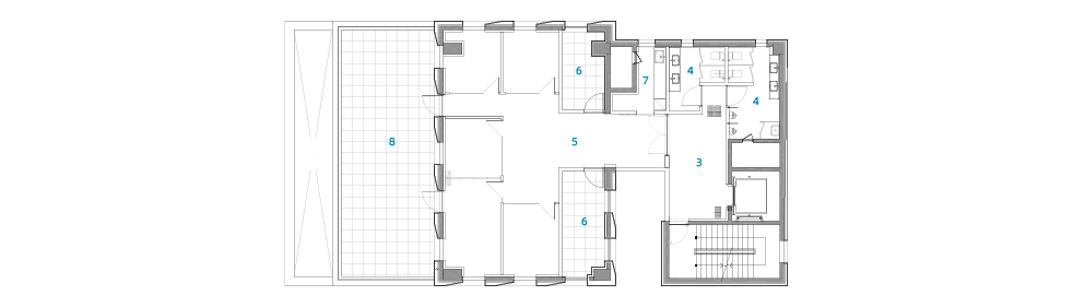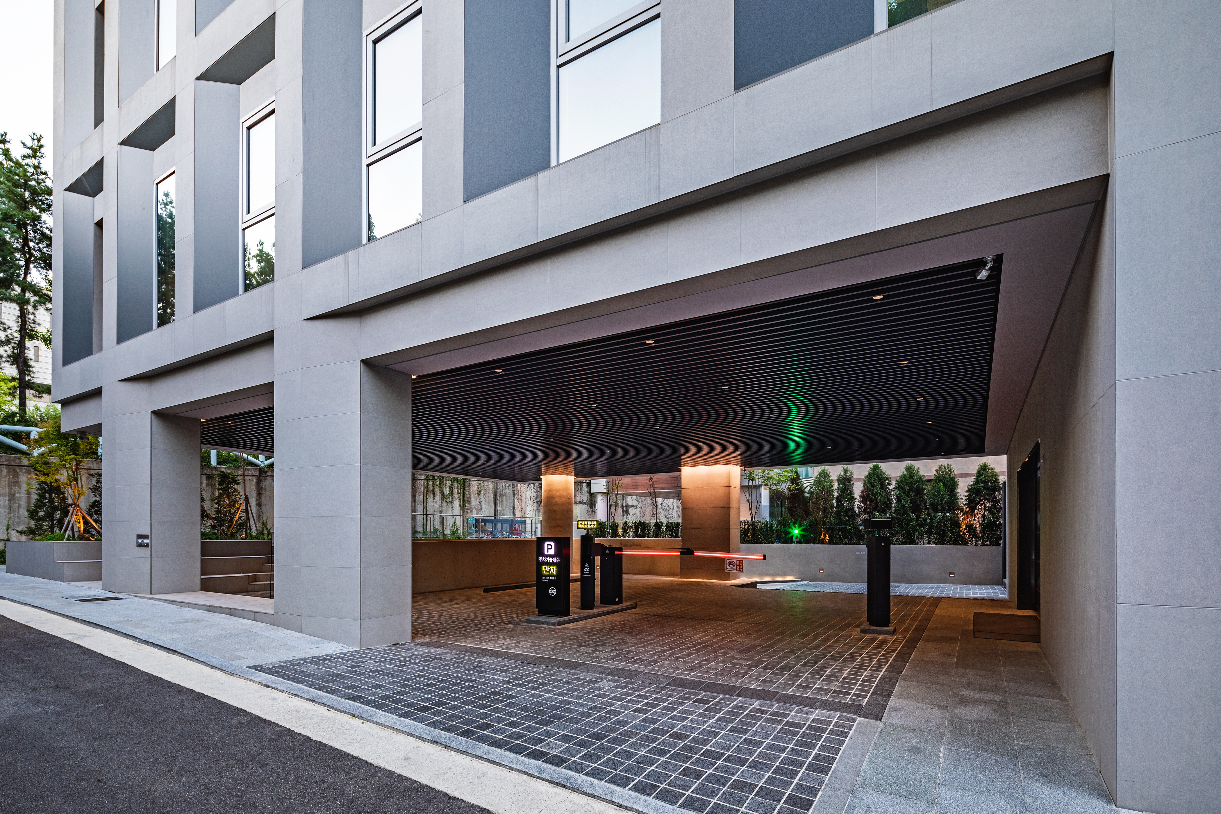 주 진입부는 도로에 직접 면하지 않고 필로티를 활용했으며, 출입문은 건물의 개방감을 부여하고 필로티 하부로 진입 동선을 연장하여 배치했다. 주차장의 진입로는 자주식 주차장의 설치에 따라 자연스럽게 반원형의 곡선 램프로 이어진다. 이 반원형의 곡면을 따라 나선형의 계단을 두어 지하 1층의 선큰 공간과 건축주를 위해 마련된 갤러리와 연결했다.