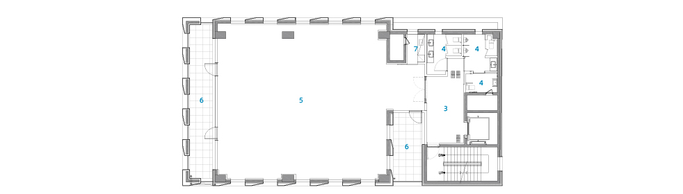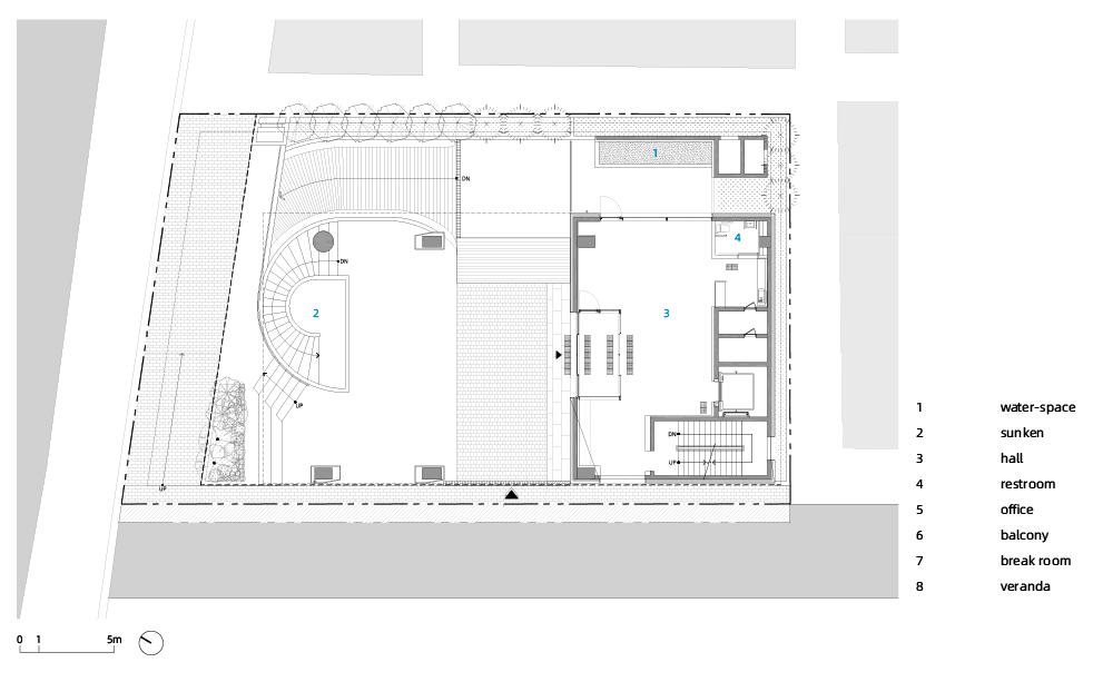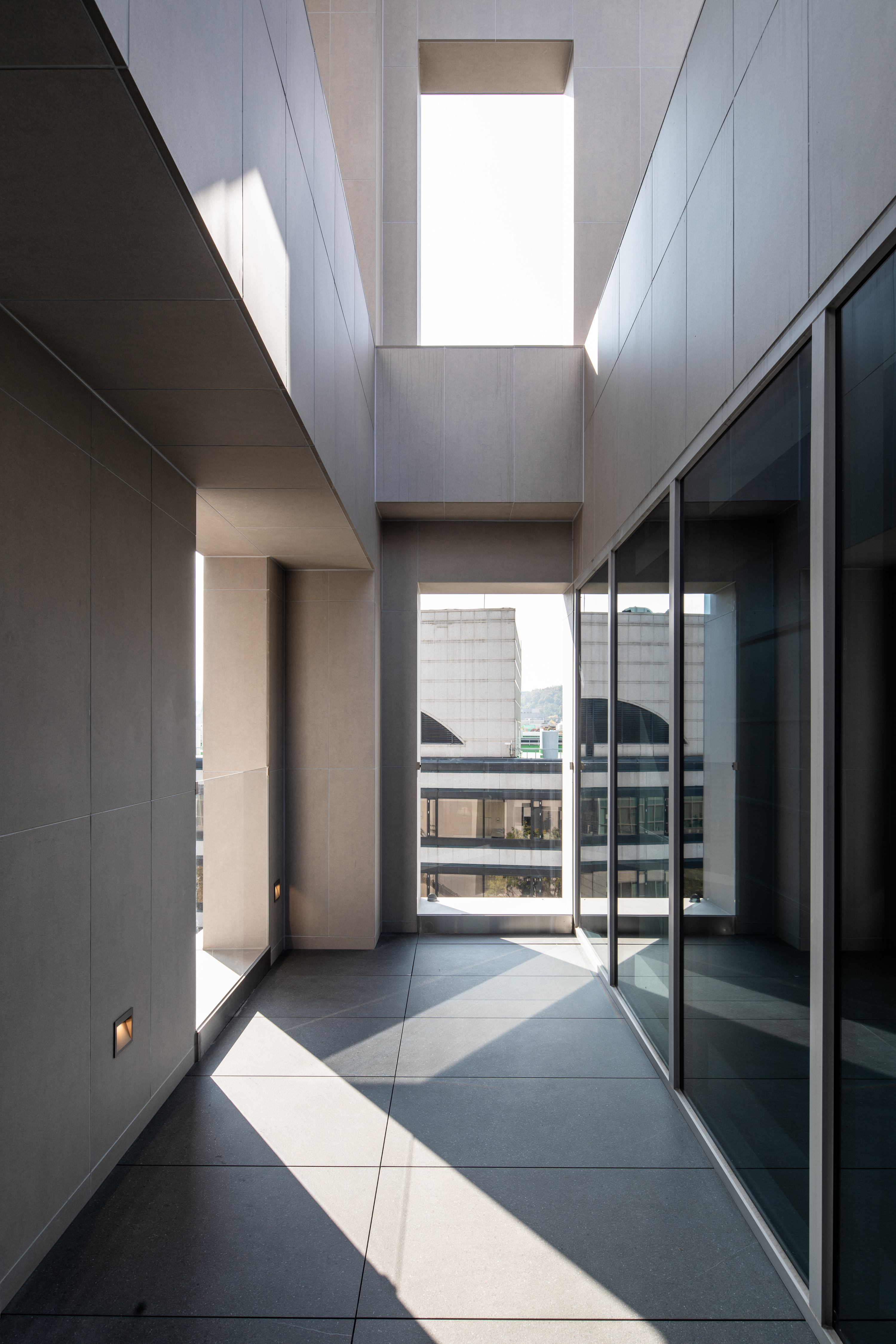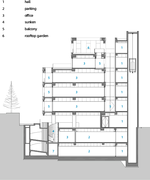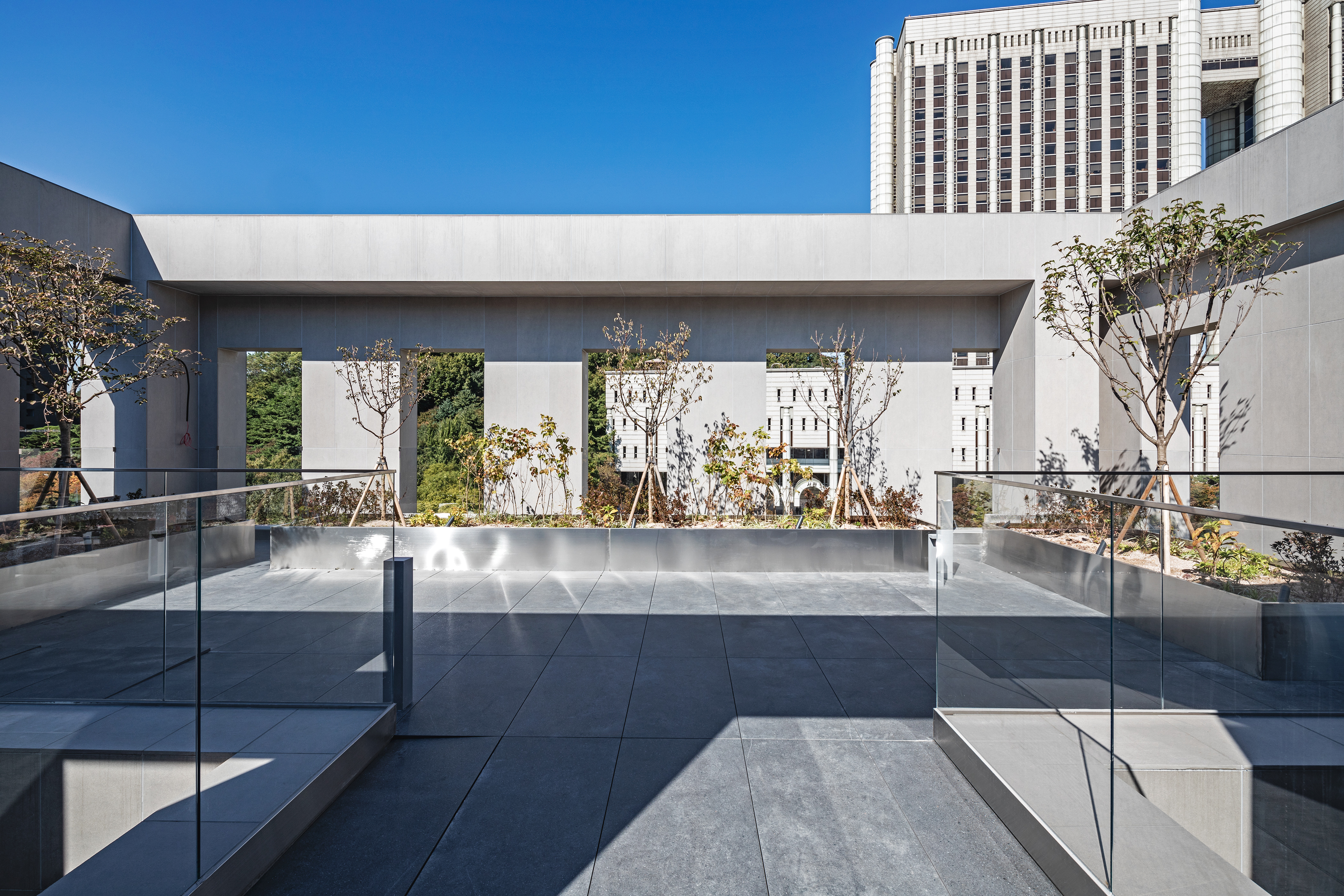 지상 5층과 옥상에는 정원이 있어 임차인의 휴게 공간과 건축주의 문화 활동에 사용된다. 건축물의 동측에는 2.4m의 벽천이 있어 인접한 건축물과의 시각적인 간섭을 완화하고 법조단지 주변의 복잡한 소음을 막아준다. 북측에는 층별로 발코니가 있어 자연을 느낄 수 있는 서리풀공원과 건축가 김수근이 설계한 법원 청사의 파사드를 마주할 수 있다.