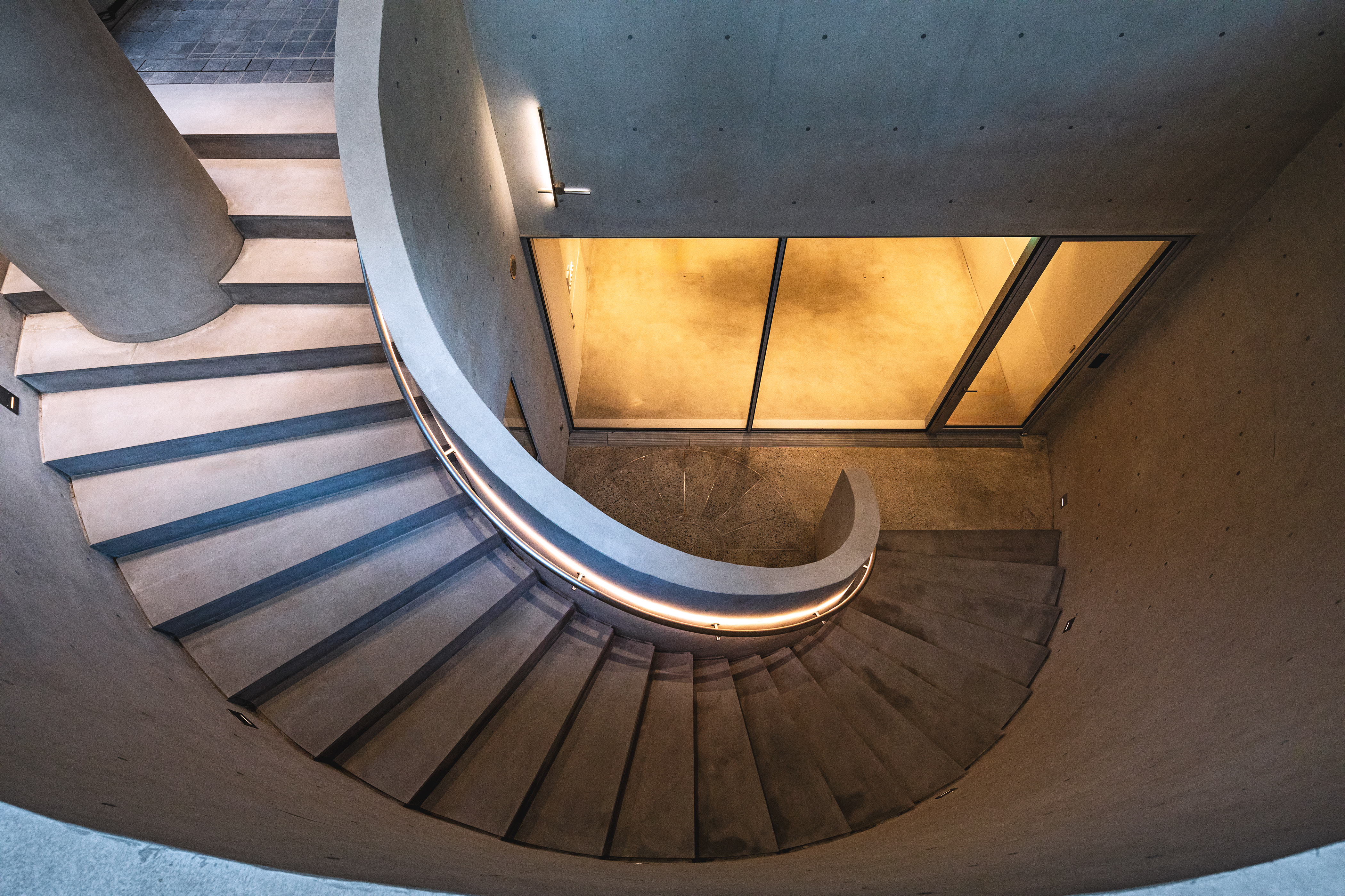 주 진입부는 도로에 직접 면하지 않고 필로티를 활용했으며, 출입문은 건물의 개방감을 부여하고 필로티 하부로 진입 동선을 연장하여 배치했다. 주차장의 진입로는 자주식 주차장의 설치에 따라 자연스럽게 반원형의 곡선 램프로 이어진다. 이 반원형의 곡면을 따라 나선형의 계단을 두어 지하 1층의 선큰 공간과 건축주를 위해 마련된 갤러리와 연결했다.