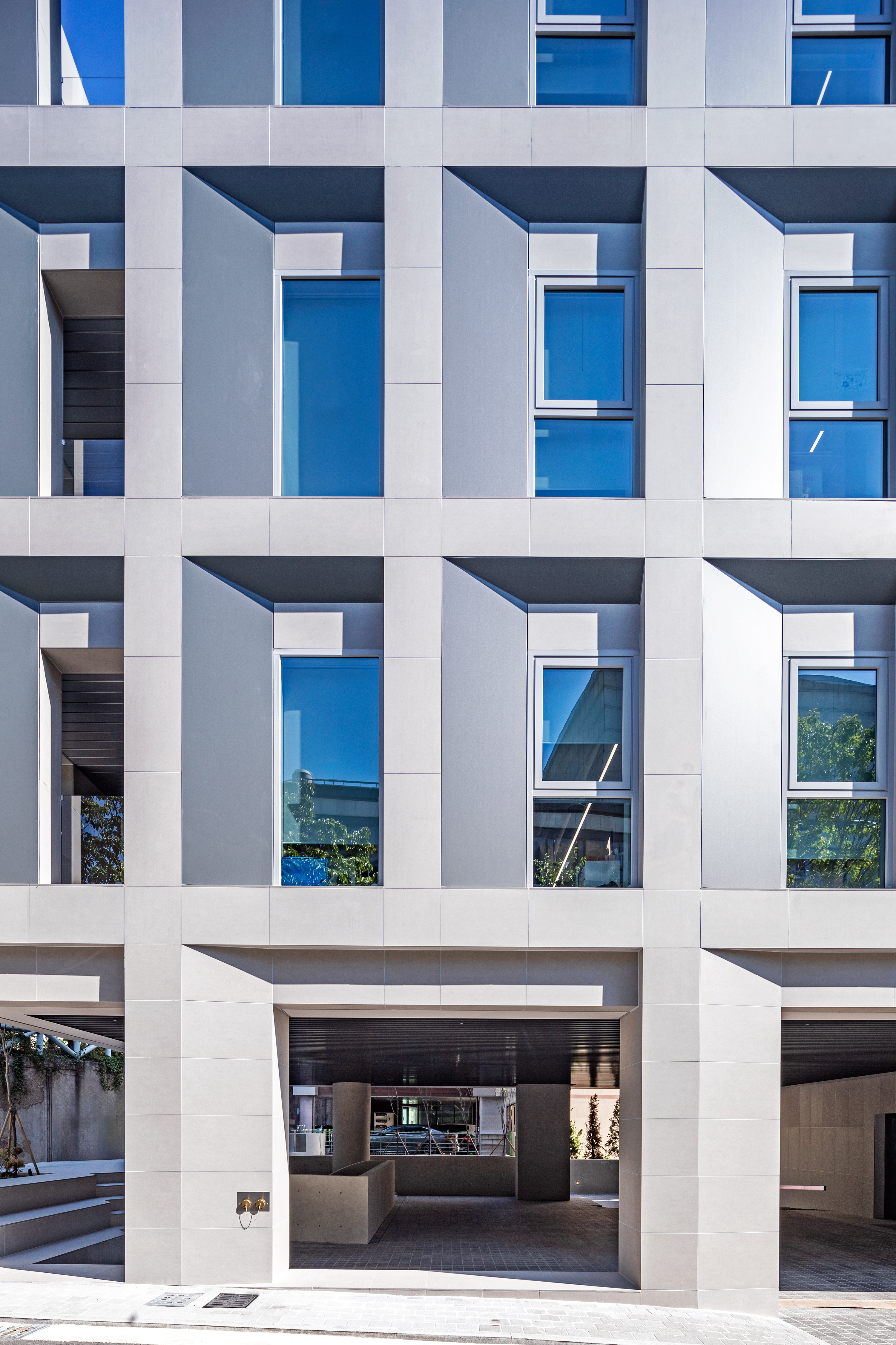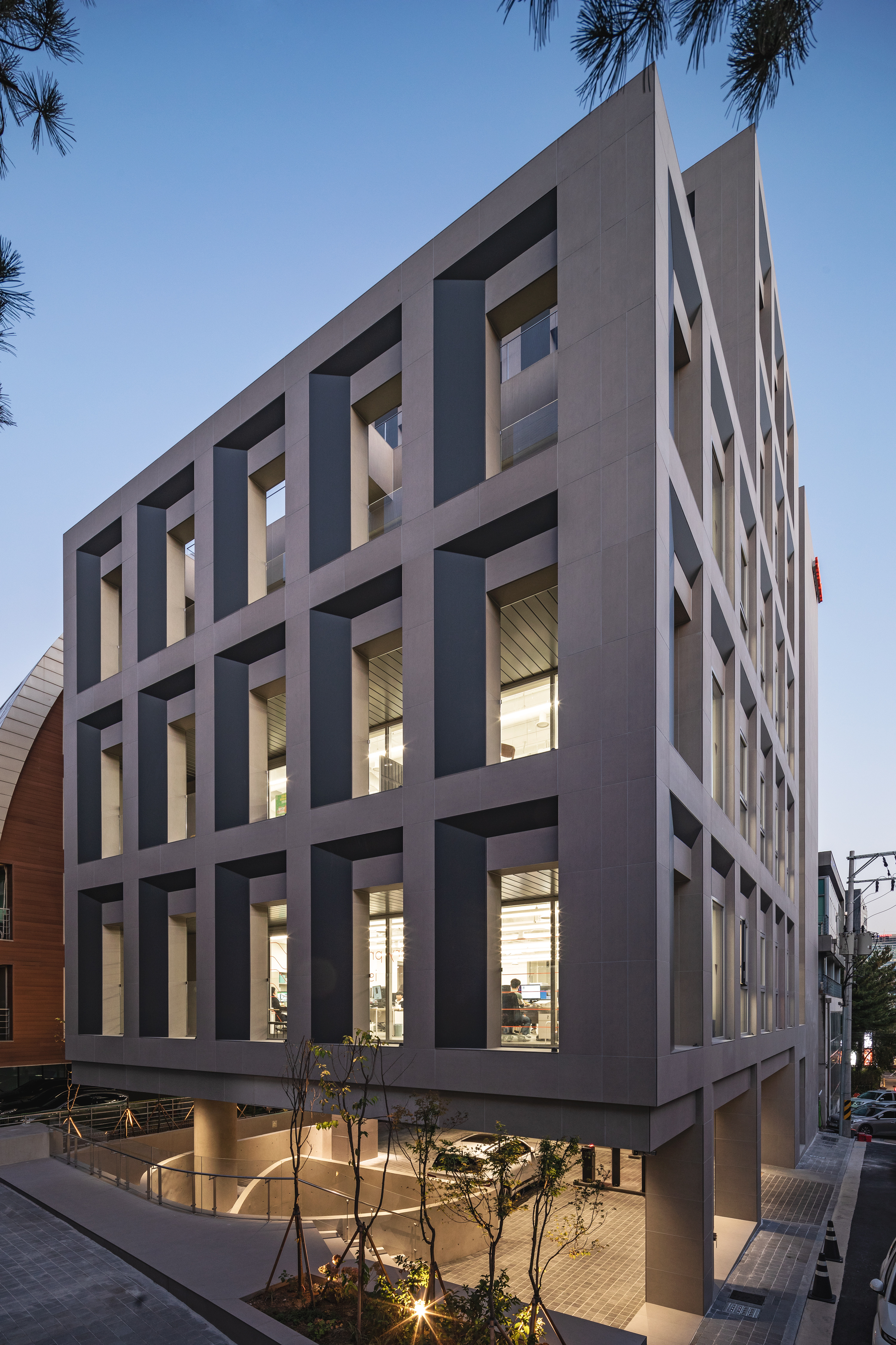 입면은 건축주가 기획, 운영하였던 복합문화공간인 ‘나오스노바(Naos Nova)’ 프로젝트에서 모티브를 얻었다. 외관은 ‘새로운 신전’이라는 의미를 지닌 나오스노바의 반복되는 열주와 코니스(Cornice)에서 착안하였다. 무게감이 느껴지는 석재, 노출 콘크리트의 면, 빛과 그림자 그리고 반복되는 창이 하나의 유닛이 되고, 그것을 반복시킨 파사드는 신전과 같은 형상이다.