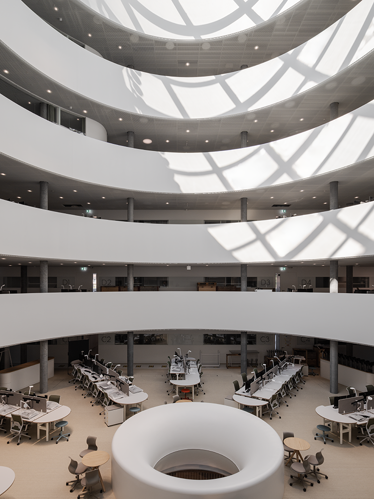 연구 및 교육 시설은 북쪽에 위치한 흰색 원통형 건물로, 중심에 개방된 5층 높이의 아트리움이 있습니다. 연구 분야는 이 공간의 중심을 둘러싸도록 배열되었습니다. 경사진 지형의 형태에 따라 세 개의 강의실과 이를 둘러싼 세미나실 및 학생들을 위한 학습 공간이 아래에 배치되어 있습니다.