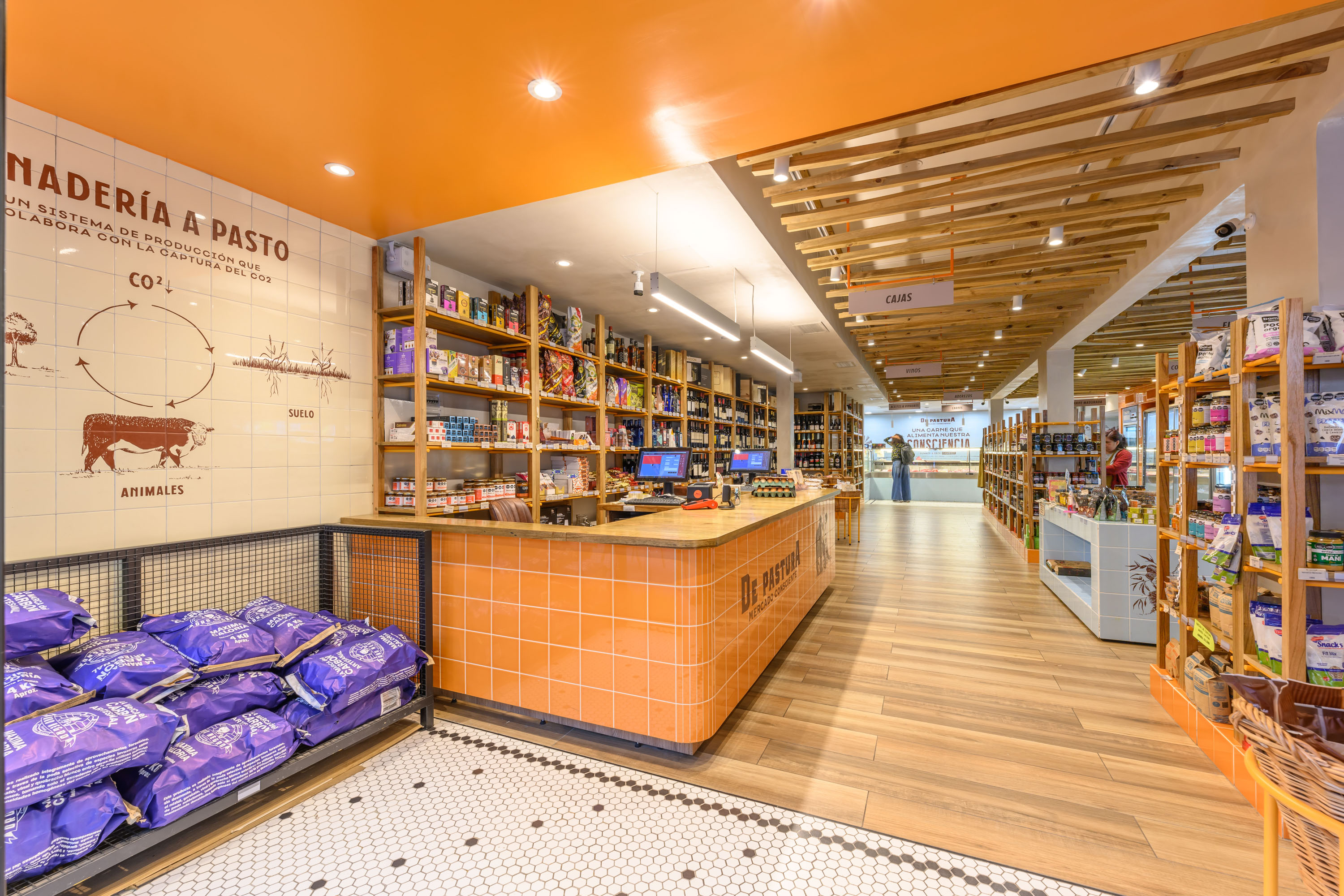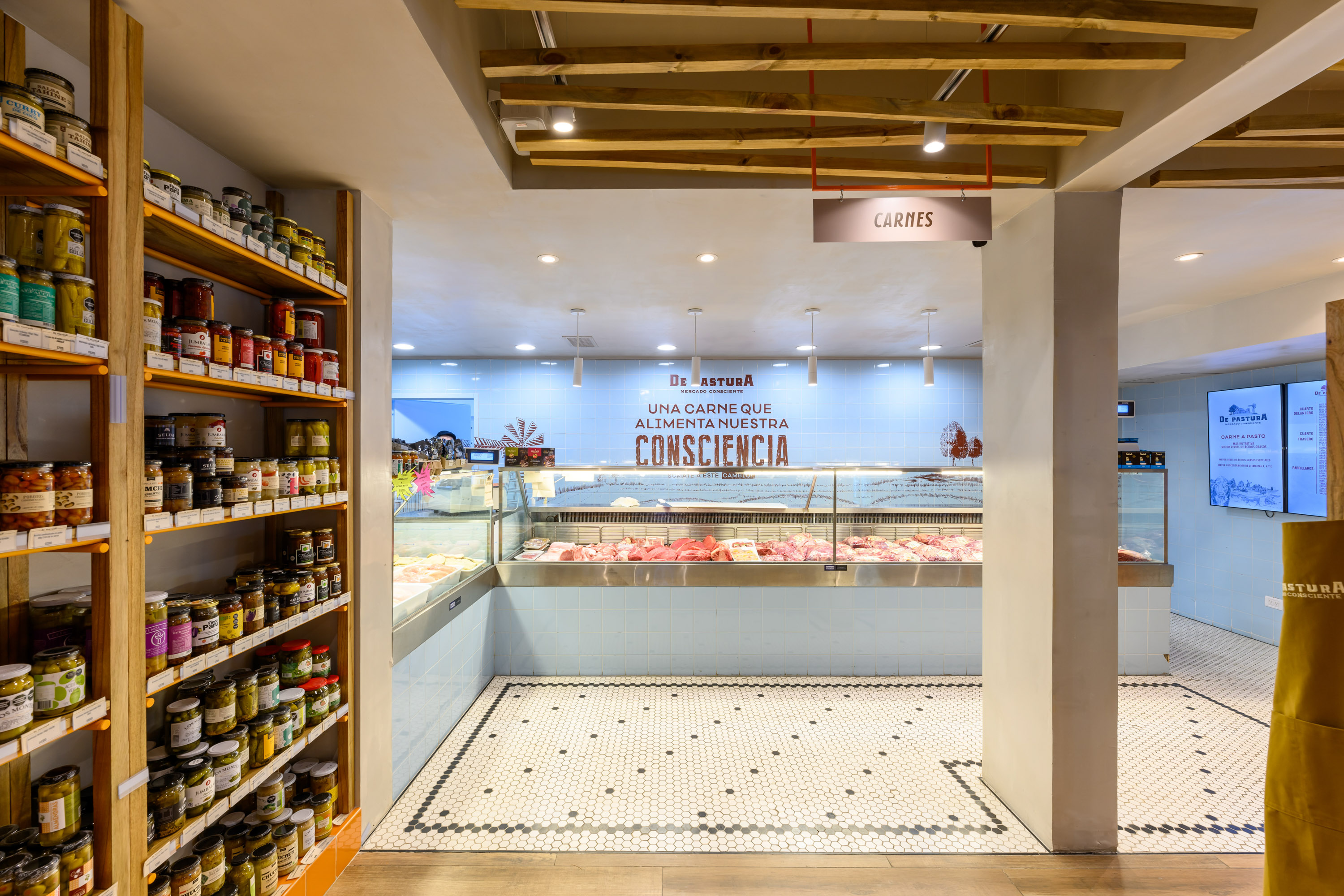 De Pastura는 풀밭에서 기른 소의 고기와 고급 식료품을 판매하는 마켓이다. 이 매장은 브랜드의 철학을 따뜻함과 신선함과 같은 감각을 통해 전달하고자 했다. 자연과 연결된 소재들이 사용되었고, 질감들이 조화를 이루며 대비를 만들었다.