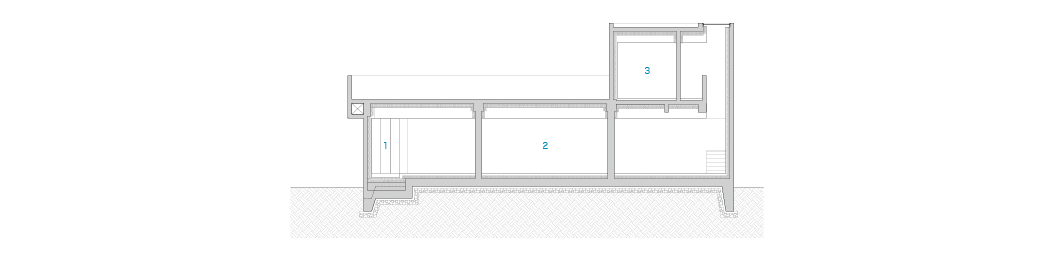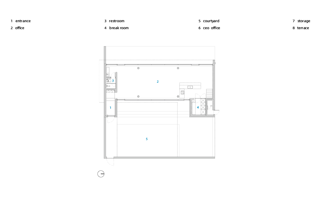 1층의 사무실은 기둥을 제외하면 고정된 구조 요소 없이 열려 있어 다양한 활동이 가능하다. 동, 서측 전면의 창호는 내외부 공간을 연결하고 실내 공간과 자연의 경계를 흐리게 하여 자연 경관을 담아내는 캔버스가 된다. 동측의 노출 콘크리트 담장 안에 아늑하게 둘러싸인 정원이 있어 사무실에서 잠시 자연을 바라보며 쉴 수 있다.