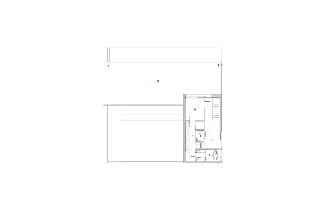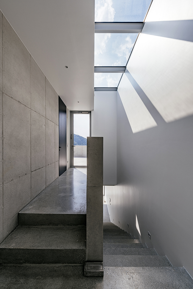 콘크리트 계단을 오르면 천창을 통해 스며드는 빛을 마주할 수 있다. 이 계단과 난간 위에 내려앉은 빛은 공간을 따뜻하게 만들며 고요하고 평온한 분위기를 연출한다. 이러한 공간의 분위기 전환을 경험하며 2층으로 올라가면 건축주가 사적으로 이용할 수 있는 사무 공간이 마련되어 있다.