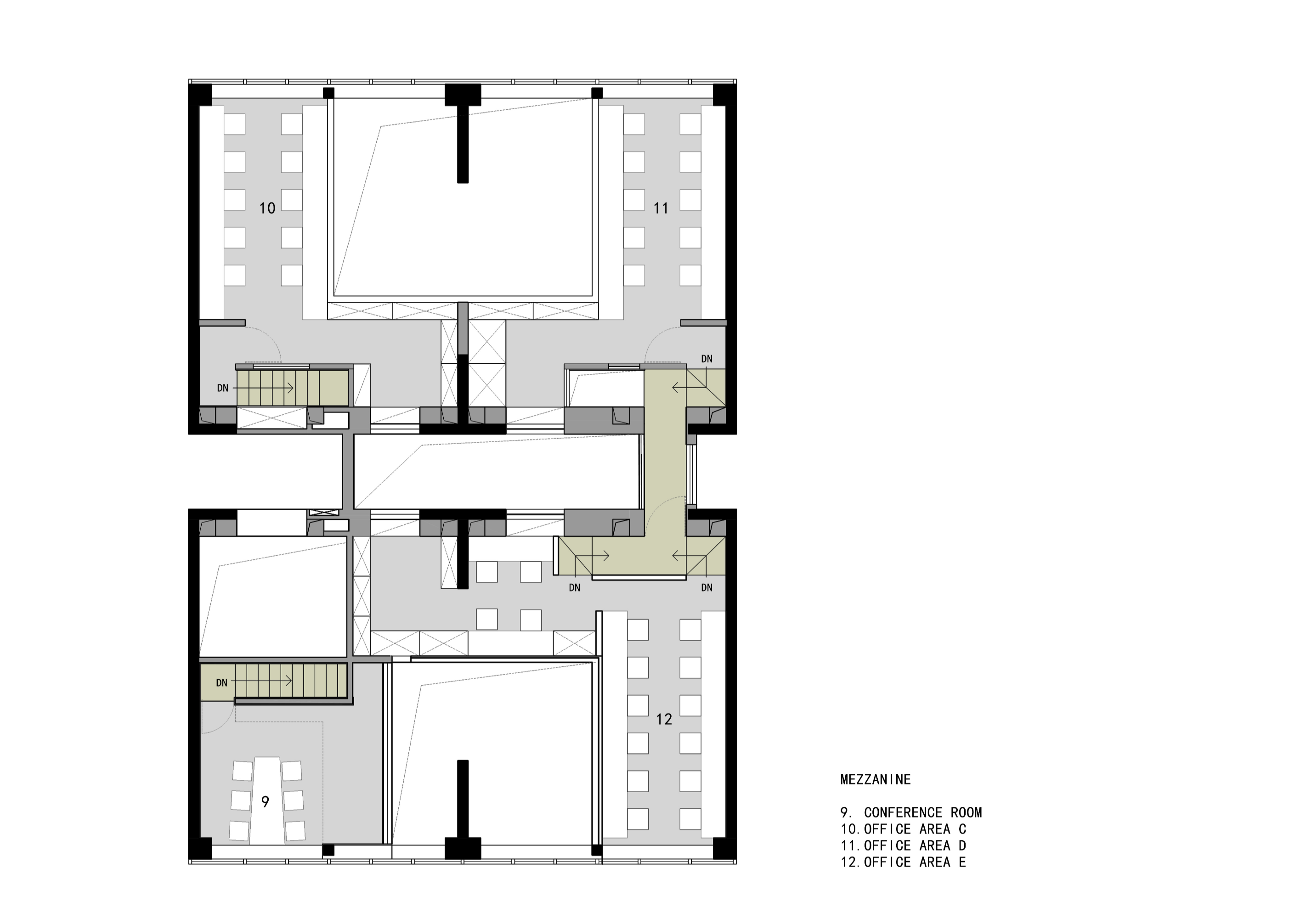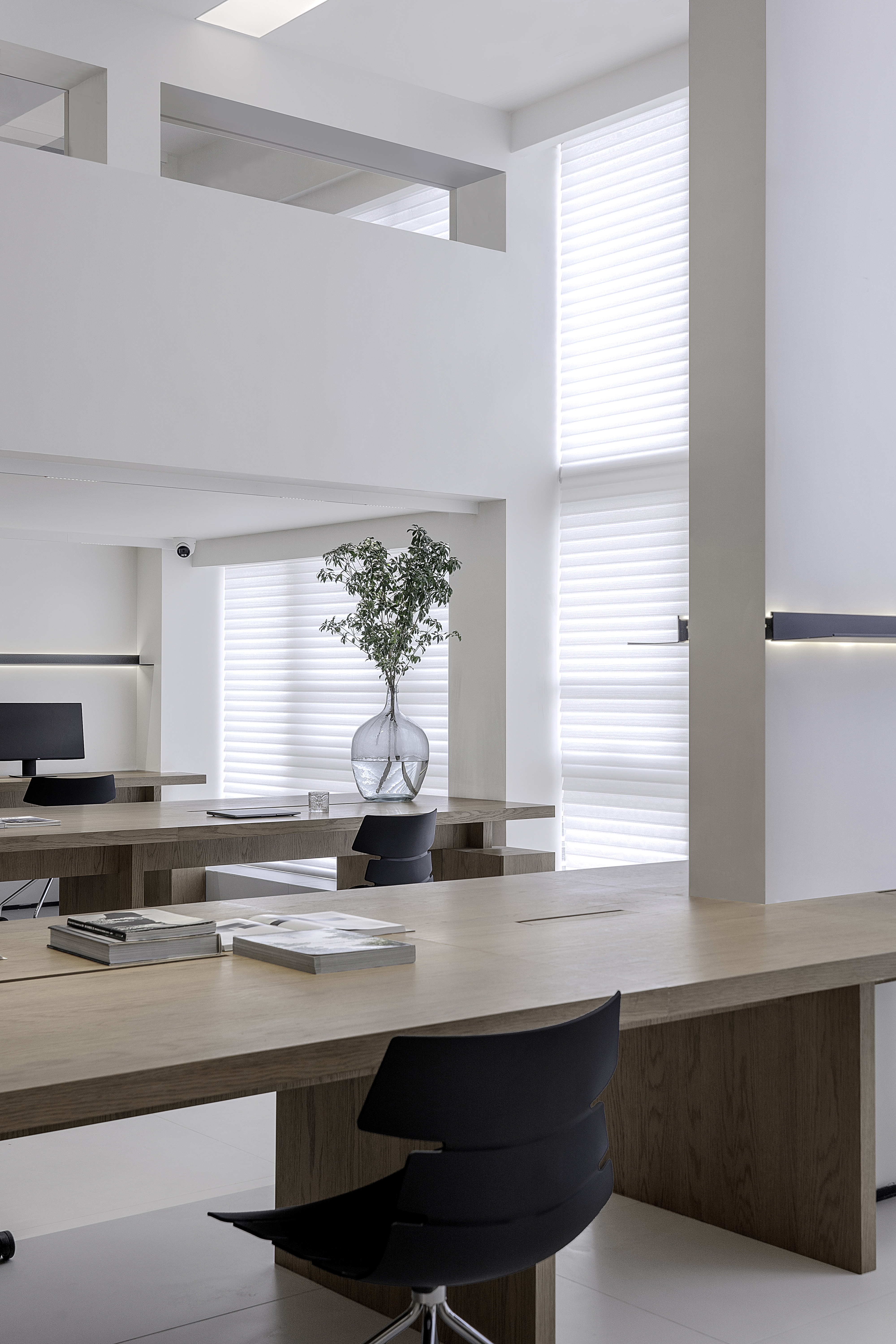 4.28m의 천장 높이를 활용하여 중층을 만들고, 수직 동선을 전략적으로 배치하여 2개 층에 있는 서로 다른 4개의 ‘집’을 연결했다. 이러한 배치는 사용 가능한 공간을 확보하는 것과 동시에 단조로운 공간의 흐름을 깨고 개방적이고 상호 작용이 가능한 기능적인 업무 공간을 제공한다. 1층은 중앙 구역을 중심으로 동선이 순환하며, 벽의 개구부를 통해 두 개의 복도가 서로 연결된다. 중앙 구역의 끝에 위치한 세 개의 계단은 1층과 2층을 연결하며 유동적인 3차원 허브를 만든다.