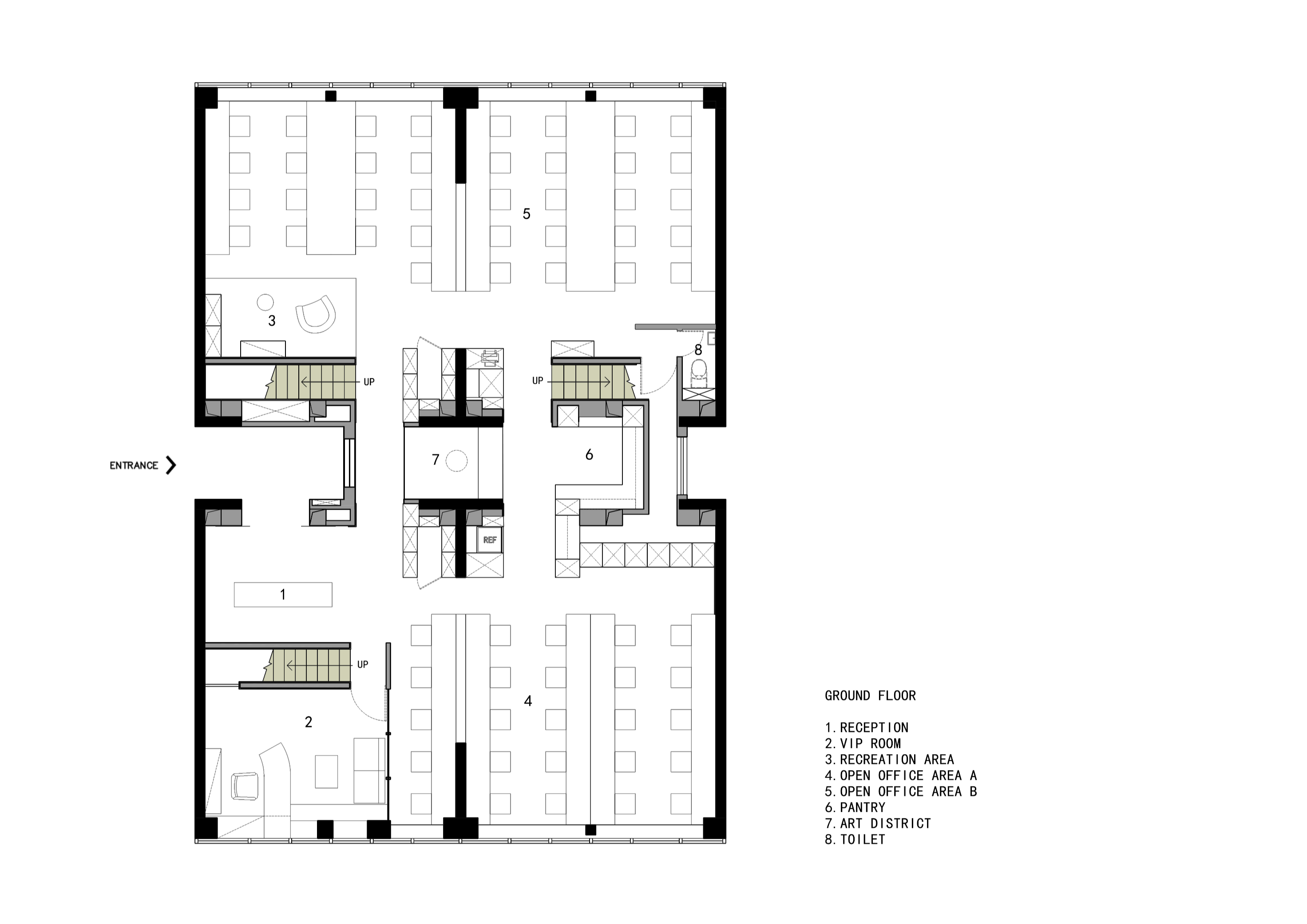 4.28m의 천장 높이를 활용하여 중층을 만들고, 수직 동선을 전략적으로 배치하여 2개 층에 있는 서로 다른 4개의 ‘집’을 연결했다. 이러한 배치는 사용 가능한 공간을 확보하는 것과 동시에 단조로운 공간의 흐름을 깨고 개방적이고 상호 작용이 가능한 기능적인 업무 공간을 제공한다. 1층은 중앙 구역을 중심으로 동선이 순환하며, 벽의 개구부를 통해 두 개의 복도가 서로 연결된다. 중앙 구역의 끝에 위치한 세 개의 계단은 1층과 2층을 연결하며 유동적인 3차원 허브를 만든다.