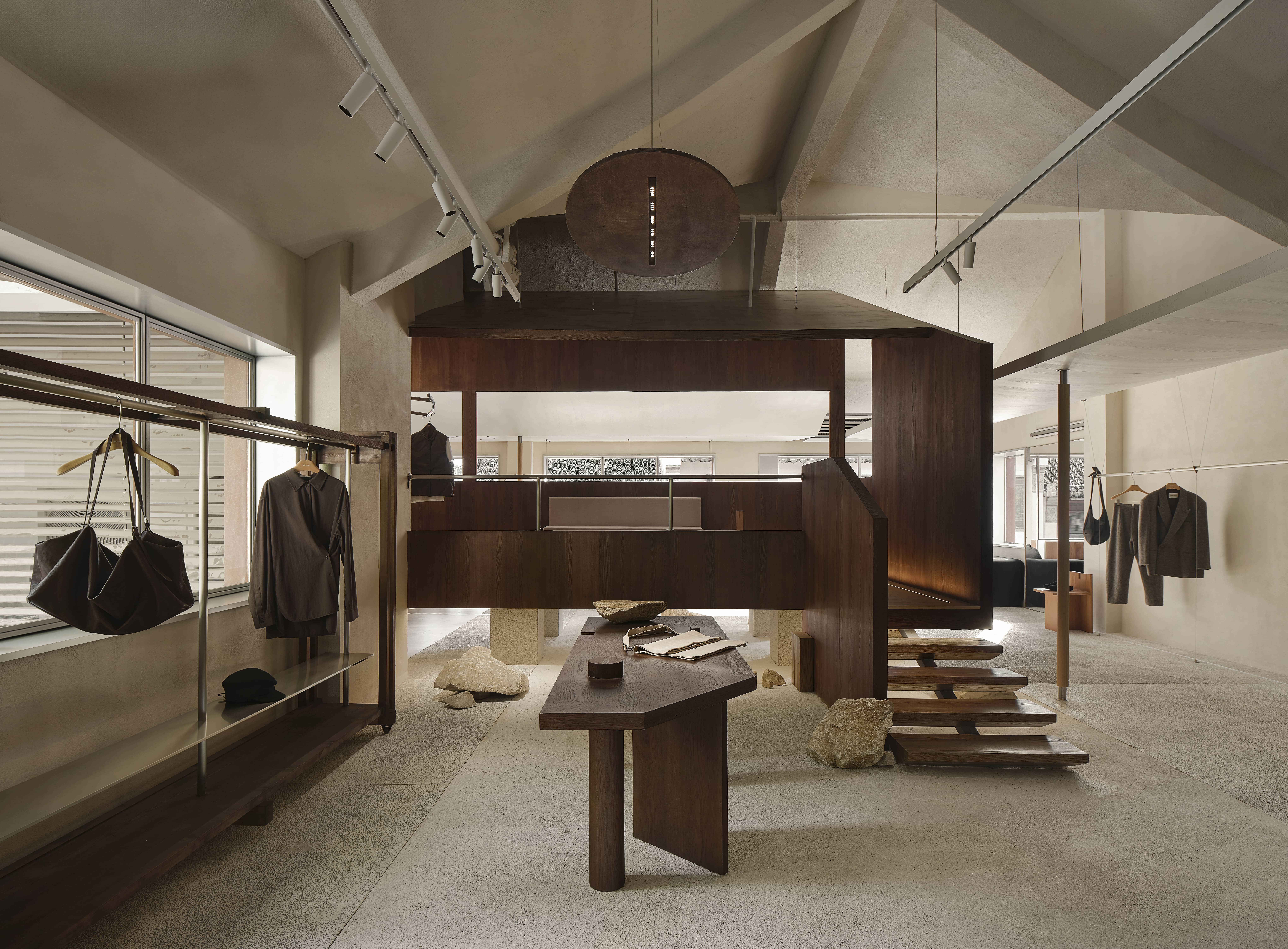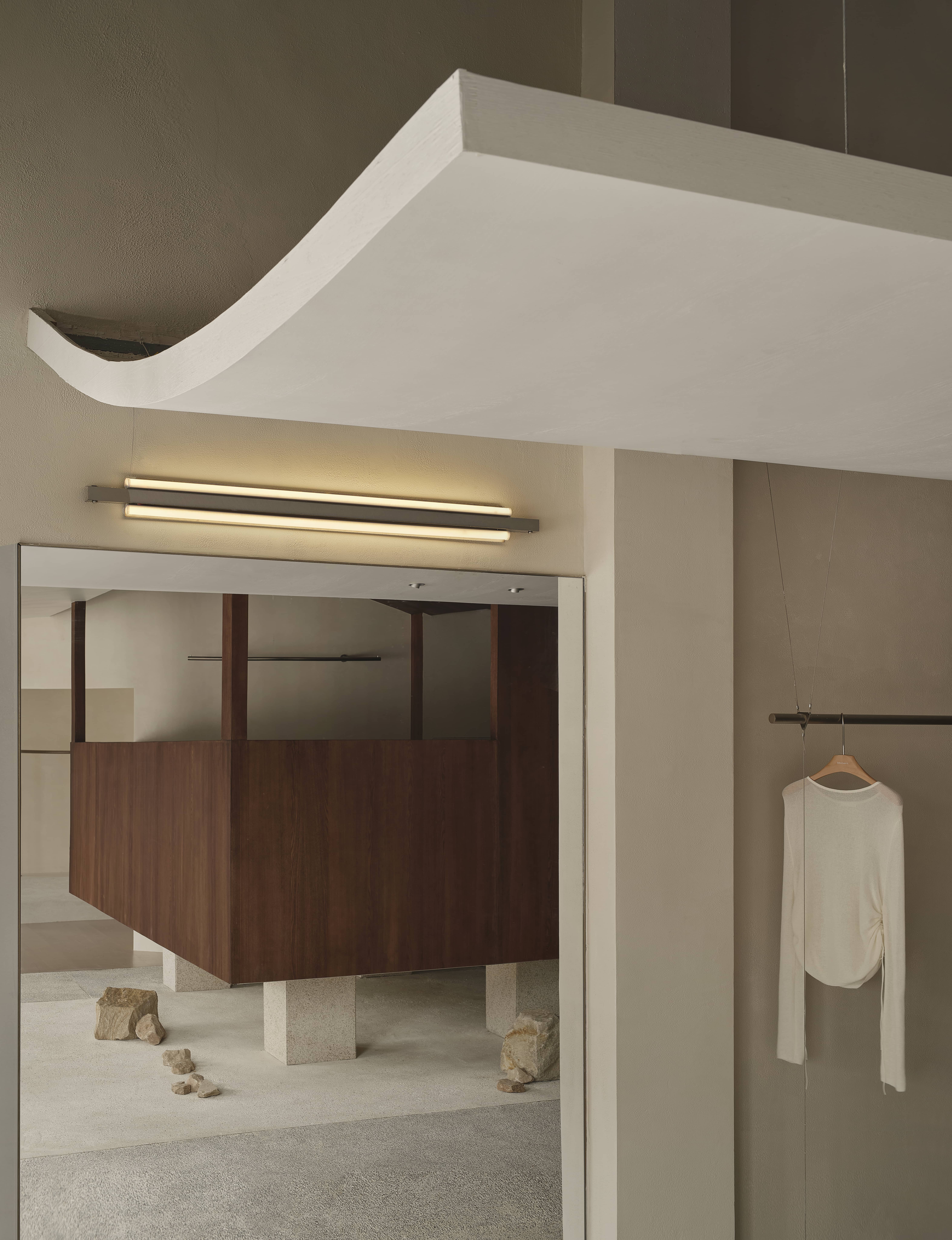 의류 디스플레이는 곡선 형태의 천장을 따라 흐르는 경로로 구성되어 있어, 이야기로 가득한 복도 같은 경험을 제공했다. 다양한 유형의 창문, 거울, 반사 표면은 고객들에게 시각적 경험을 제공했고, 마치 풍경화를 거니는 듯한 느낌을 주었다. 입구의 높은 세로 창문은 외부 풍경과 상호 작용하고, 창문을 통해 비치는 나뭇잎 그림자는 공간에 깊이감과 흥미를 더했다.