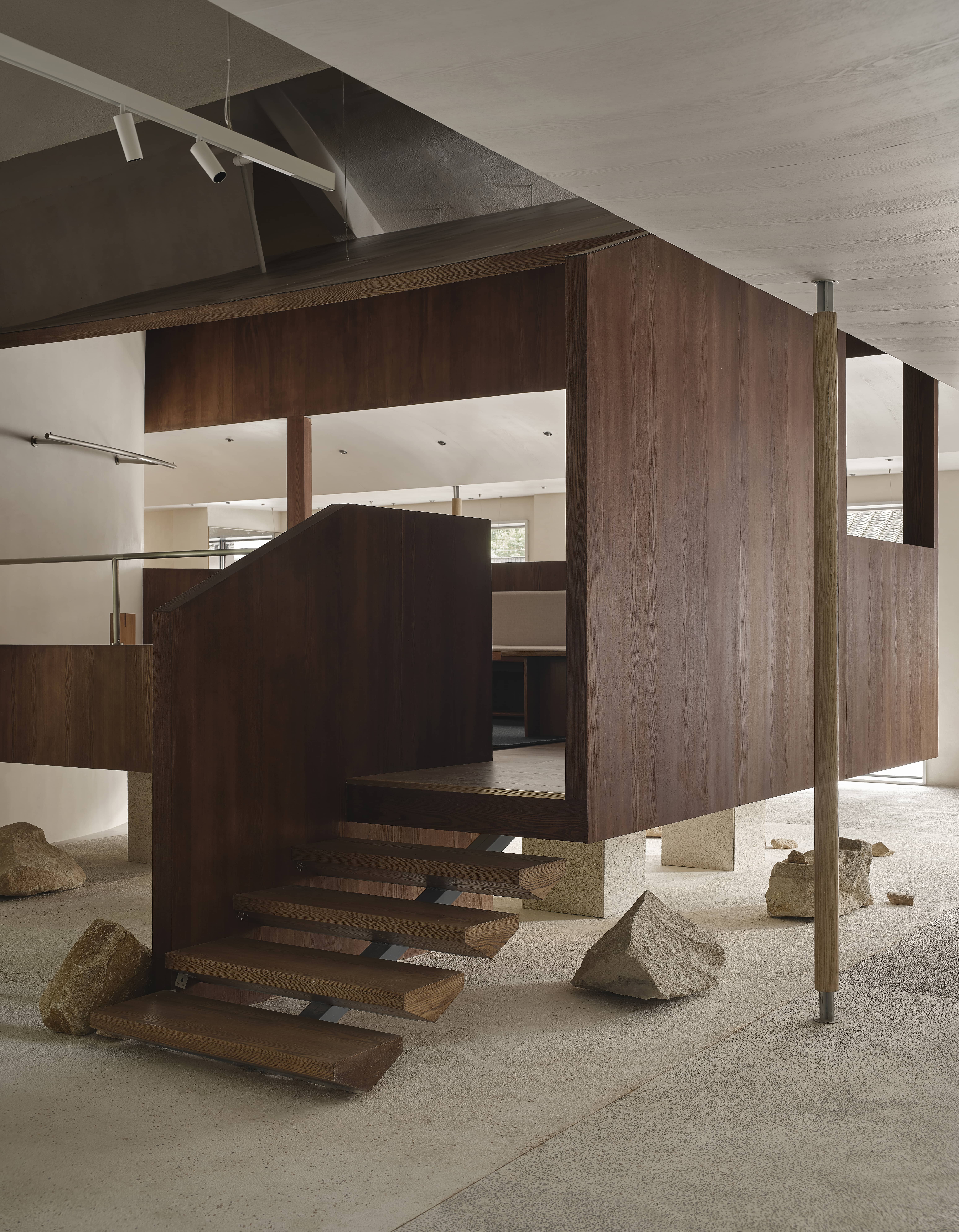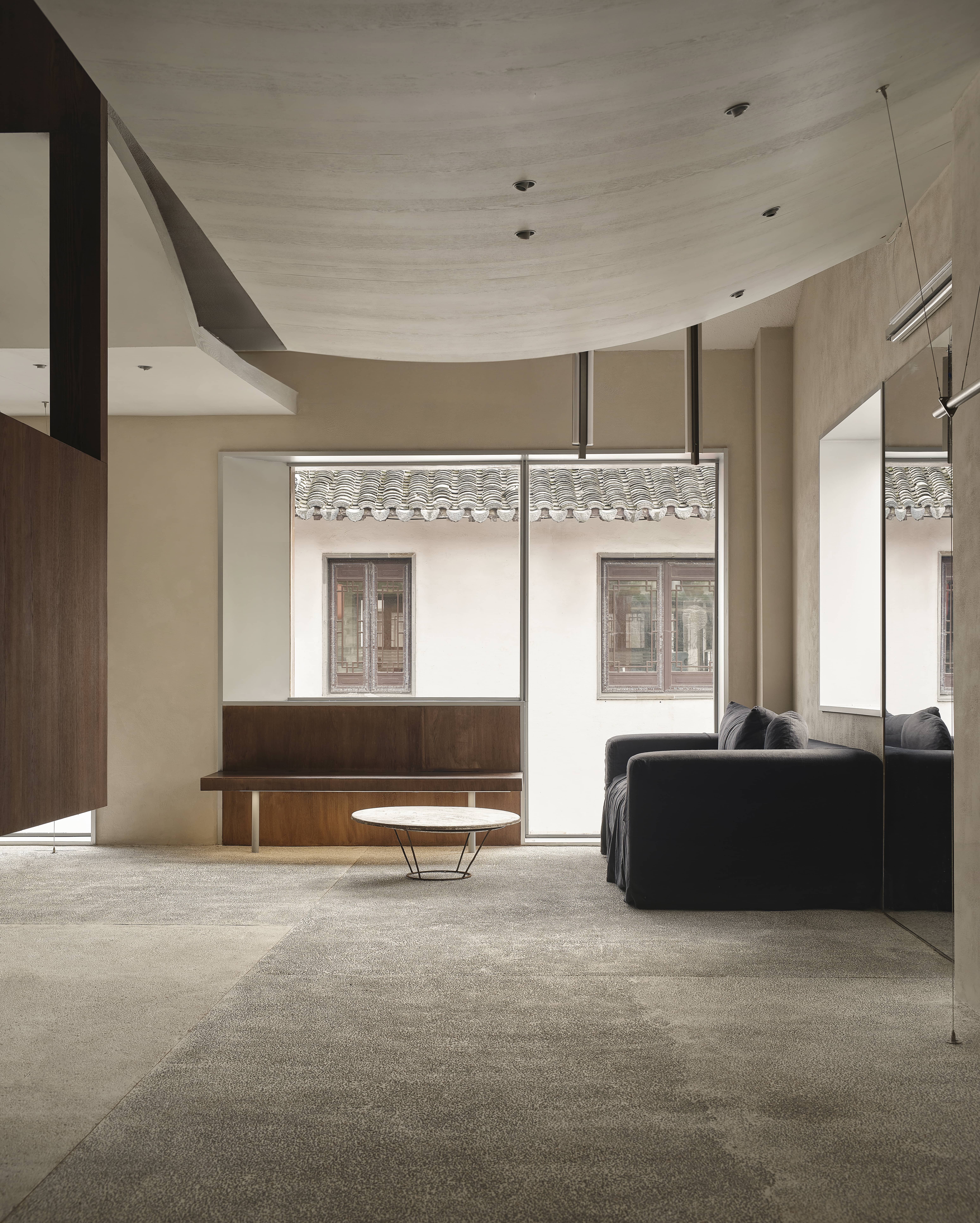 내부 디자인은 '정자'와 '복도'의 개념을 이어받아 휴식과 사교를 모두 수용할 수 있는 '거실' 공간을 창출했다. 목재 정자는 공간의 모퉁이에 배치되었고, 티룸처럼 설계된 개방 구조와 떠 있는 듯한 계단이 공간을 가볍고 예술적으로 보이게 했다. 석재 기반과 목재 구조의 대비는 공간을 한층 더 풍부하게 만들었다. 디자이너는 날카로운 모서리를 부드럽게 하기 위해 원형 요소를 추가했다.