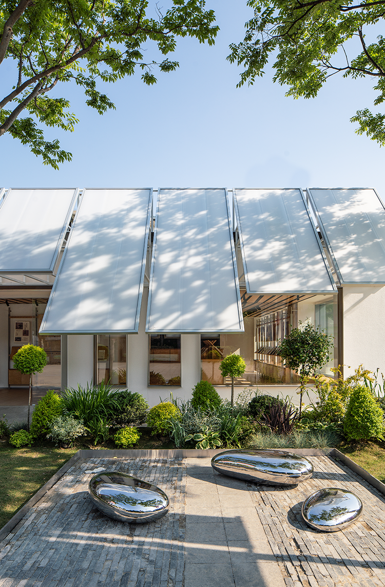 광장을 지역 사회의 거실처럼 상상하며, 방문자 서비스 센터의 외관과 일부 풍경이 방문자들과 상호작용할 수 있도록 했습니다. 기존 벽을 제거하고 다양한 길이와 높이의 11개 지붕을 설치하여, 방문자들이 휴식하고 휴식을 취할 수 있는 리드미컬한 천장을 만들었습니다.