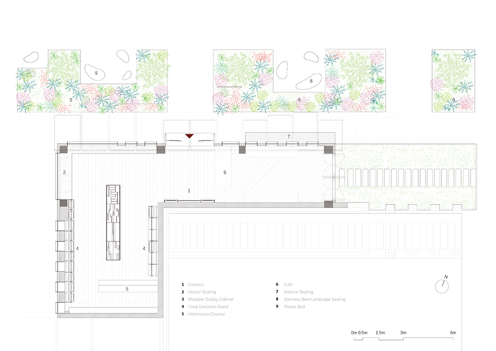 광장을 지역 사회의 거실처럼 상상하며, 방문자 서비스 센터의 외관과 일부 풍경이 방문자들과 상호작용할 수 있도록 했습니다. 기존 벽을 제거하고 다양한 길이와 높이의 11개 지붕을 설치하여, 방문자들이 휴식하고 휴식을 취할 수 있는 리드미컬한 천장을 만들었습니다.